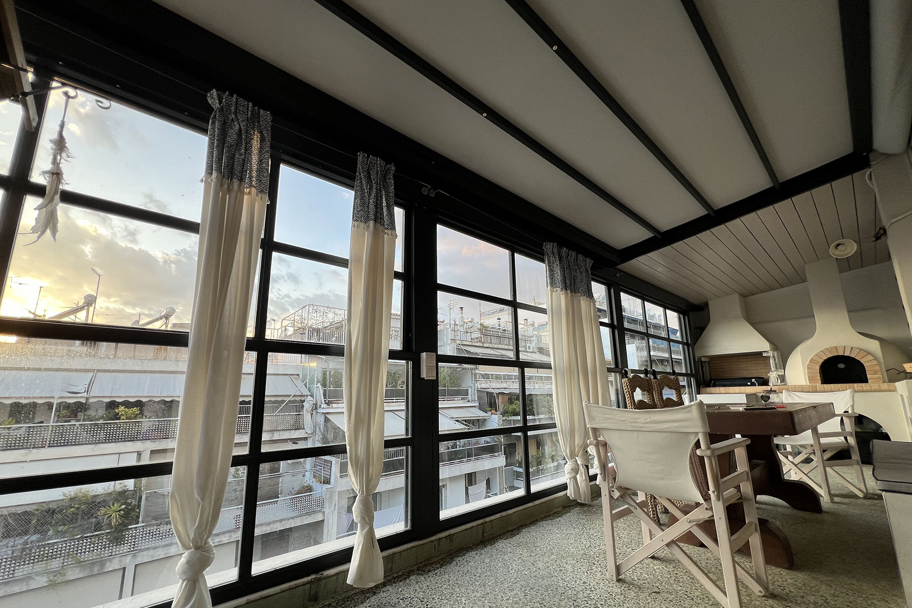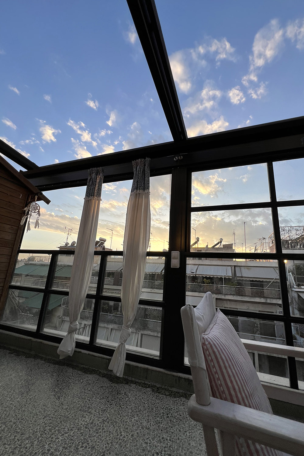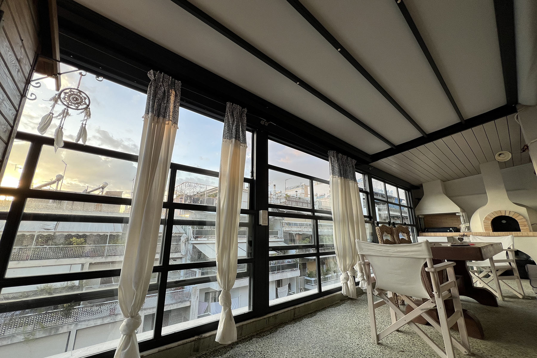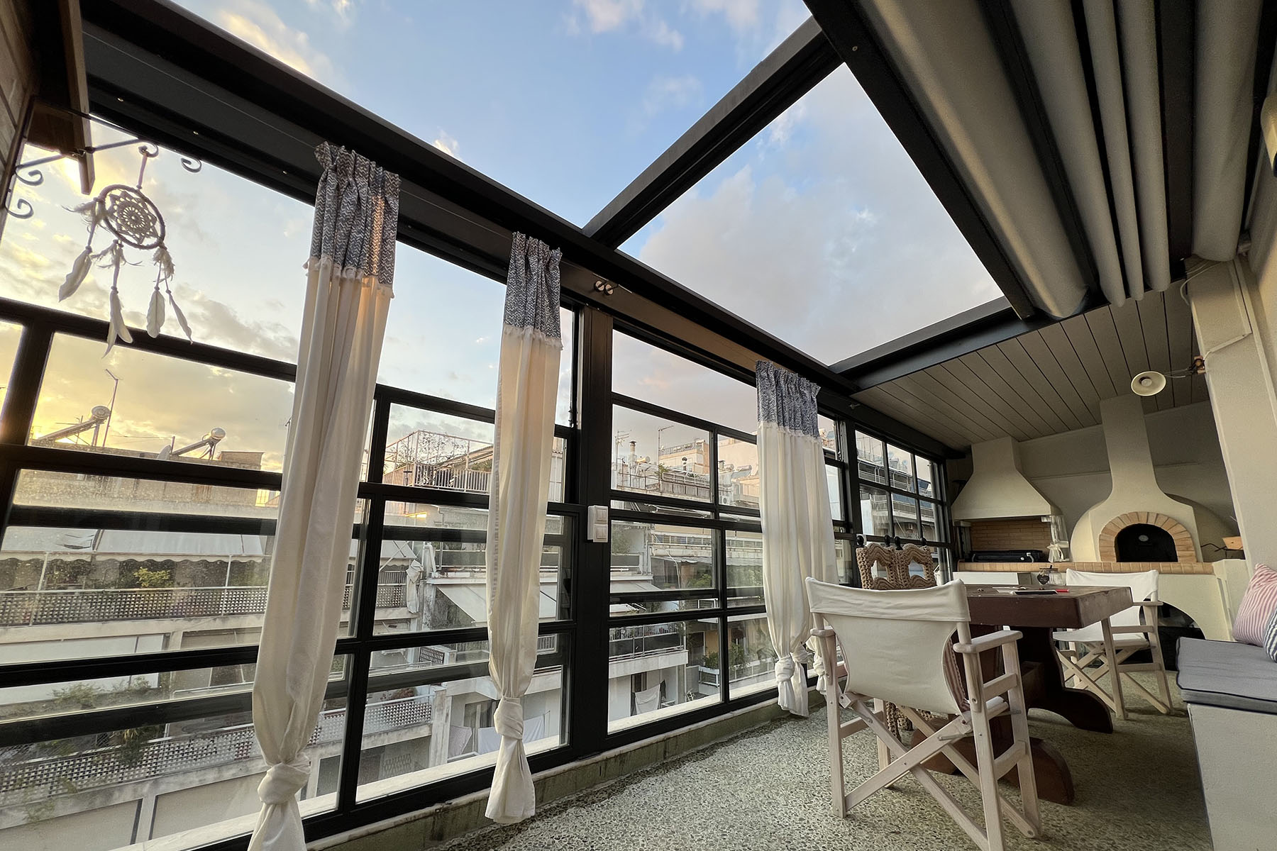 Διαμόρφωση βεράντας σε αστικό κέντρο, με κατασκευή μεικτής πέργκολας, κινούμενων υαλοπινάκων στα στηθαία και πλαϊνά διαχωριστικά, όλα ηλεκτροκίνητα. Η βεράντα αξιοποιήθηκε πλήρως με καλαισθητες κατασκευές ανοιγόμενες και ηλεκτροκίνητες, προσφέροντας προστασία από τις καιρικές συνθήκες της κάθε εποχής! Η πέργκολα έχει περγκοσύστημα στην οροφή της, ώστε να μπορείτε να απολαμβάνετε τον βραδινό καλοκαιρινό ουρανό, αλλά και να έχετε την προστασία που χρειάζεστε τους χειμερινούς μήνες, ενώ τα κινούμενα γυαλιά (καρμανιόλες) που βρίσκονται στα στηθαία, έχει κι αυτά διτό ρόλο, μιας και σφραγίζουν το χώρο τον χειμώνα, προστατεύοντας τους χρήστες ως γυάλινο κάγκελο όλο το χρόνο.