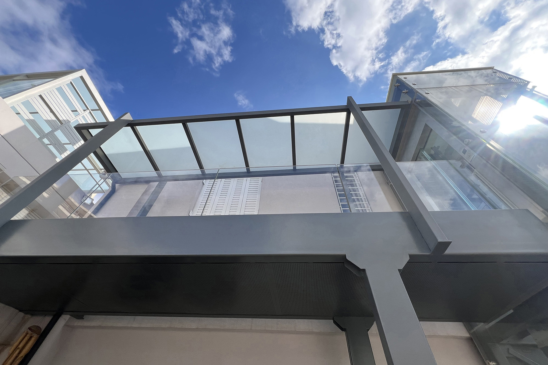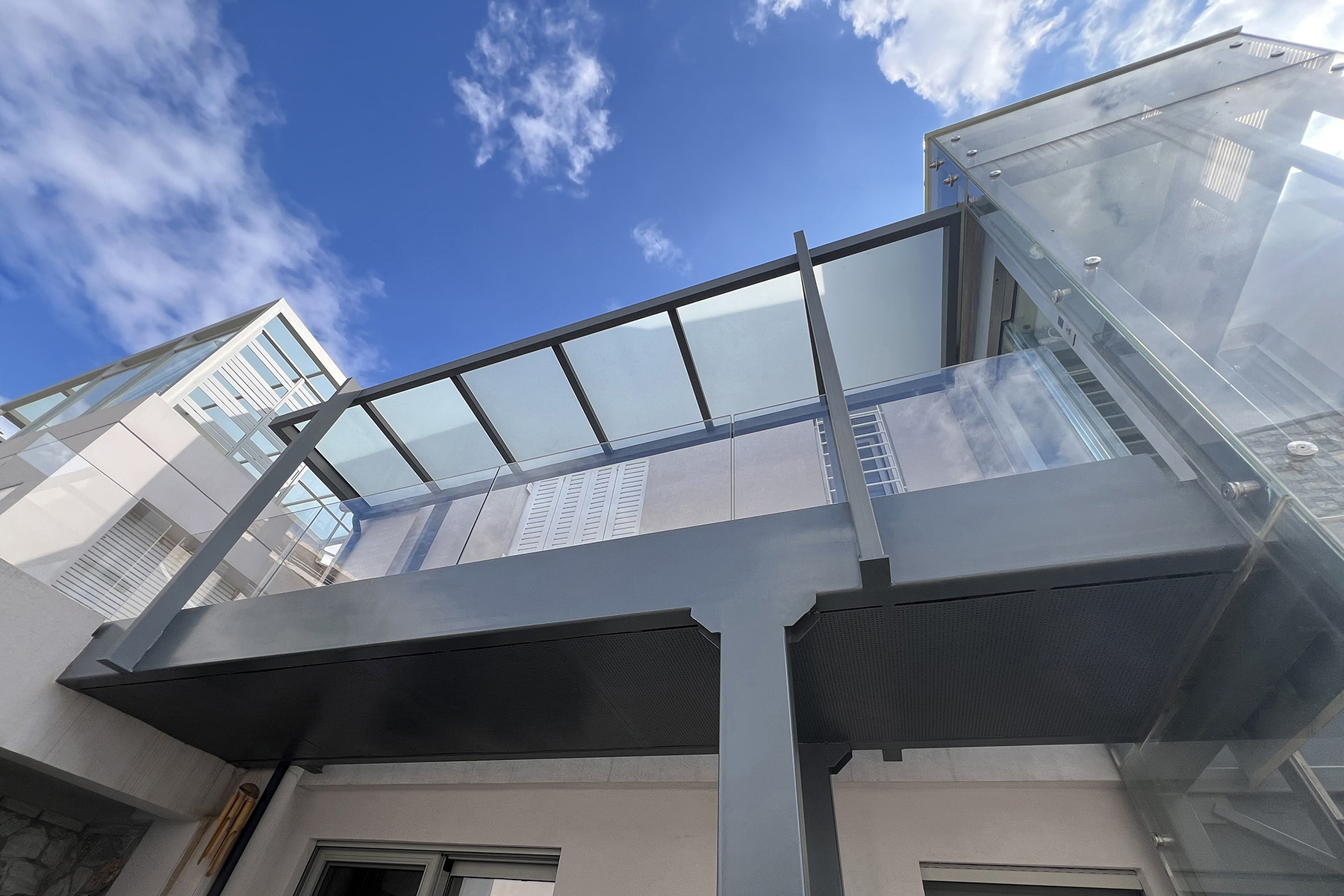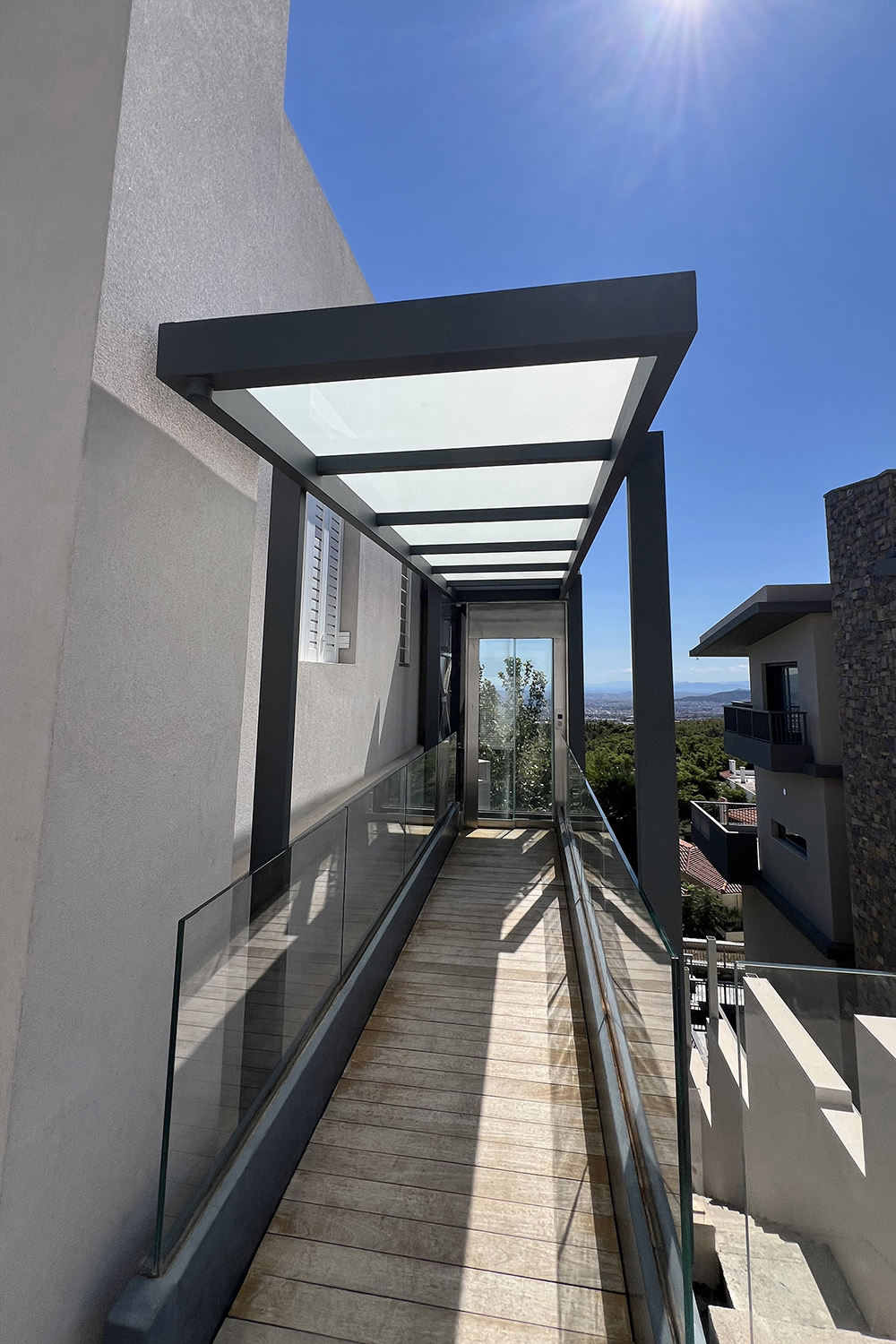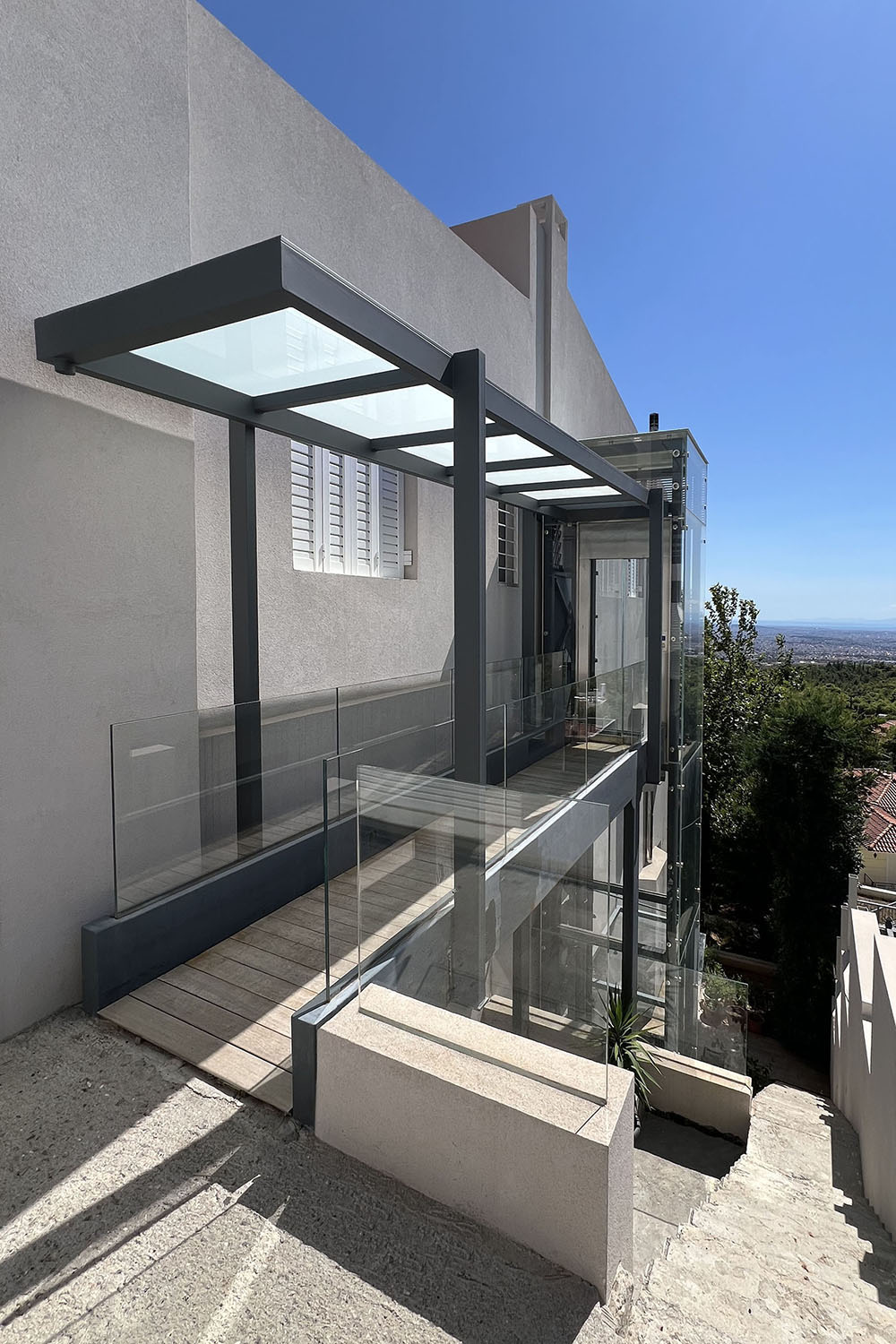 Στέγαστρο εξωτερικού ανελκυστήρα σε μονοκατοικία, με μεταλλικές γαλβανισμένες κοιλοδοκούς και κάλυψη με γυαλί τρίπλεξ ματ