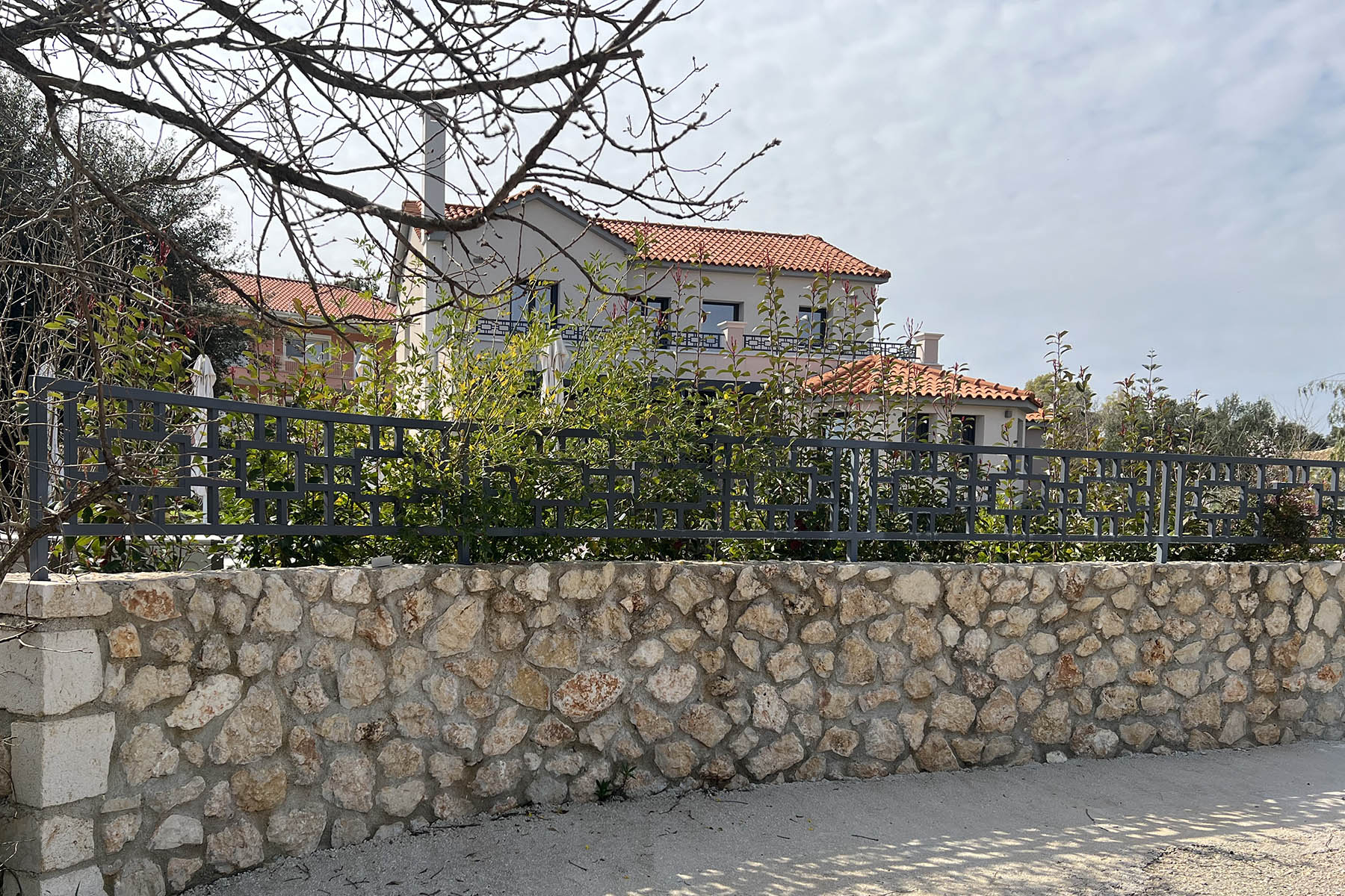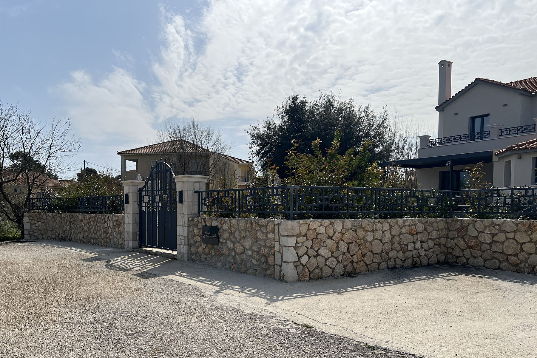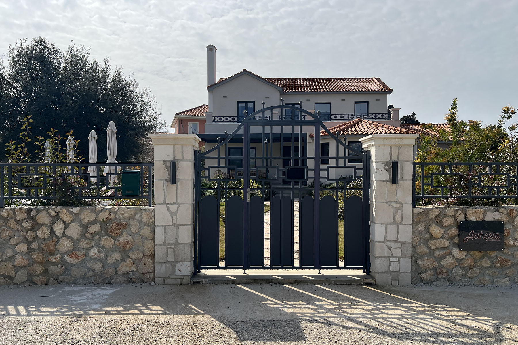 Κάγκελα περίφραξης μεταλλικά γαλβανισμένα και αυλόπορτα σε ιδιαίτερο σχέδιο ώστε να υπάρχει αισθητική ακολουθία με τα κάγκελα των μπαλκονιών