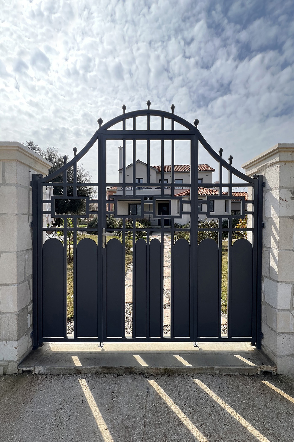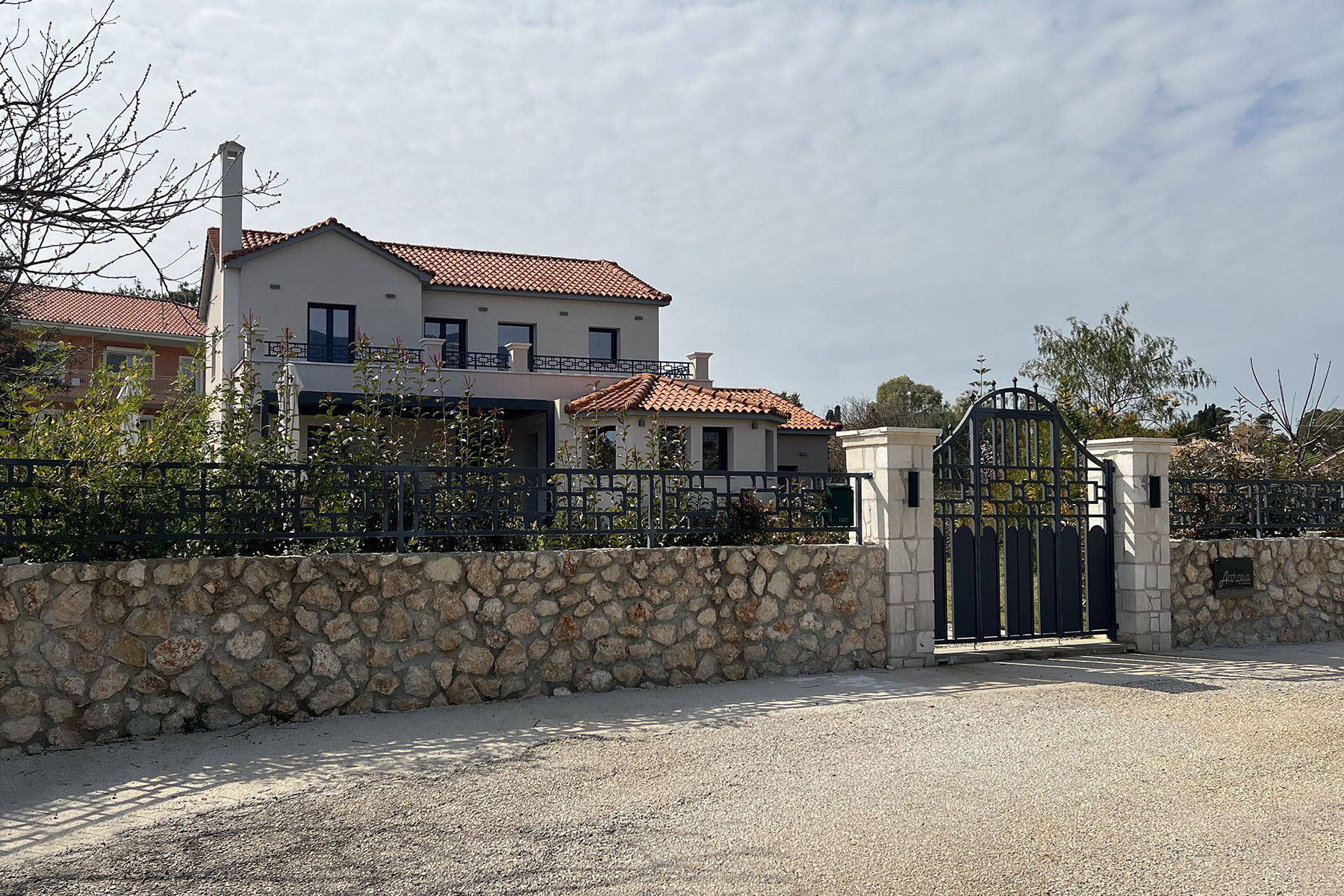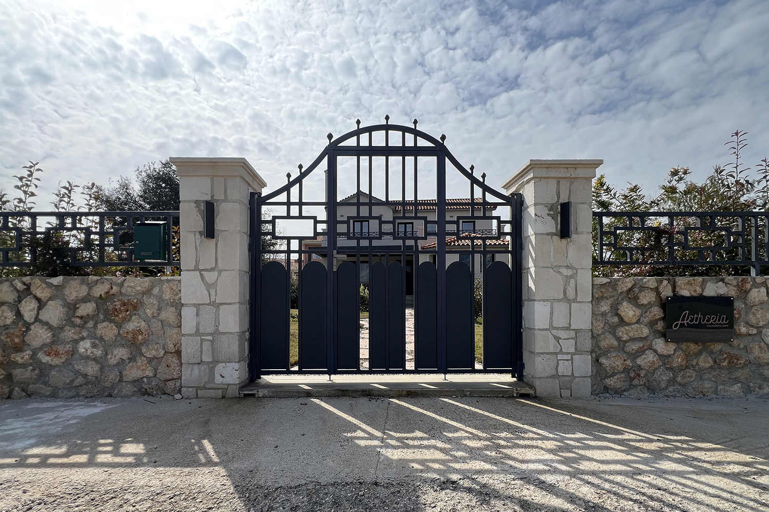 Κάγκελα περίφραξης μεταλλικά γαλβανισμένα και αυλόπορτα σε ιδιαίτερο σχέδιο ώστε να υπάρχει αισθητική ακολουθία με τα κάγκελα των μπαλκονιών