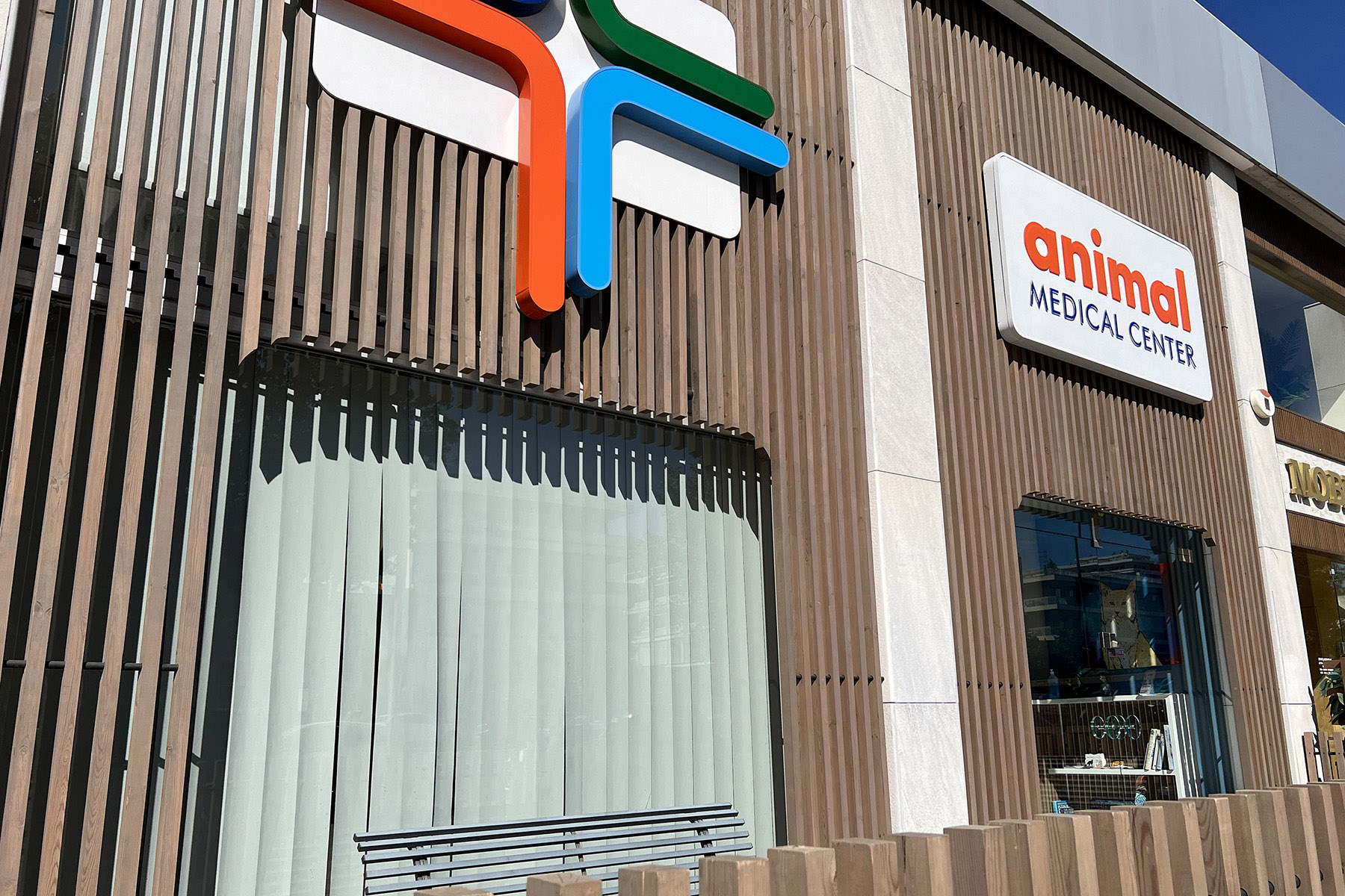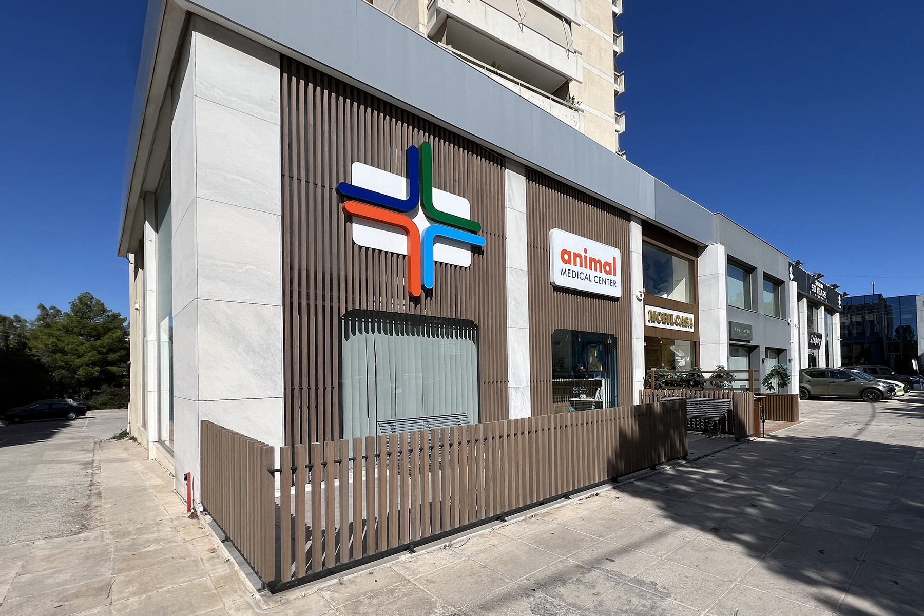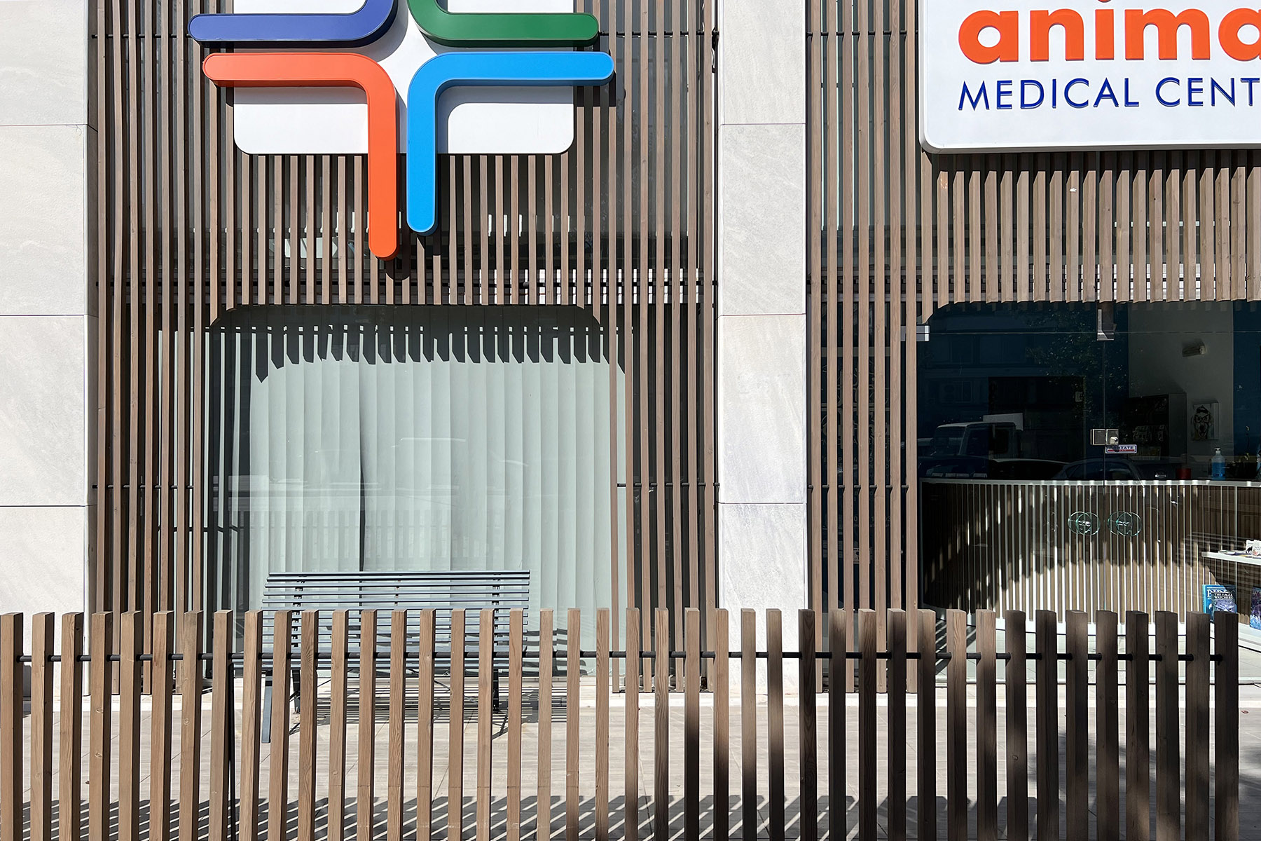 Επένδυση πρόσοψης Κτηνιατρείου και οριοθέτηση εξωτερικού χώρου στο Νέο Ψυχικό, με κάθετα στοιχεία από ξυλεία πεύκης α’ ποιότητας, για ένα φυσικό και γήινο αποτέλεσμα που αποπνέει ζεστασιά
