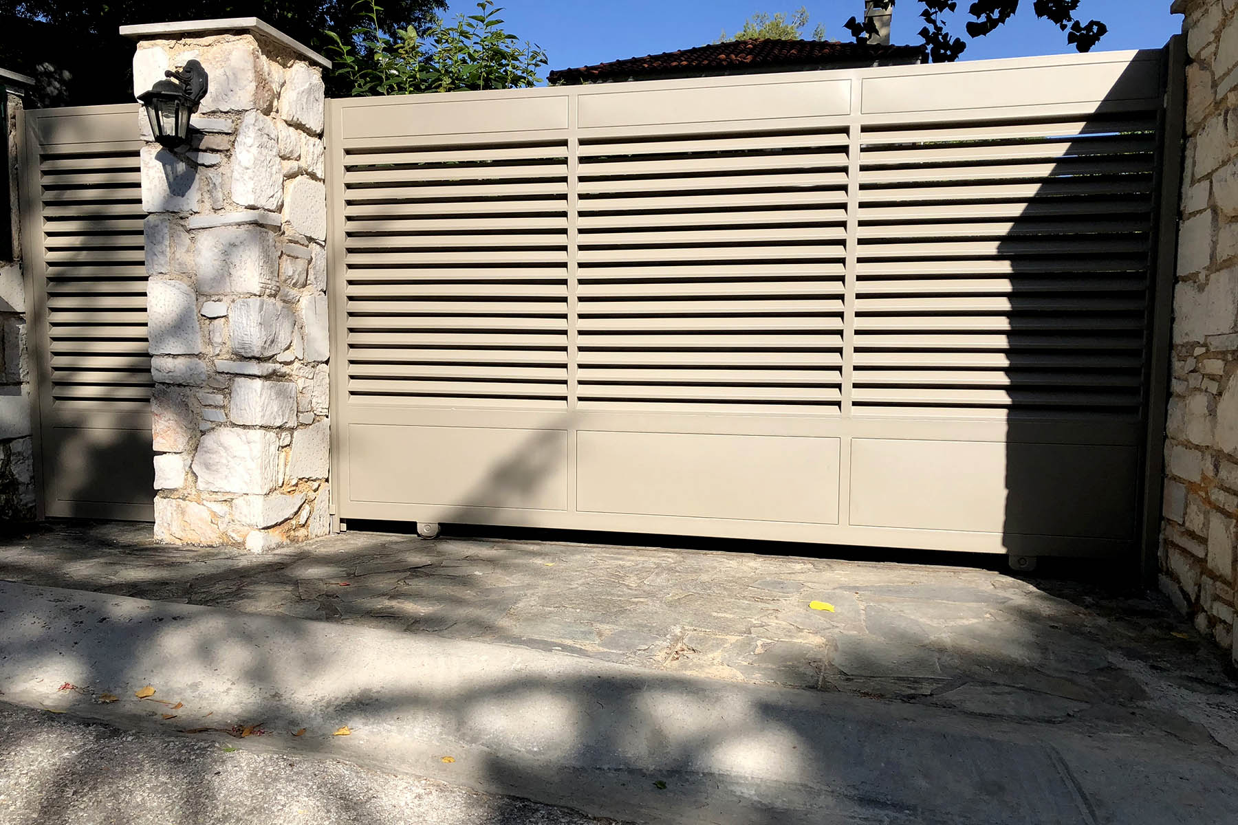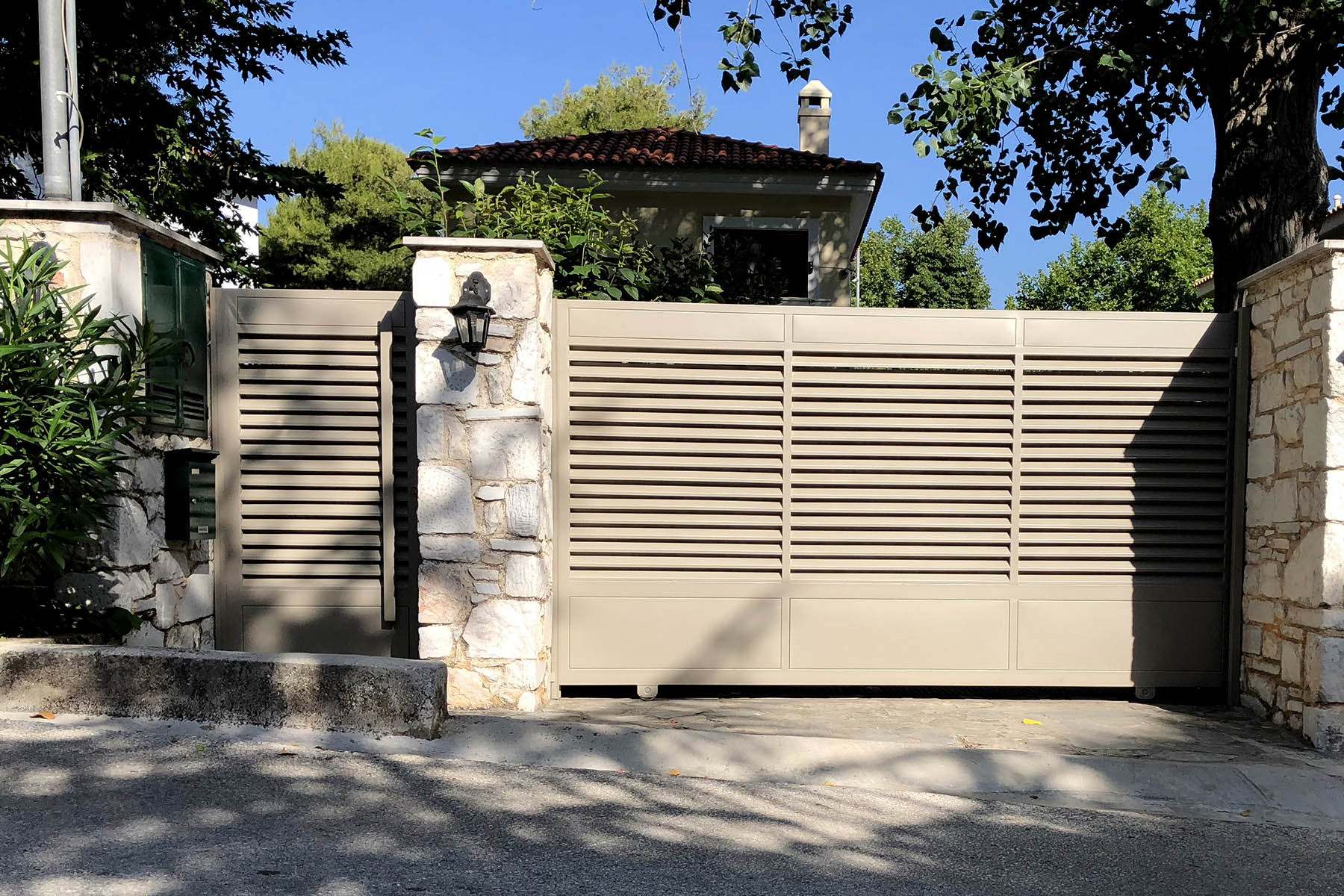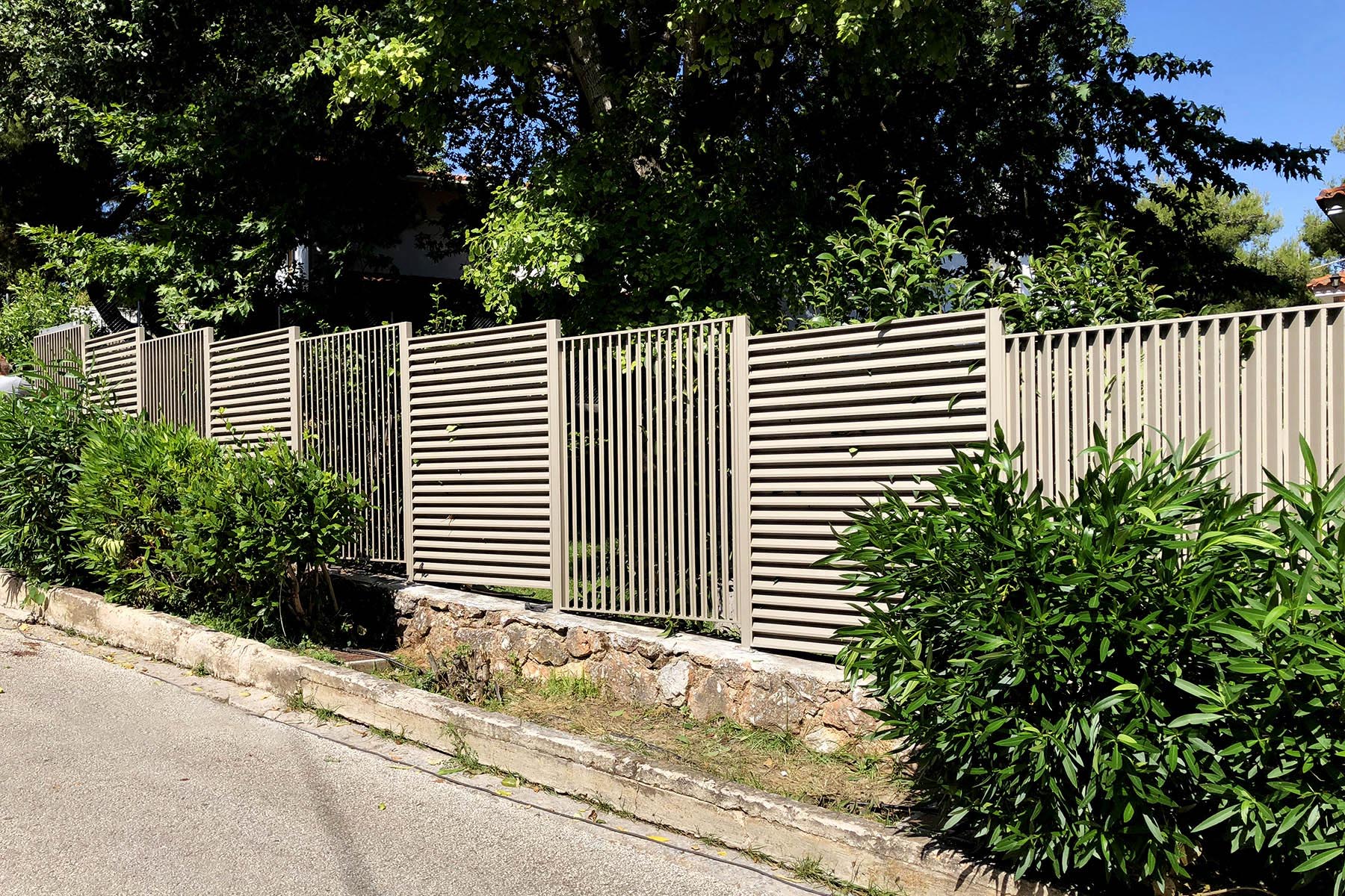 Περίφραξη ,αυλόπορτα και συρόμενη γκαραζόπορτα με περσίδες, από διαμορφωμένη γαλβανισμένη λαμαρίνα με ηλεκτροστατική βαφή.