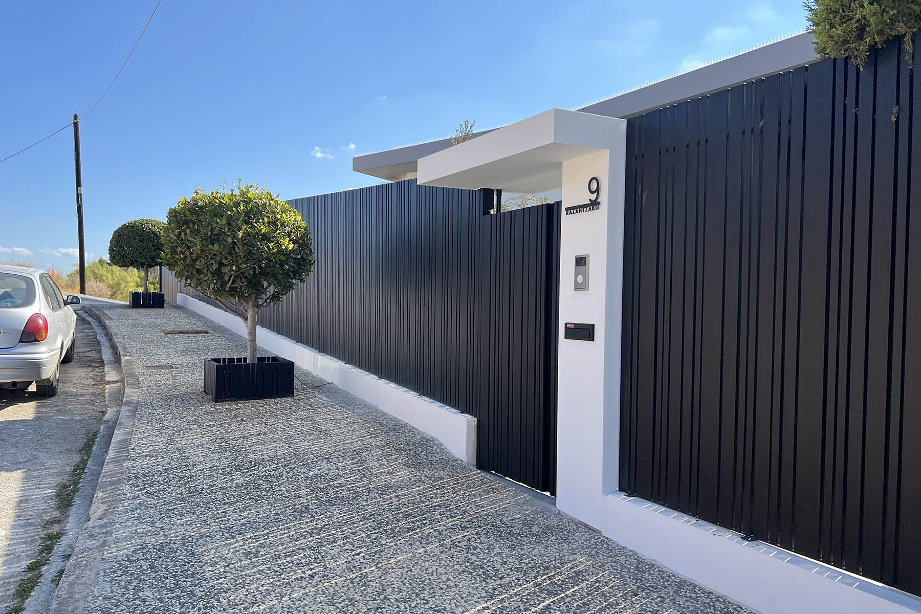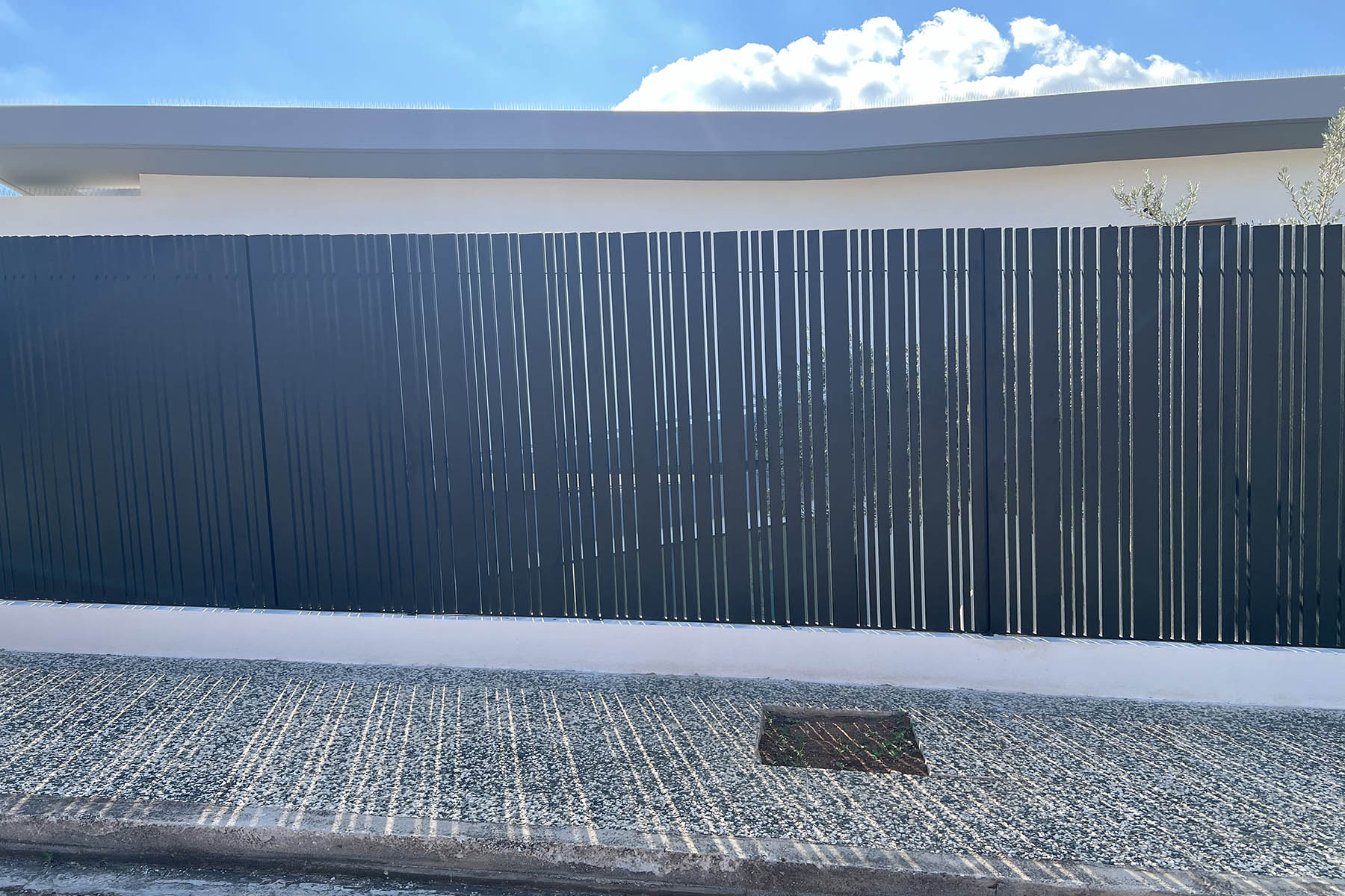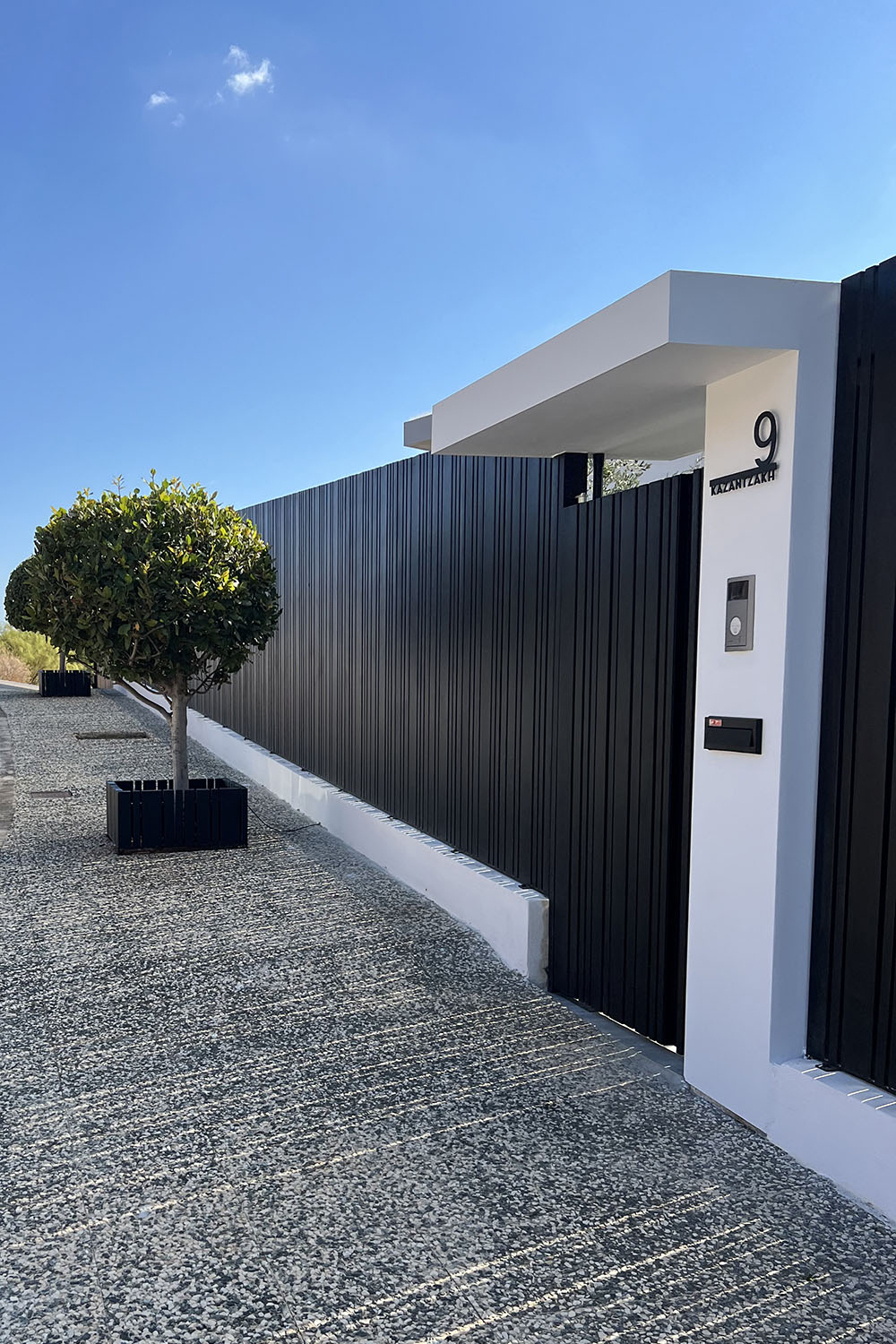 Περίφραξη και πόρτες σε περιβάλλοντα χώρο μοντέρνου κτιρίου, μεταλλικά με ηλεκτροστατική βαφή super durable, ιδιαίτερης αισθητικής σε κάθετη διάταξη. Στην αυλόπορτα δημιουργήθηκε πορτοσιά και, με έμφαση παντα στη λεπτομέρια, κατασκευάσαμε την πινακίδα της οδού με laser κοπή και προστατευτικούς χαμηλούς φρακτες για τα δέντρα, σε βαφή ίδια με τις υπόλοιπες κατασκευές μας.