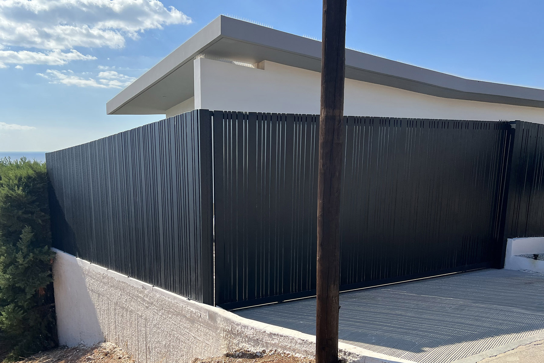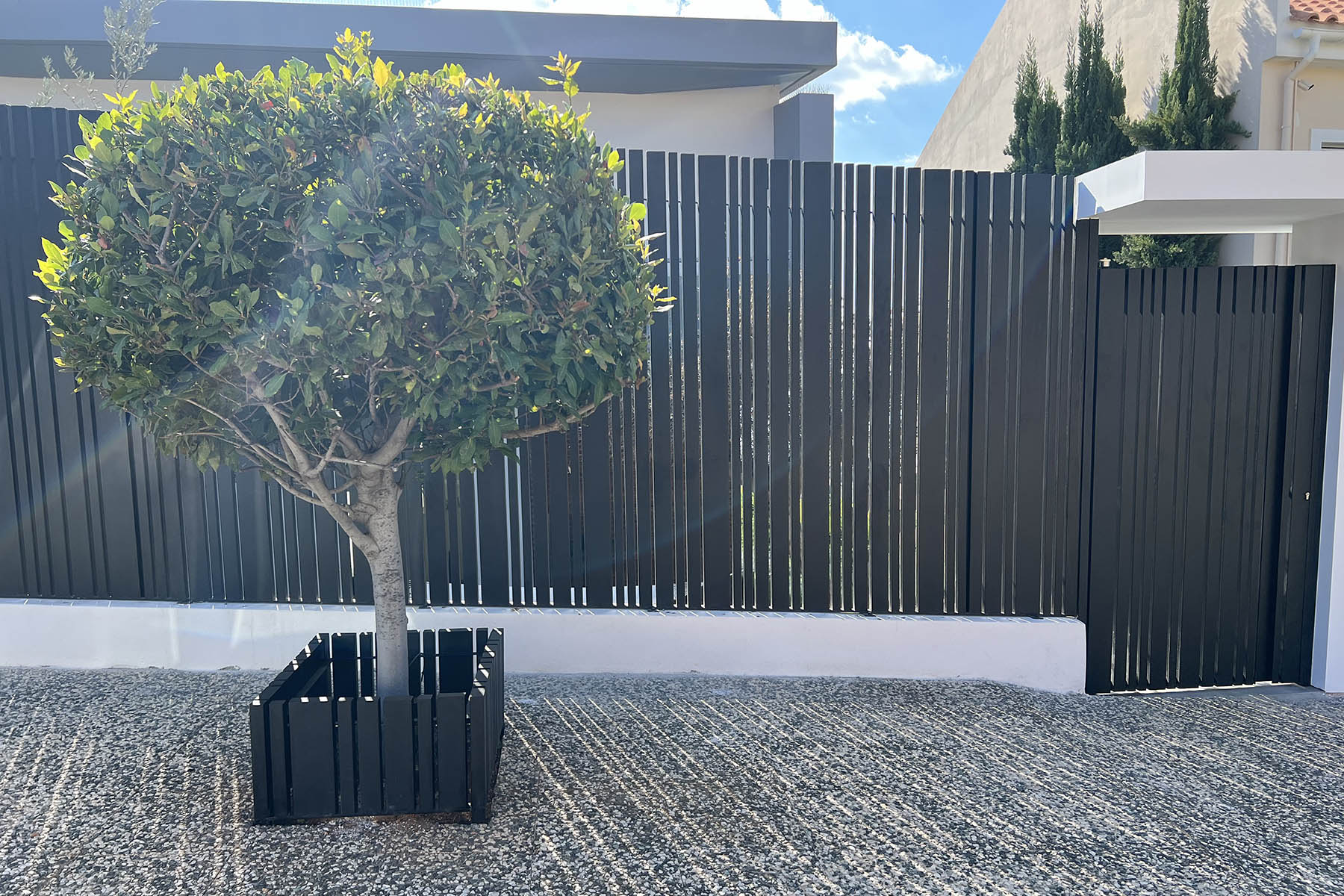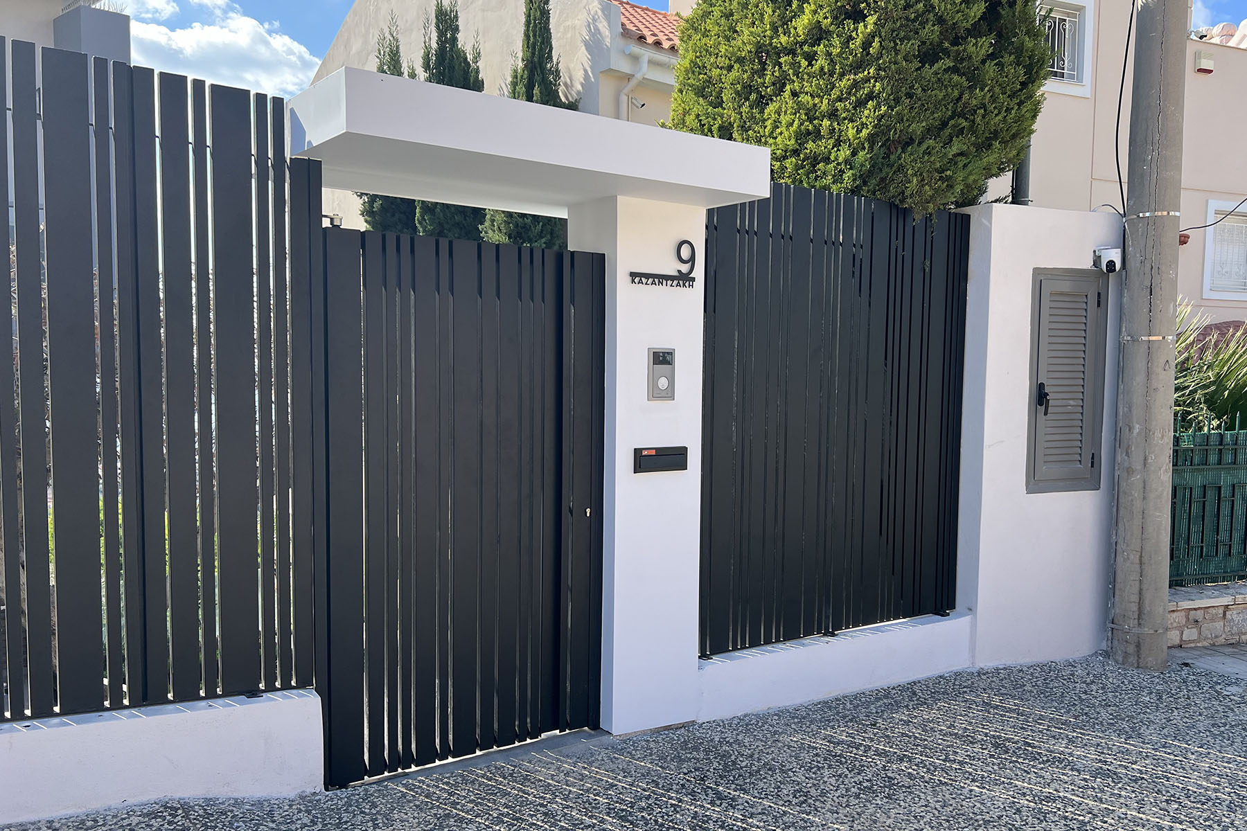 Περίφραξη και πόρτες σε περιβάλλοντα χώρο μοντέρνου κτιρίου, μεταλλικά με ηλεκτροστατική βαφή super durable, ιδιαίτερης αισθητικής σε κάθετη διάταξη. Στην αυλόπορτα δημιουργήθηκε πορτοσιά και, με έμφαση παντα στη λεπτομέρια, κατασκευάσαμε την πινακίδα της οδού με laser κοπή και προστατευτικούς χαμηλούς φρακτες για τα δέντρα, σε βαφή ίδια με τις υπόλοιπες κατασκευές μας.