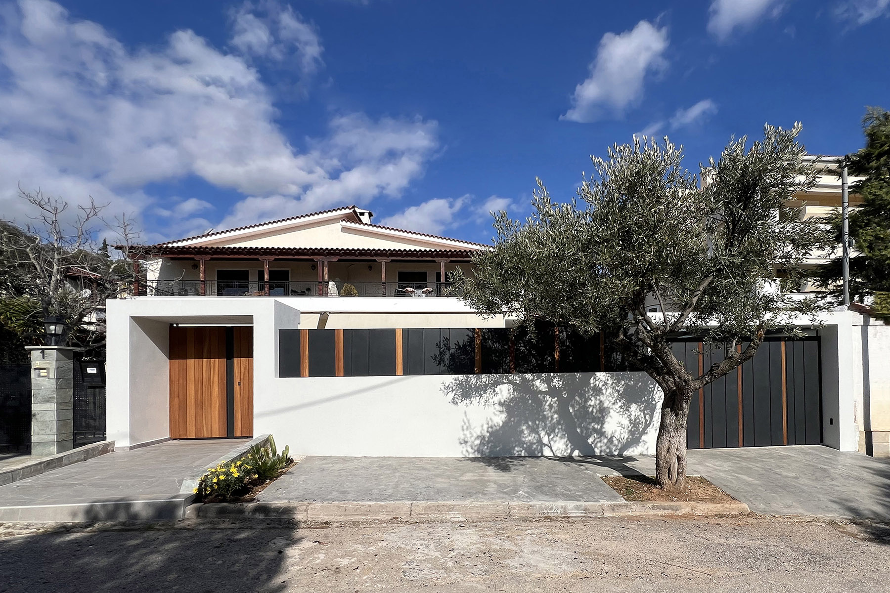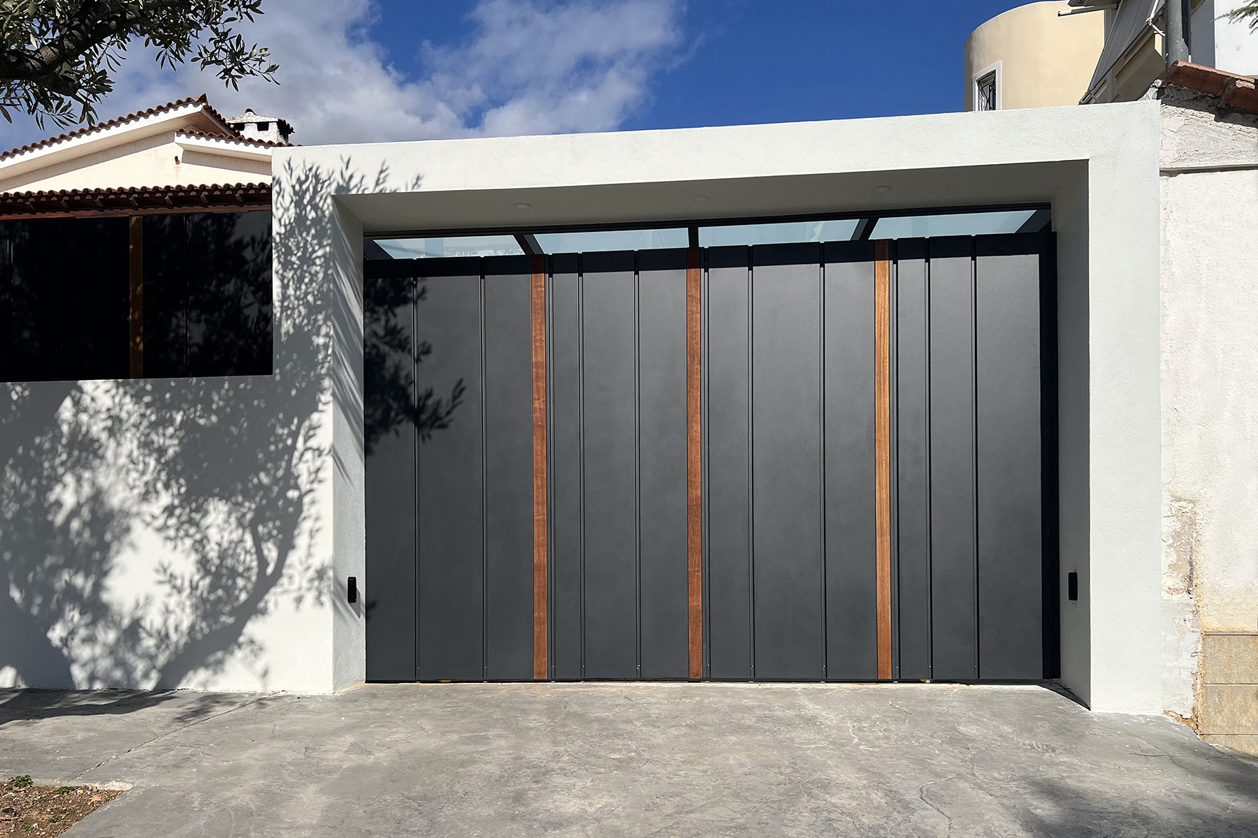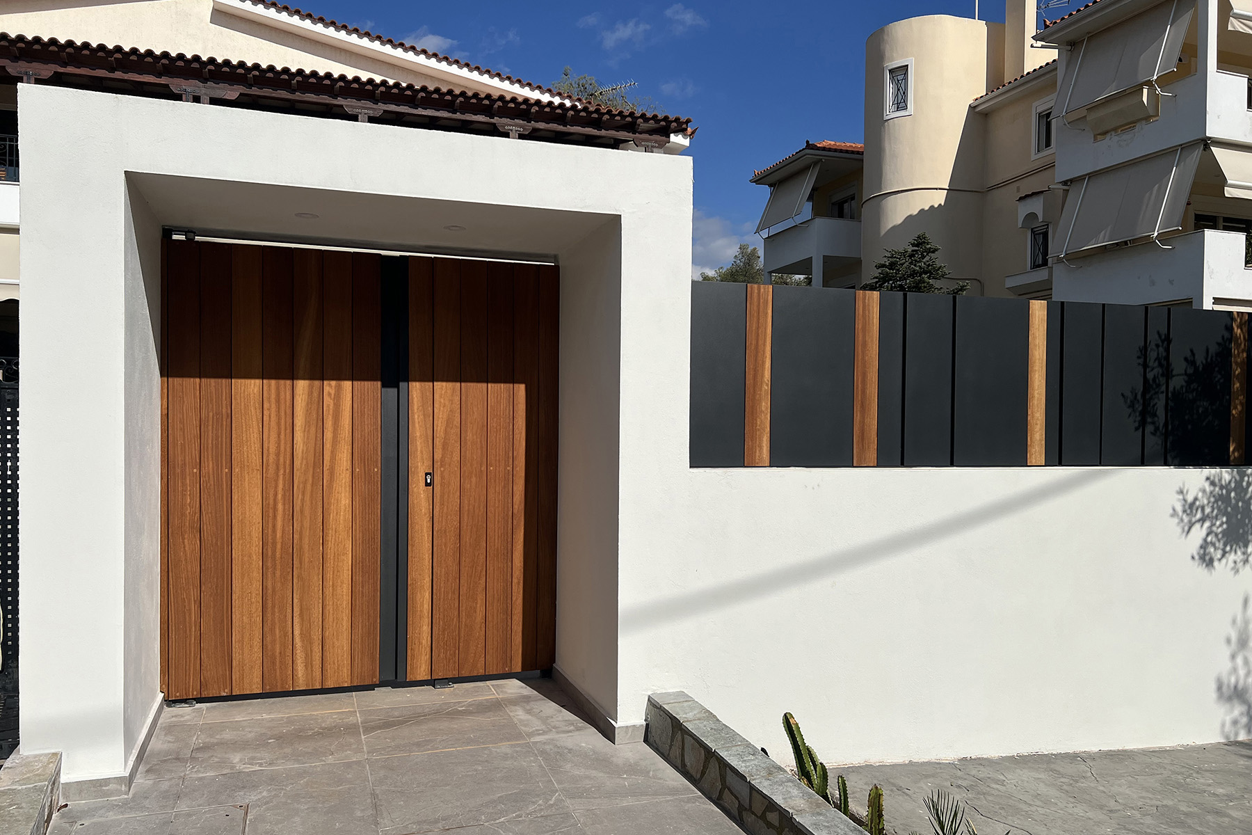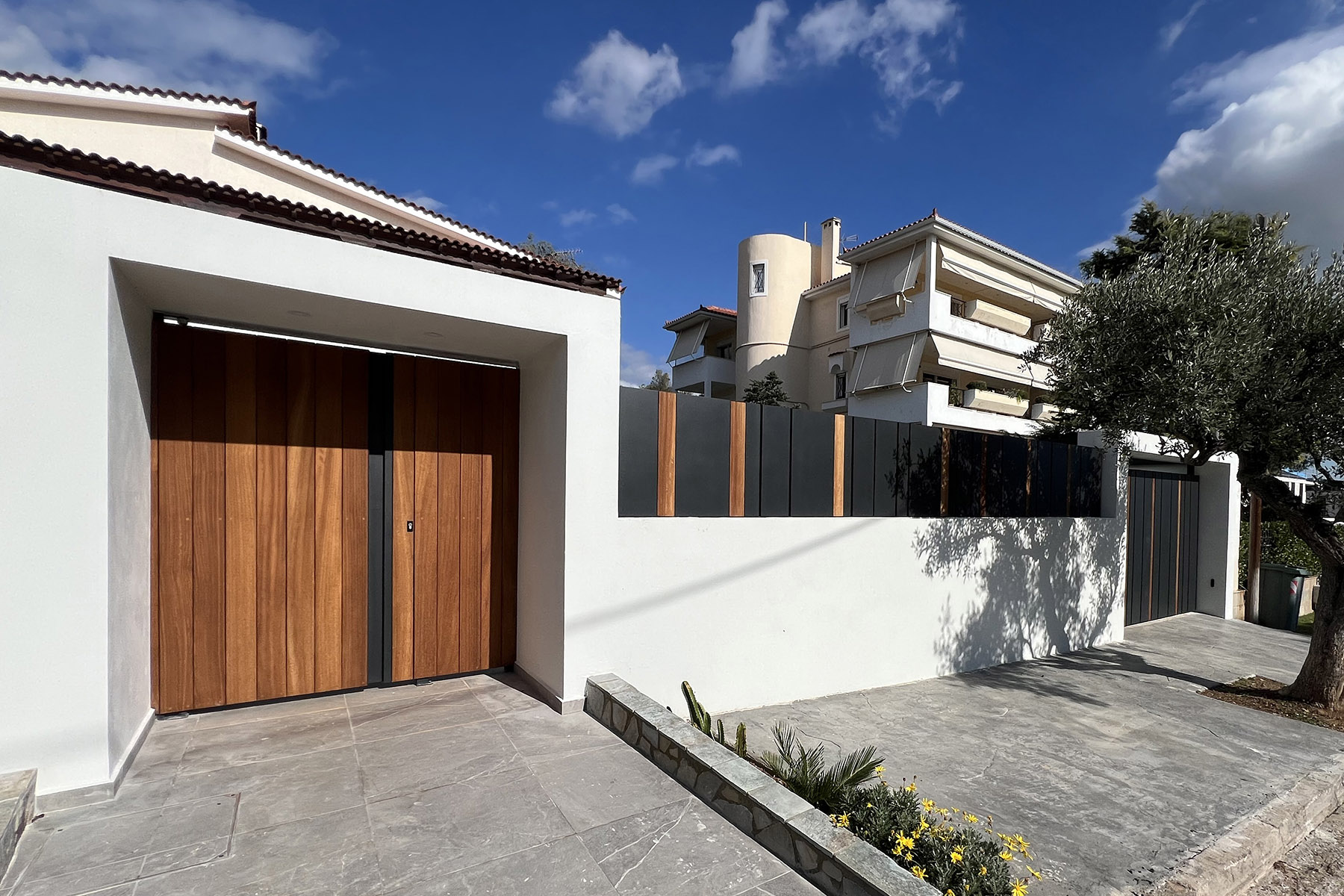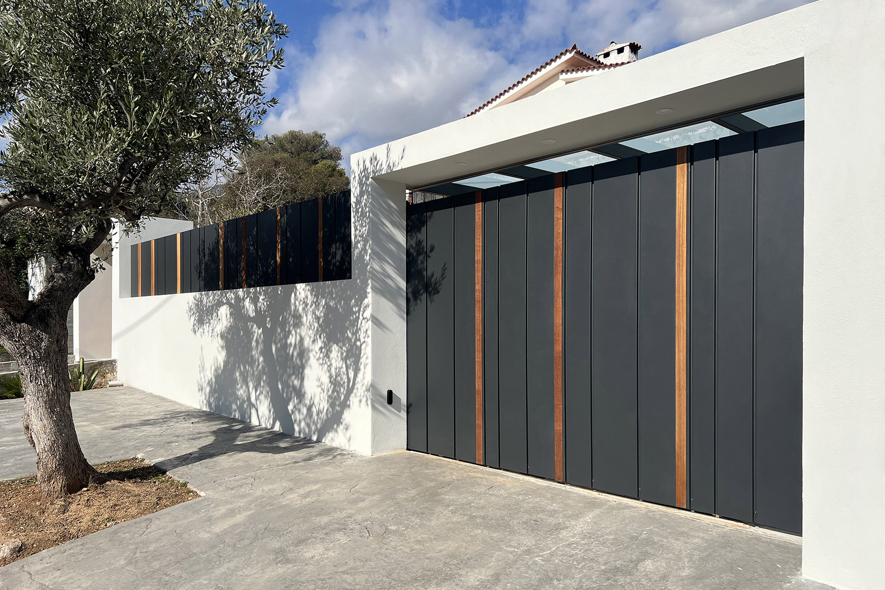 Περίφραξη και πόρτες σε γραμμικό σχέδιο, με καθαρές φόρμες από μέταλλο και ξύλο, που δίνουν ένα αισθητικό αποτέλεσμα διαχρονικό και μοντέρνο ταυτόχρονα
