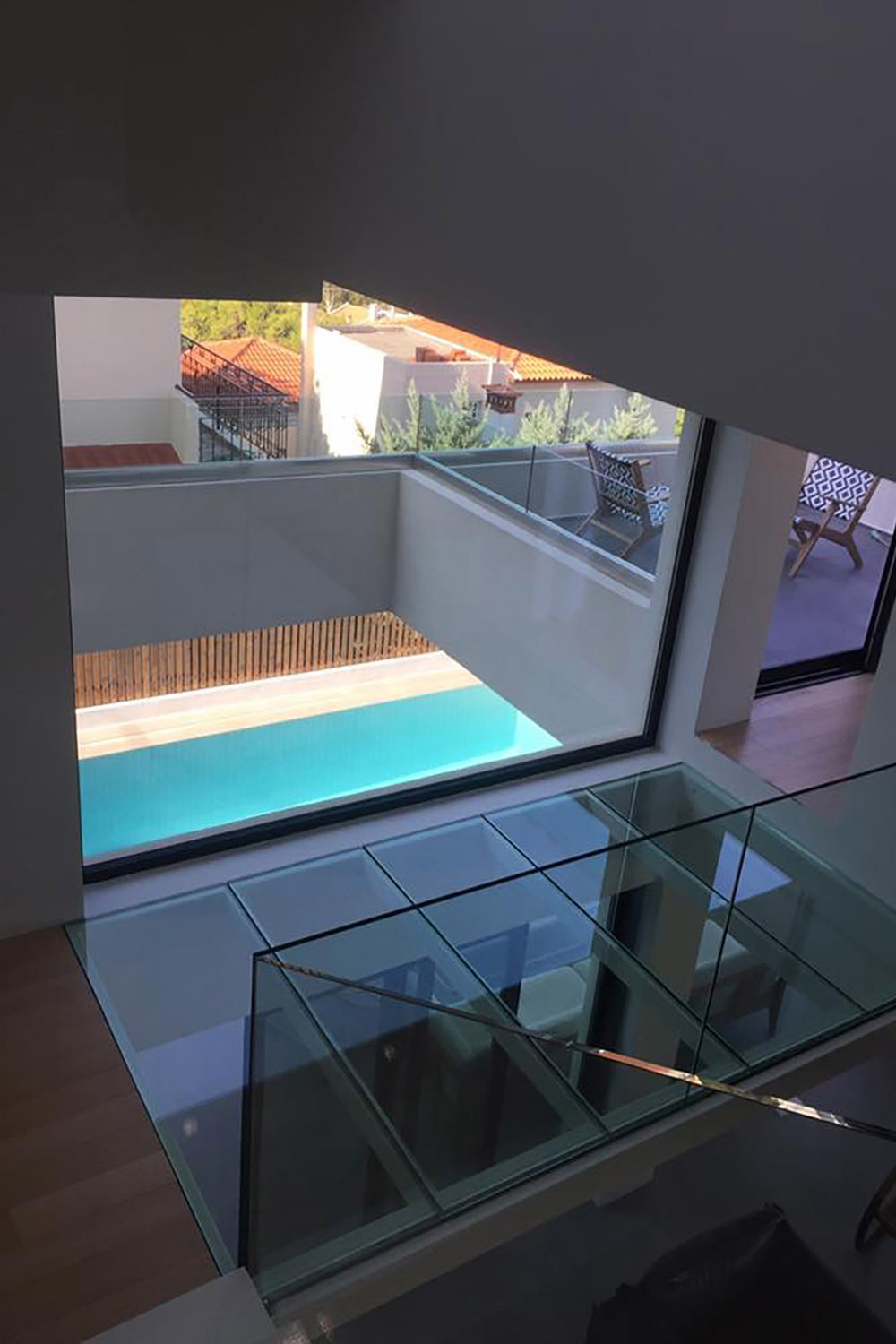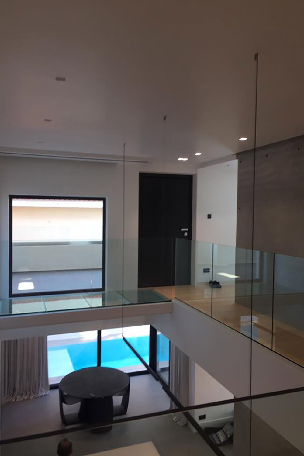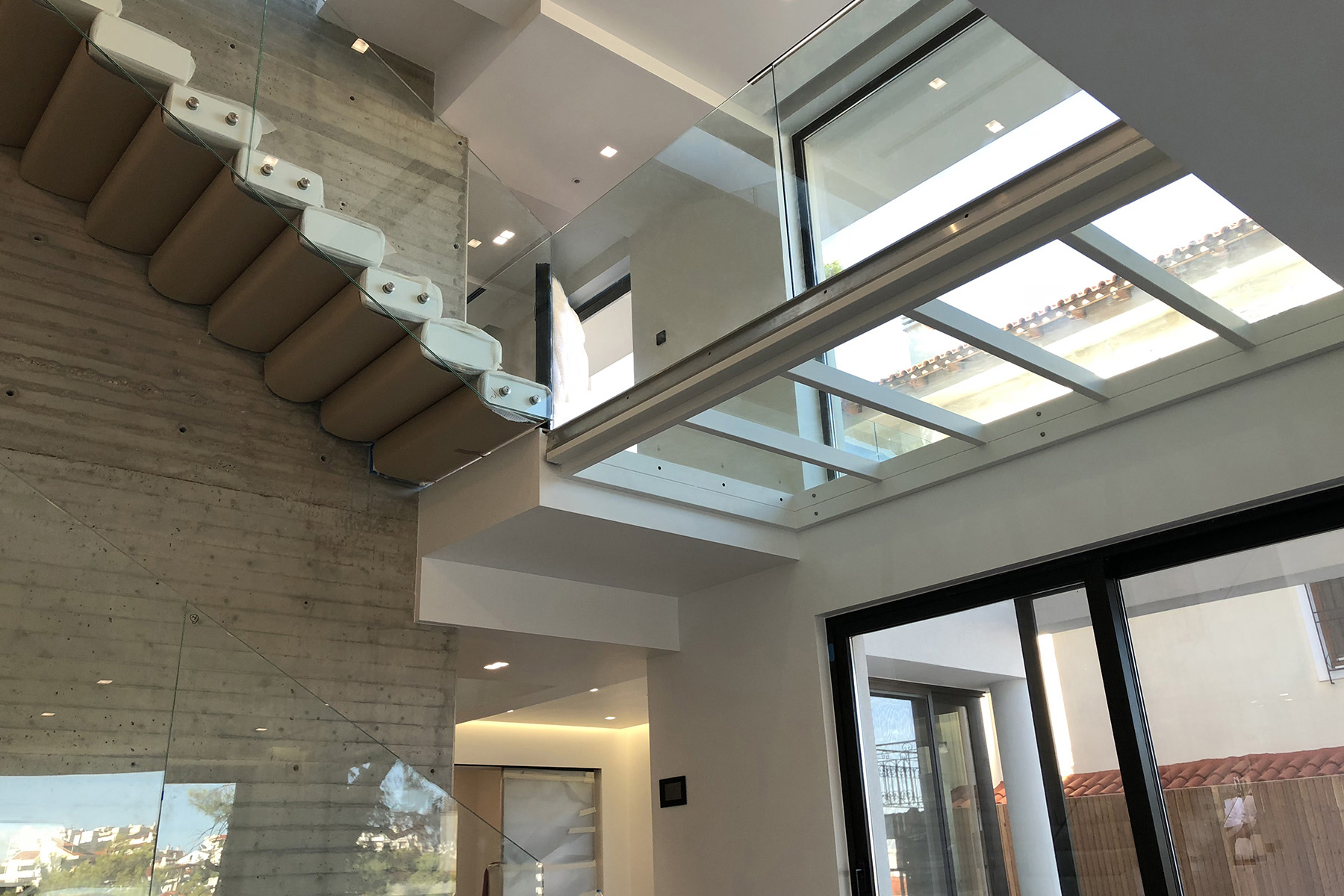 Γυάλινα στηθαία σε μεζονέτα με inox βάσεις σε όλο το μήκος της εσωτερικής σκάλας και δημιουργία εσωτερικού μπαλκονιού και επένδυση των σαπέδων με γυαλιά τρίπλεξ και seurit 10+10+10mm