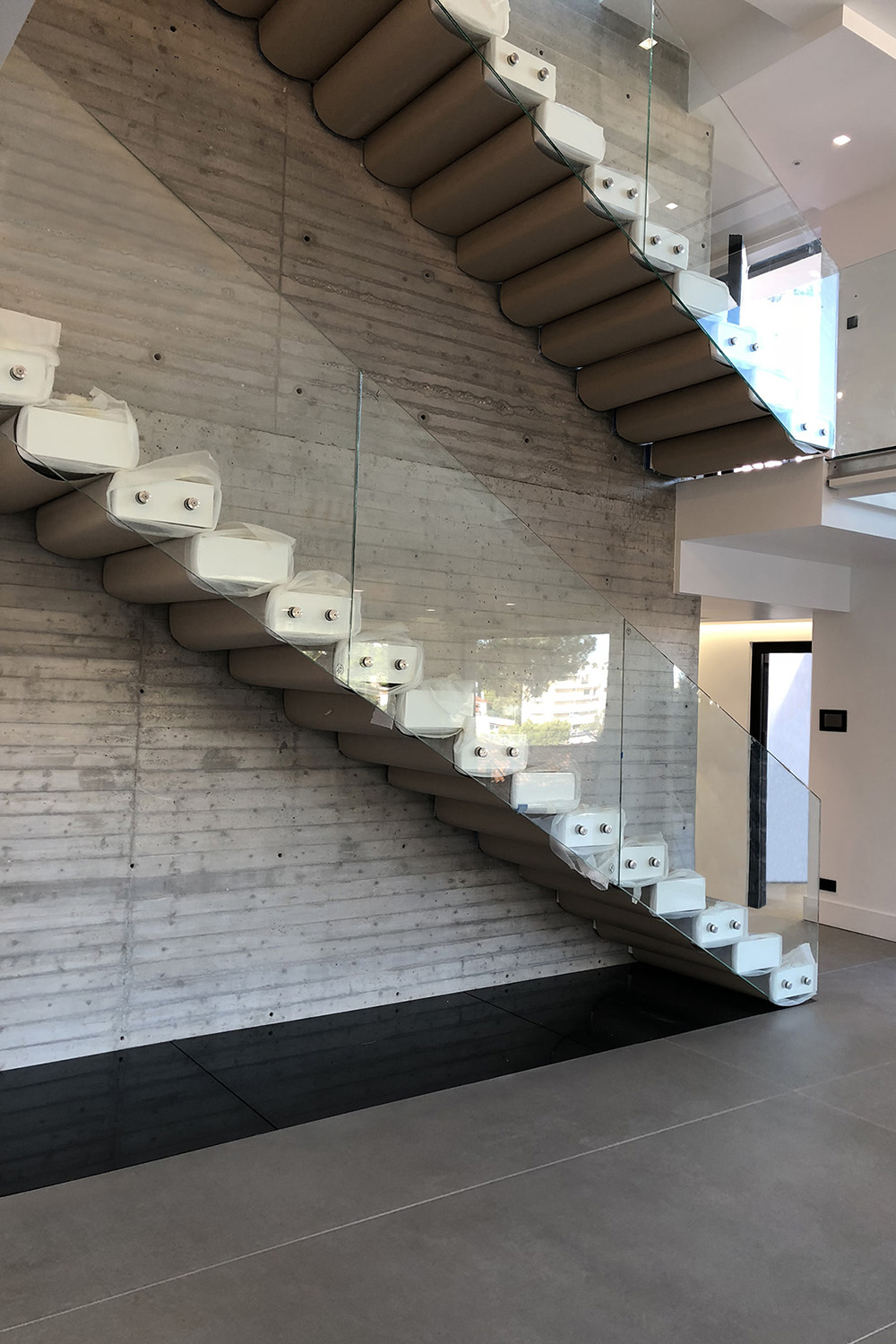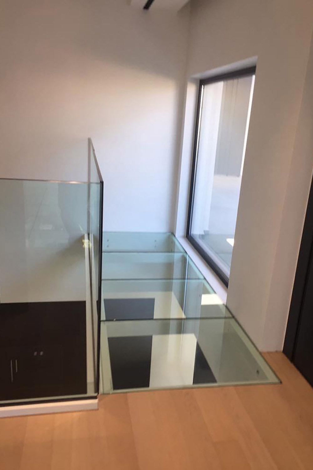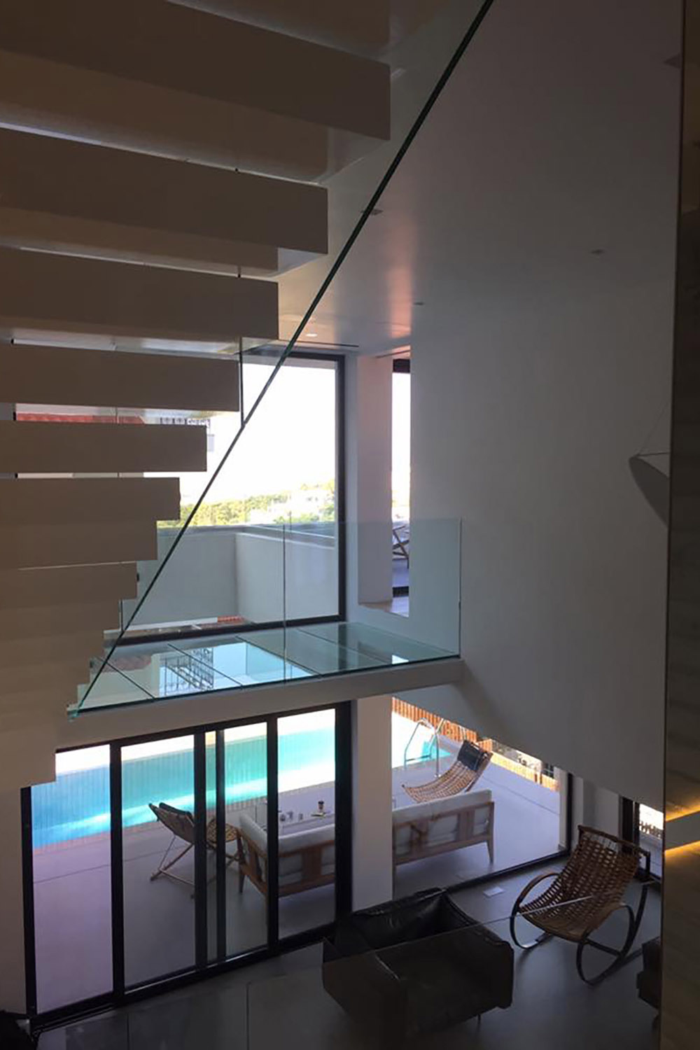 Γυάλινα στηθαία σε μεζονέτα με inox βάσεις σε όλο το μήκος της εσωτερικής σκάλας και δημιουργία εσωτερικού μπαλκονιού και επένδυση των σαπέδων με γυαλιά τρίπλεξ και seurit 10+10+10mm