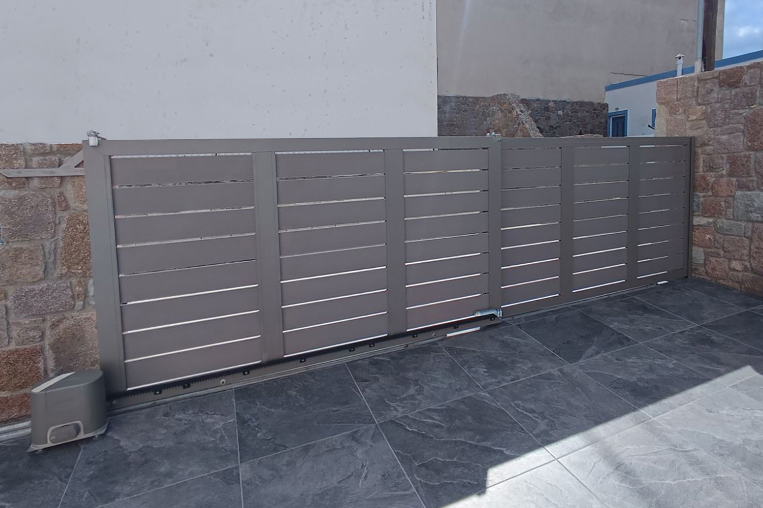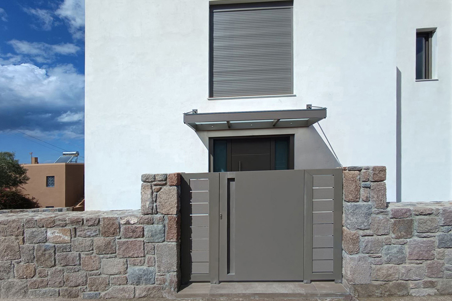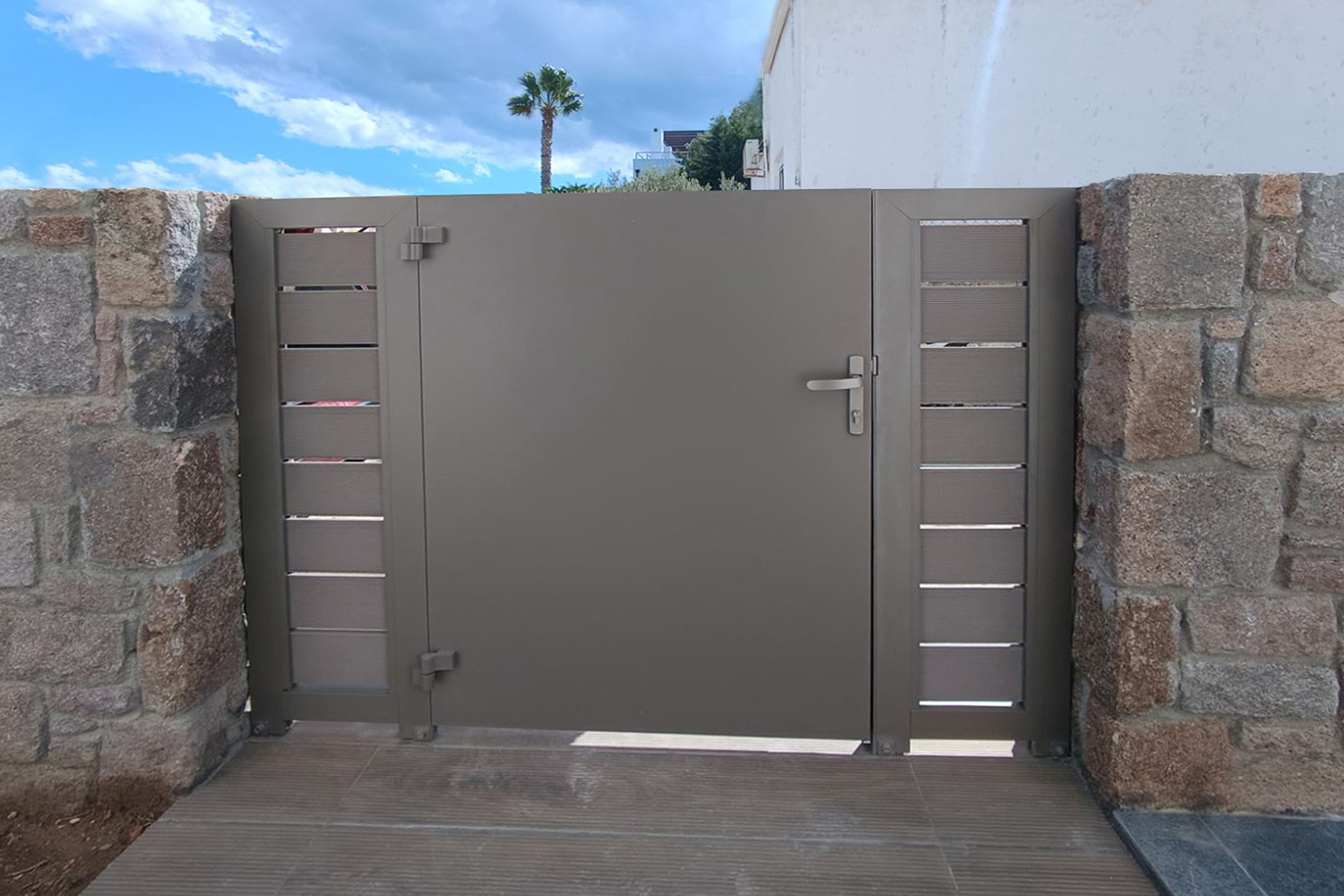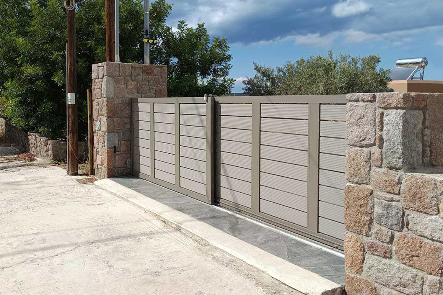 Κατασκευή ανοιγόμενης αυλόπορτας και τηλεσκοπικής συρόμενης γκαραζόπορτας, αλουμίνιου με επένδυση wpc