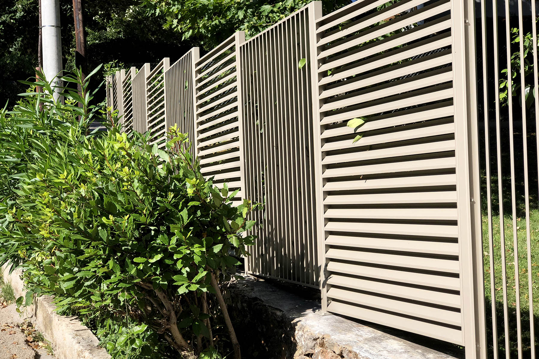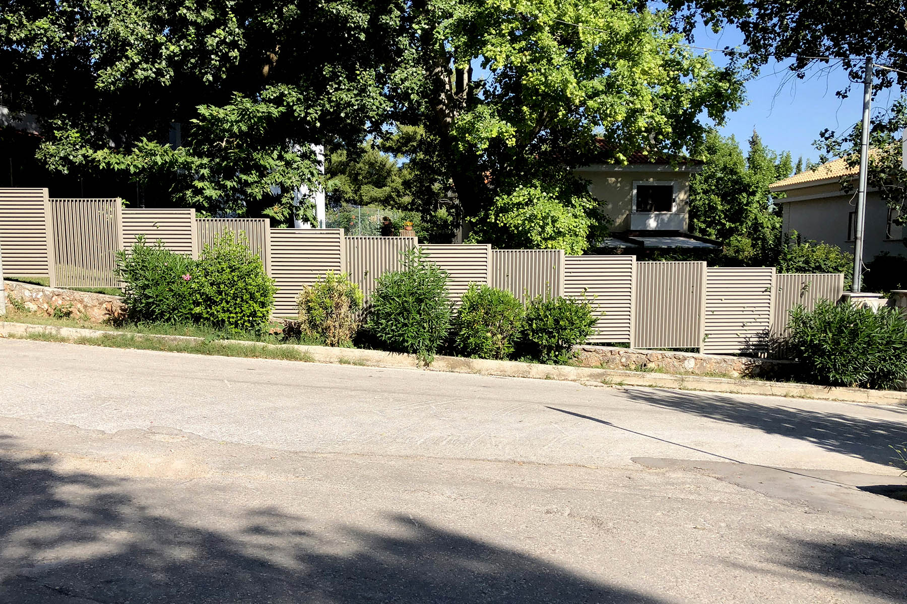 Μεταλλική περίφραξη μονοκατοικίας με γαλβανισμένα πλαίσια με σταθερές περσίδες σε σχήμα Ζ με εναλλαγή φοράς μεταξύ οριζόντιου – κάθετου και ηλεκτροστατική βαφή.