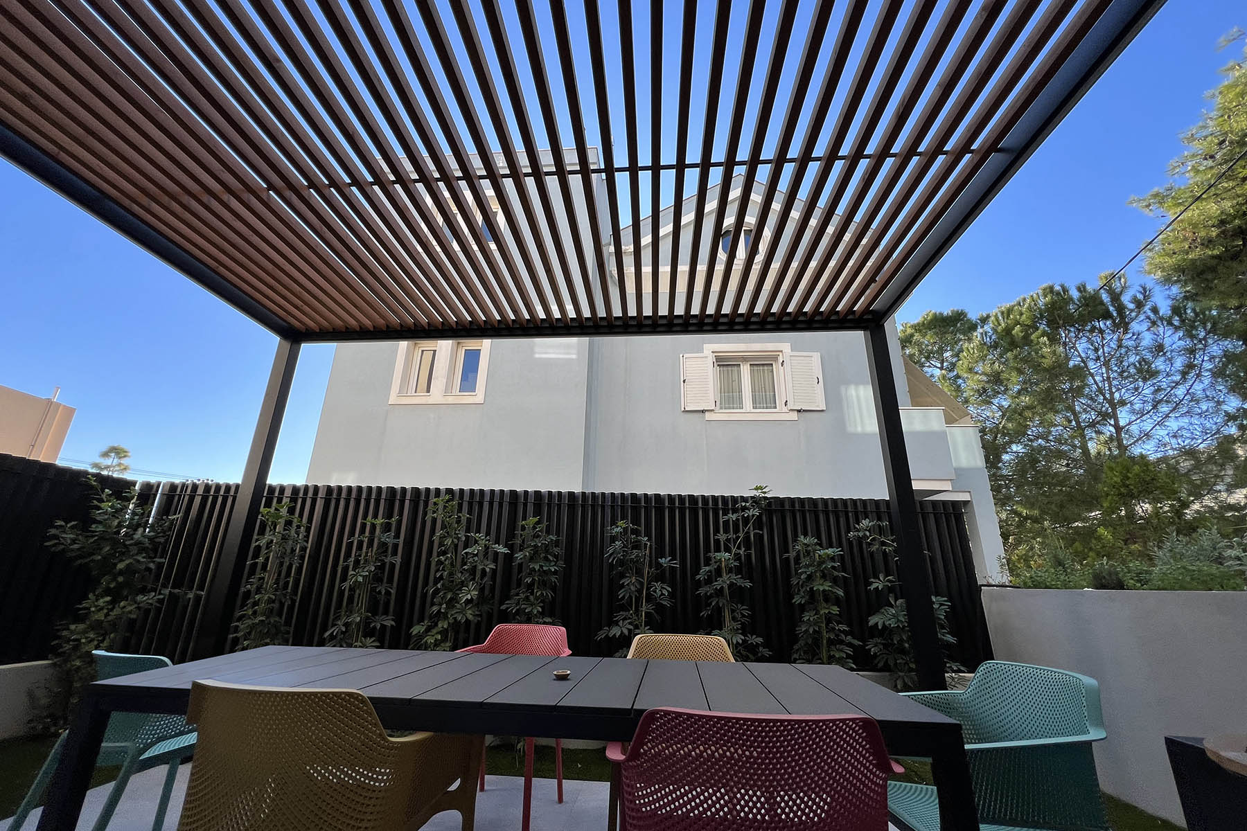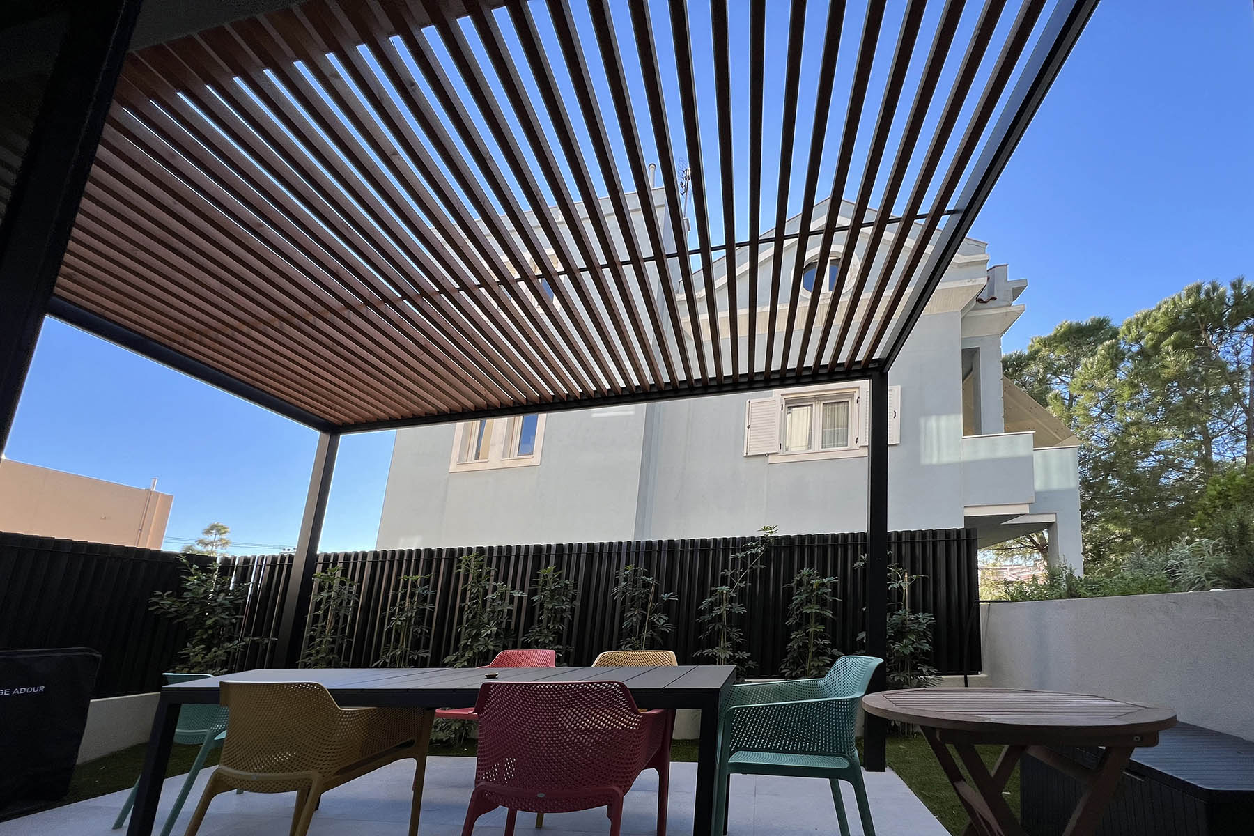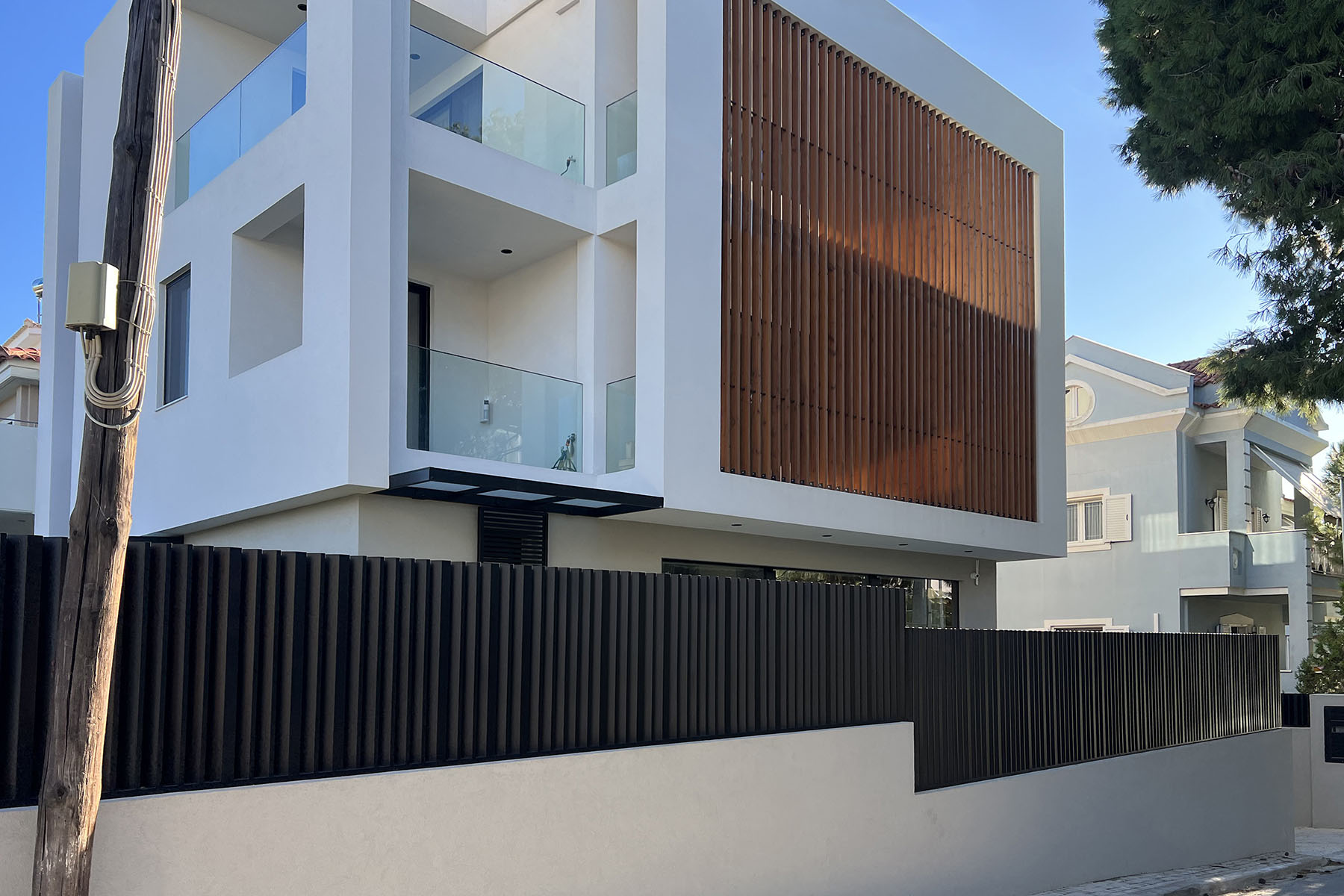 Διαμόρφωση χώρου μονοκατοικίας στο Νέο Ηράκλειο, η οποία περιλαμβάνει περίφραξη και αυλόπορτα με ασύμμετρες κατακόρυφες περσίδες από γαλβανισμένη διαμορφωμένη λαμαρίνα και ηλεκτροστατική βαφή, επένδυση της όψης του κτιρίου με κάθετα ξύλινα δοκάρια, και πέργκολα με μεταλλικό γαλβανισμένο σκελετό και ξύλινο comb