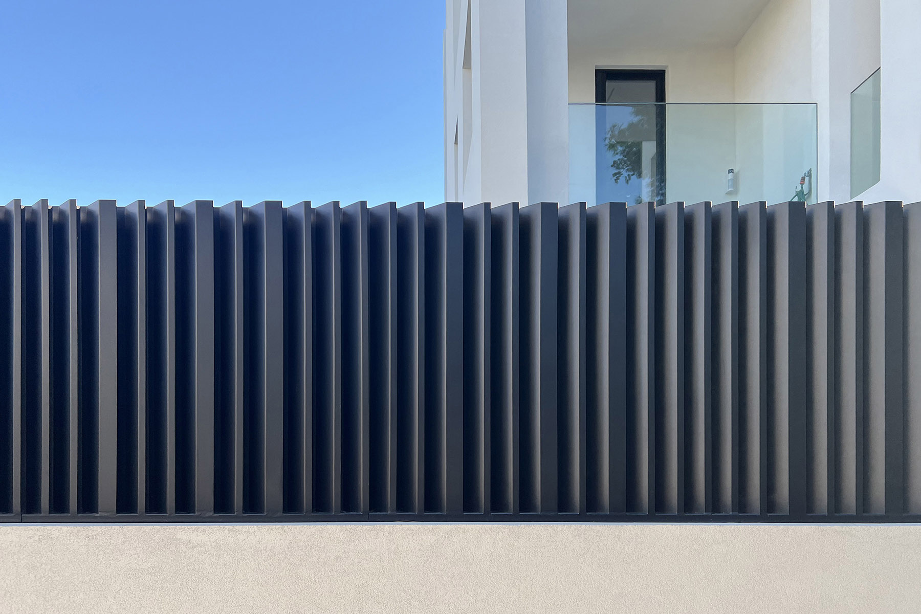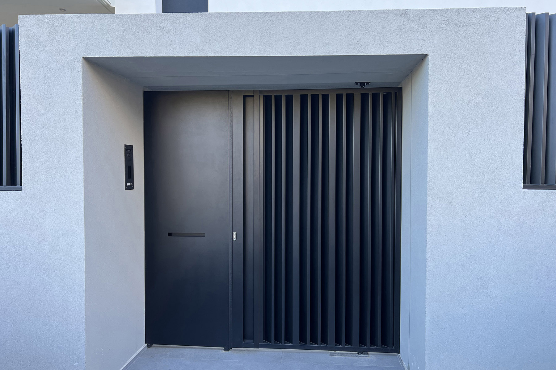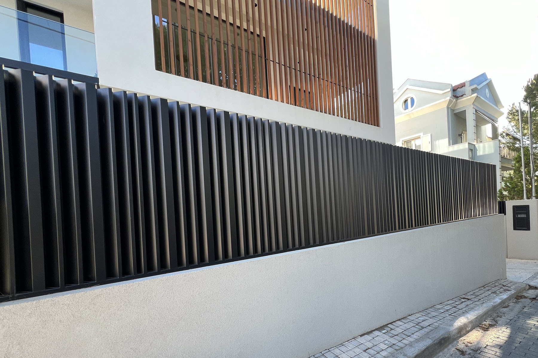 Διαμόρφωση χώρου μονοκατοικίας στο Νέο Ηράκλειο, η οποία περιλαμβάνει περίφραξη και αυλόπορτα με ασύμμετρες κατακόρυφες περσίδες από γαλβανισμένη διαμορφωμένη λαμαρίνα και ηλεκτροστατική βαφή, επένδυση της όψης του κτιρίου με κάθετα ξύλινα δοκάρια, και πέργκολα με μεταλλικό γαλβανισμένο σκελετό και ξύλινο comb