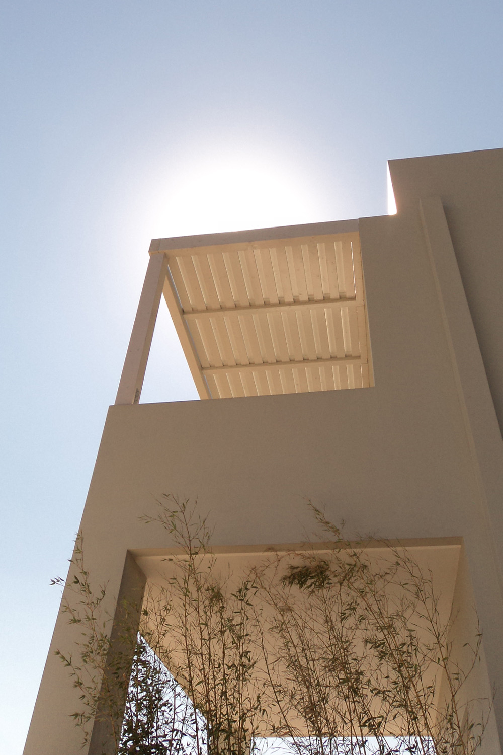 Ξύλινη εγκιβωτισμένη πέργκολα με 2plank στην οροφή για σκίαση, τοποθετημένη σε βεράντα μονοκατοικίας, σε μοντέρνα γραμμή και λευκό χρώμα, απόλυτα εναρμονισμένη με το ύφος του σπιτιού.