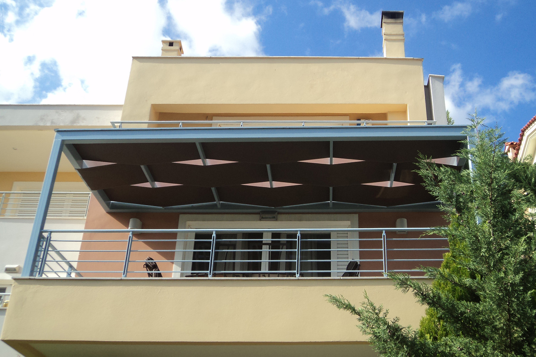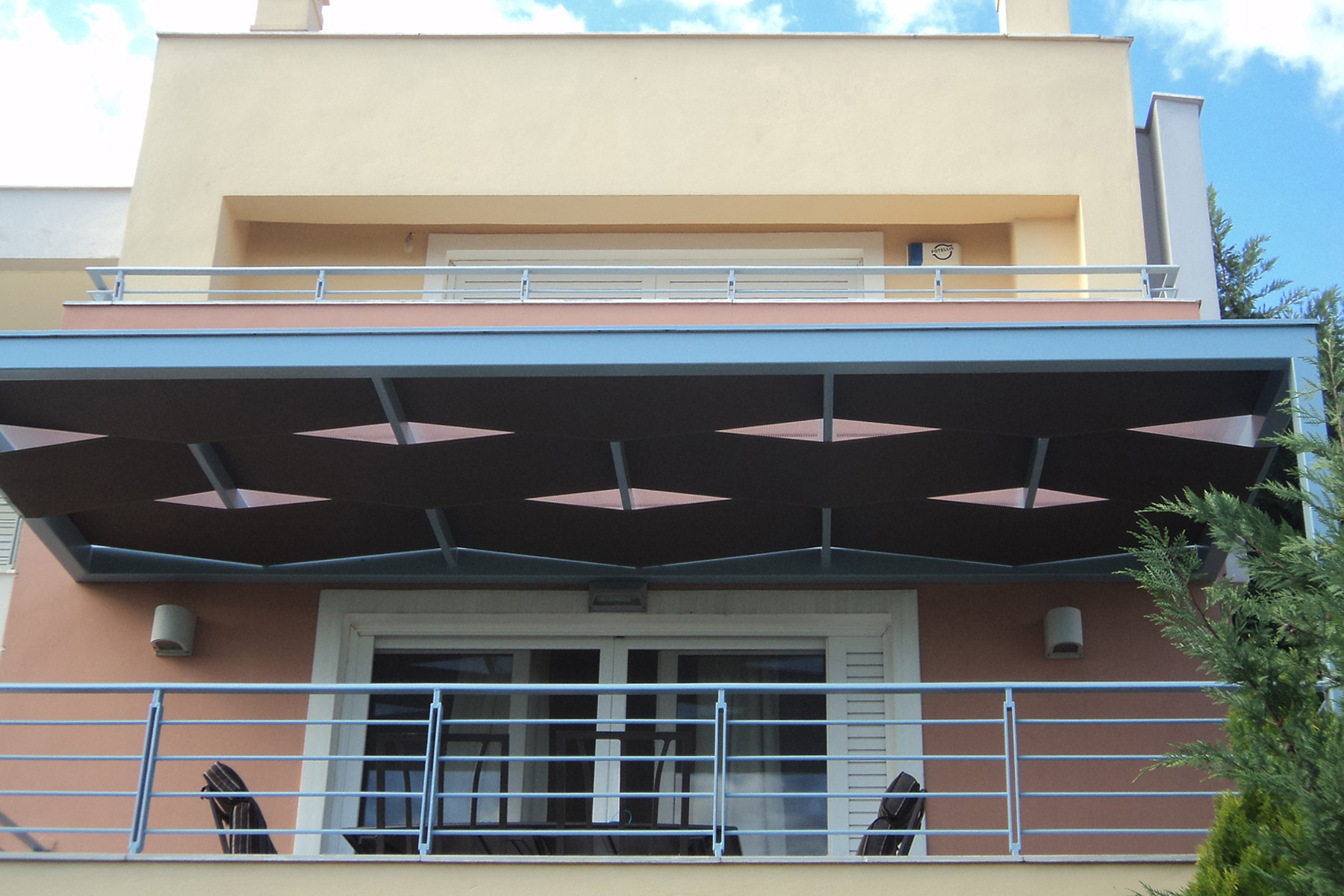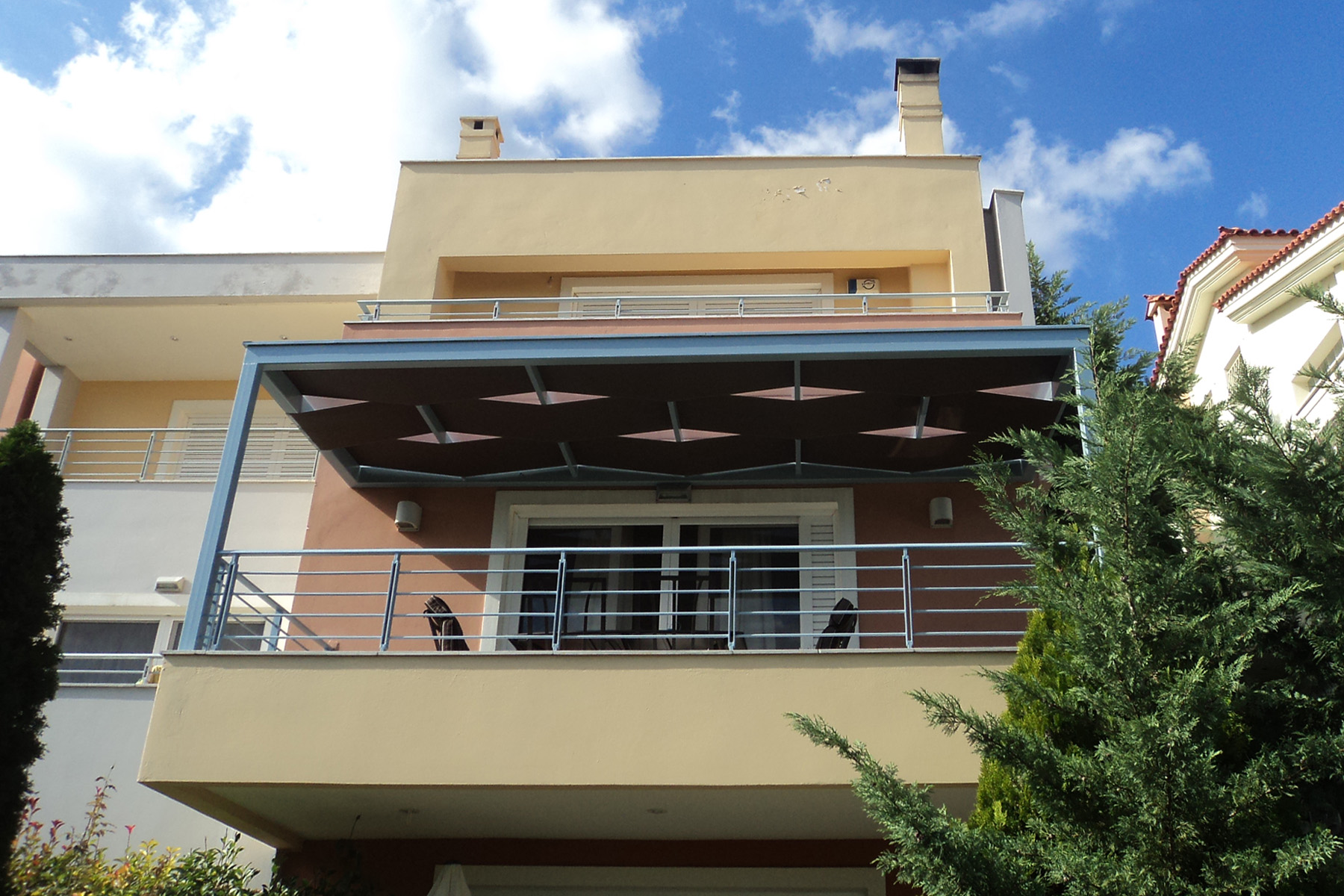 Μεταλλική πέργκολα με σκίαση Wave (κυματιστά τεντόπανα), βαμμένη σε γκρι απόχρωση, όμοια με τα υπόλοιπα μεταλλικά στοιχεία του σπιτιού. Το χρώμα των τεντόπανων είναι MOCHA για έναν απόλυτα ισορροπημένο χρωματικό συνδυασμό με το σύνολο του κτιρίου.