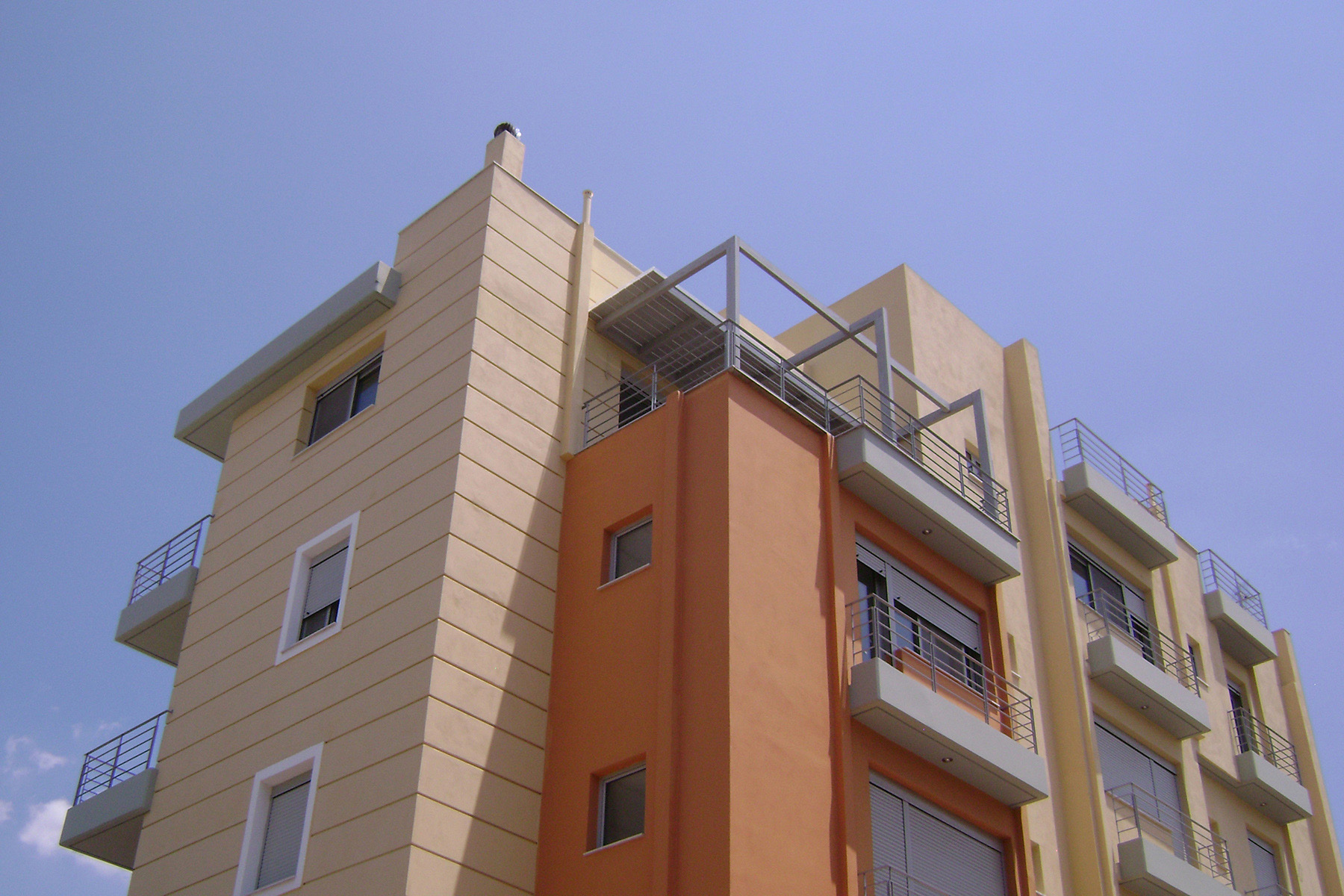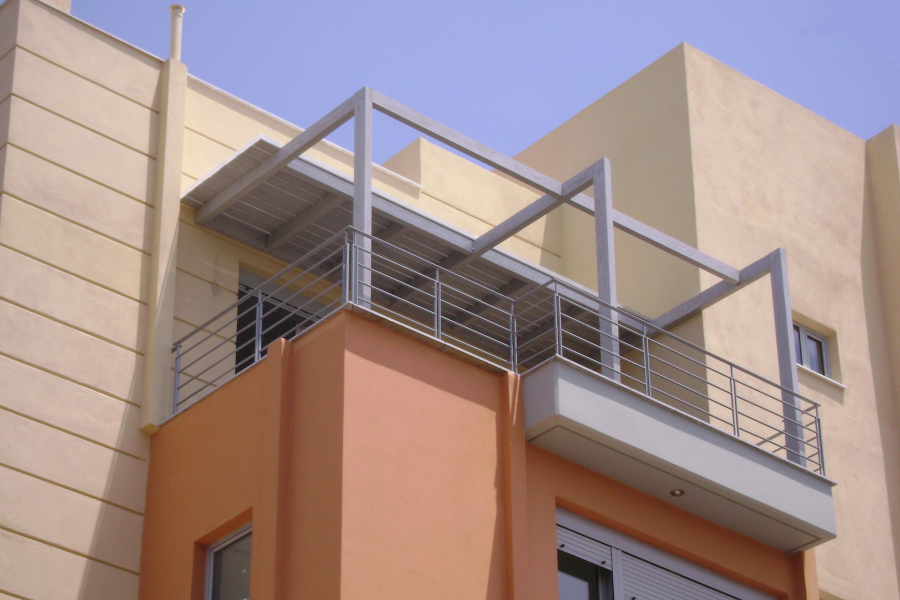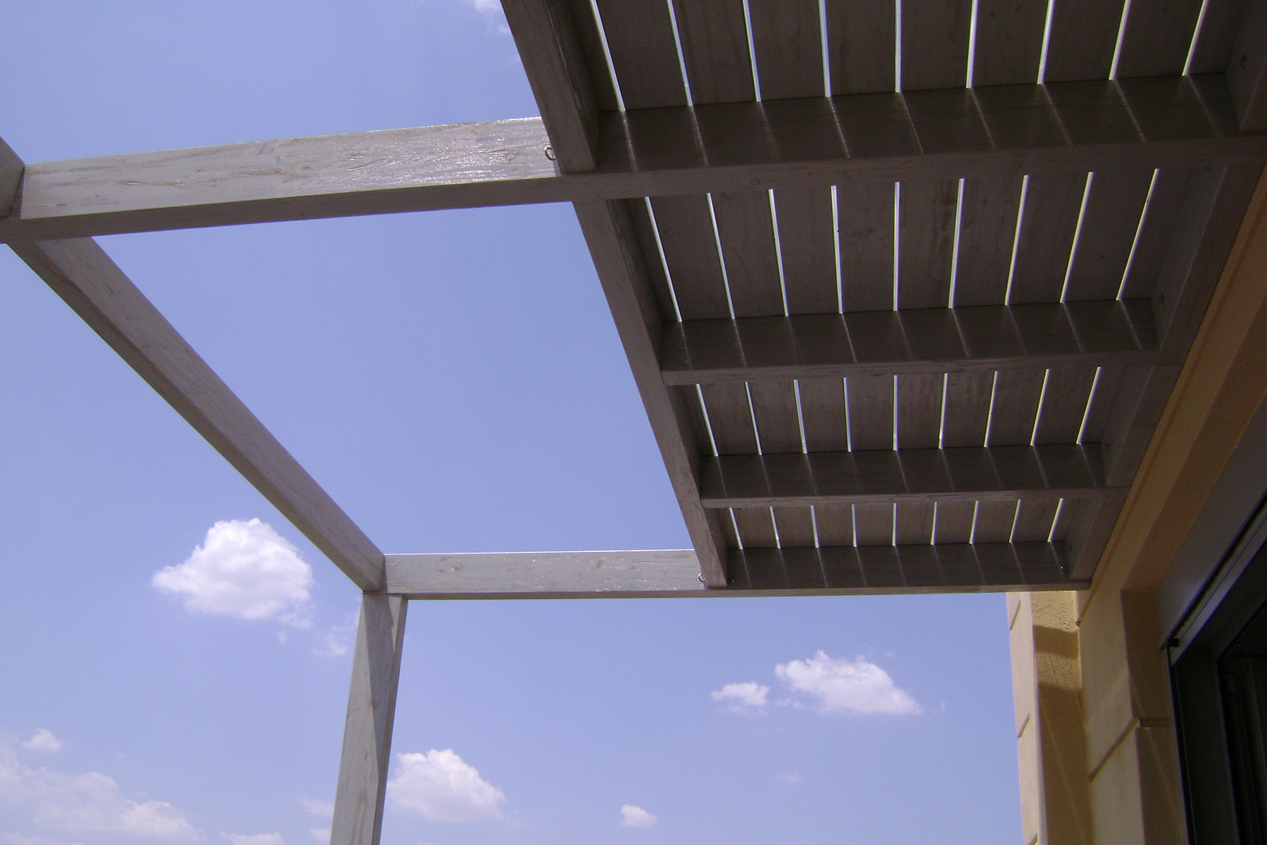Κατασκευή πέργκολας από σύνθετη πολυκολλητή ξυλεία σε ιδιαίτερο σχέδιο και κάλυψη κατά το ήμισυ με οριζόντιες σανίδες σε γκρι χρώμα και πολυκαρβονικό για στεγάνωση. Όλη η ξυλεία της κατασκευής έχει υποστεί ειδική κατεργασία ώστε να αποδίδει παλαιωμένη υφή και εικόνα.