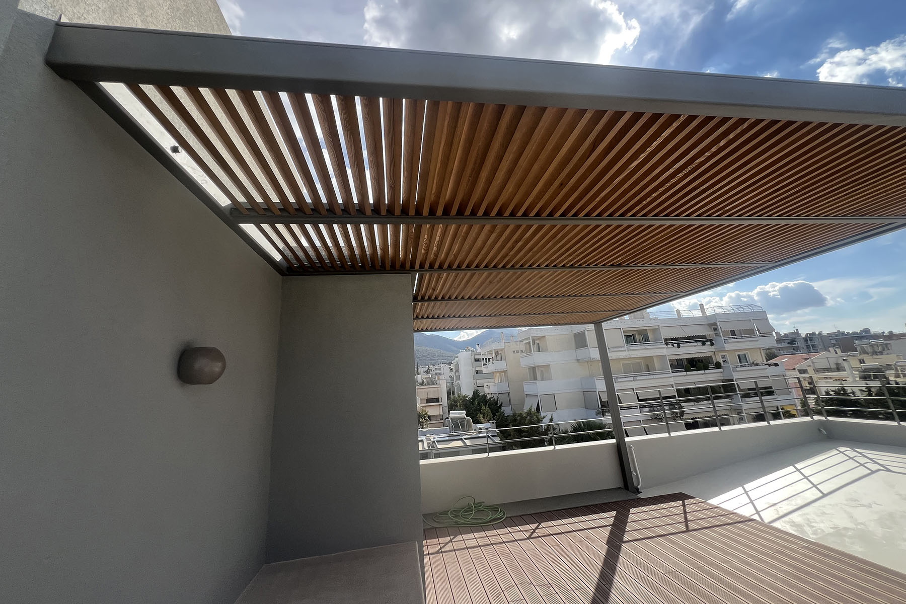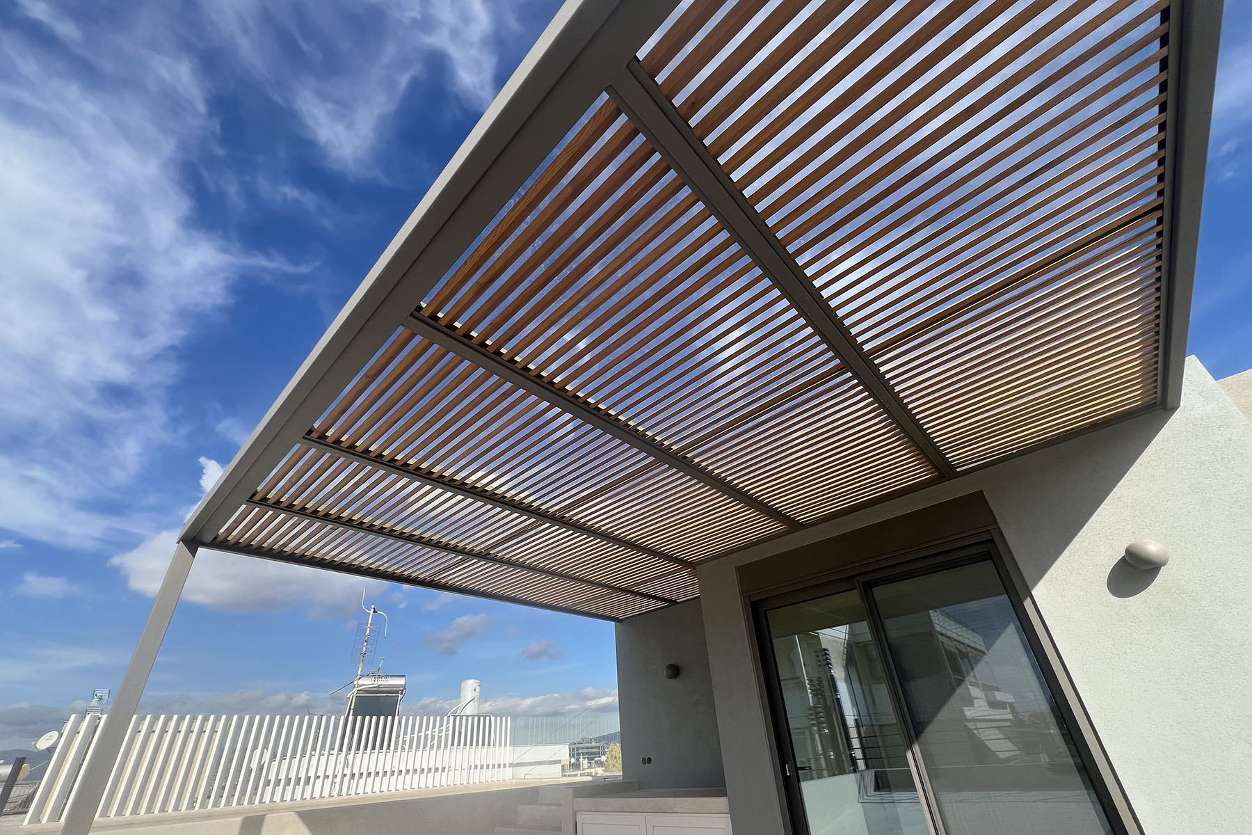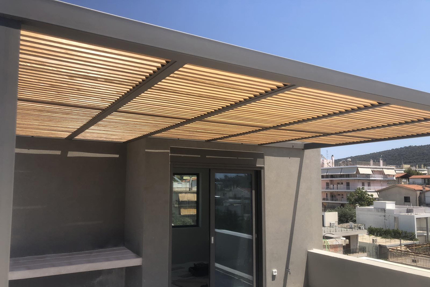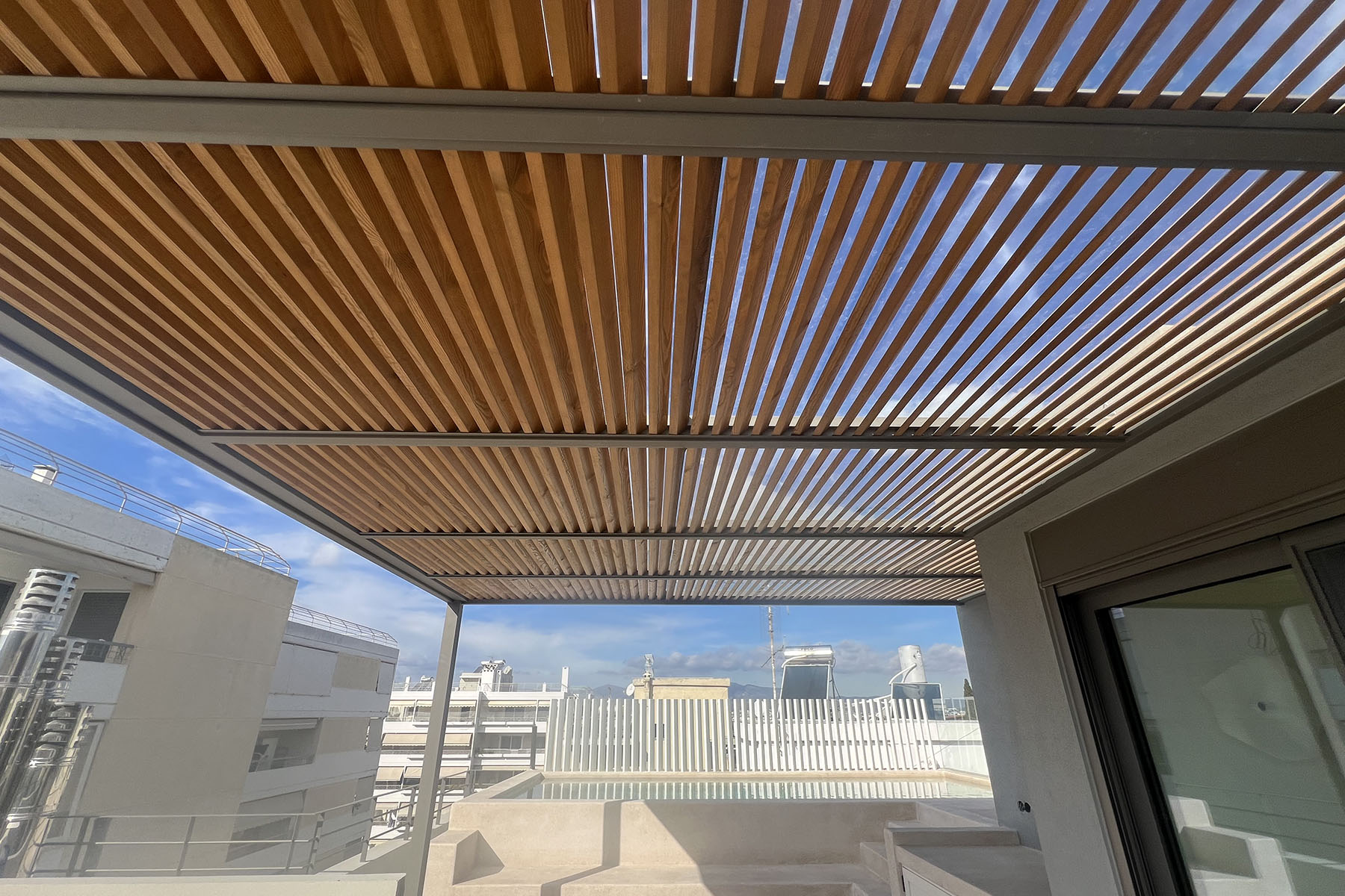 Πέργκολα στην Αγία Παρασκευή σε ταράτσα κτιρίου, με μεταλλικό σκελετό γαλβανισμένο, σκίαση με σταθερές ξύλινες περσίδες και στεγάνωση με γυαλί τρίπλεξ