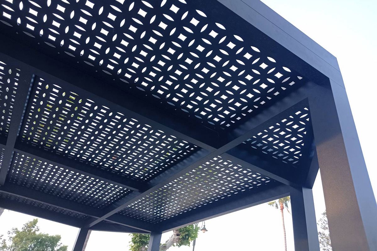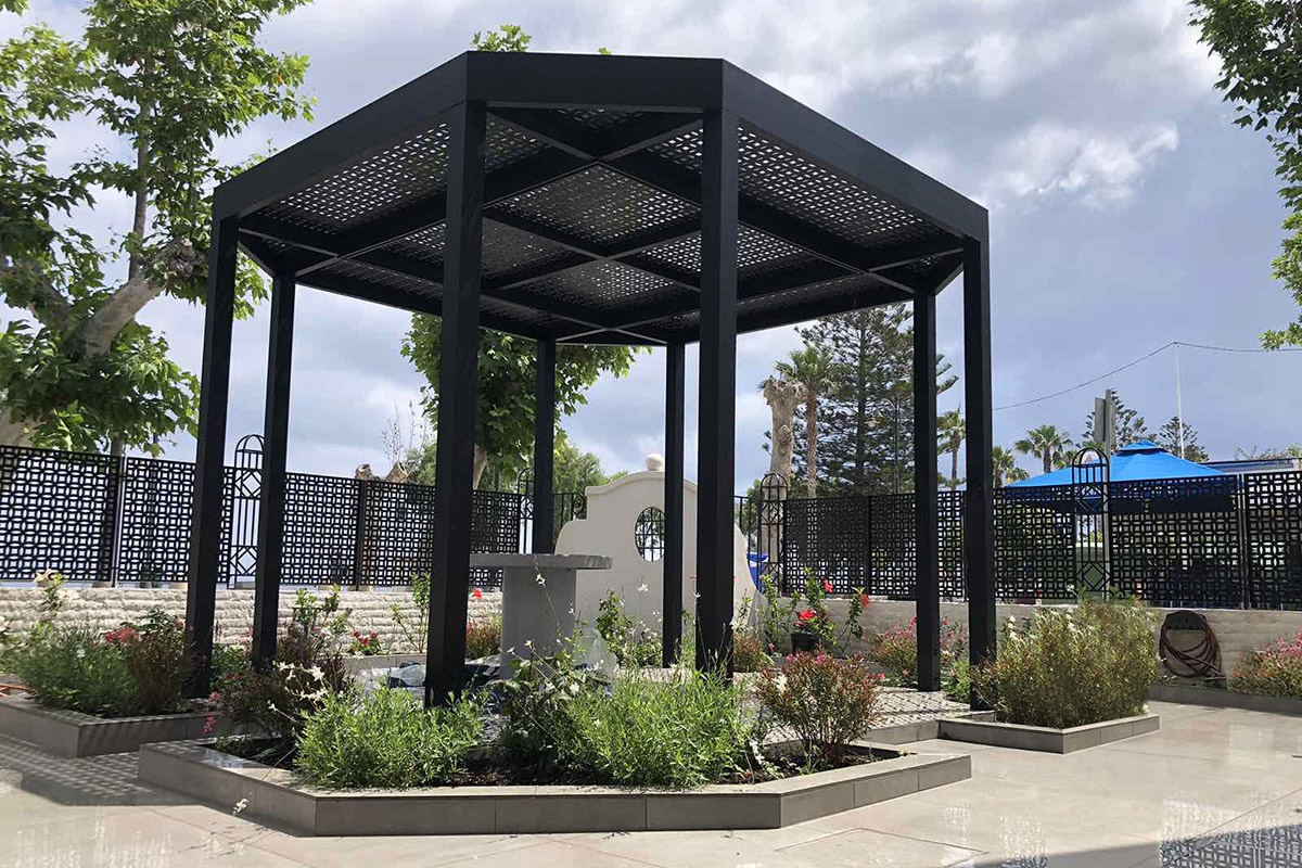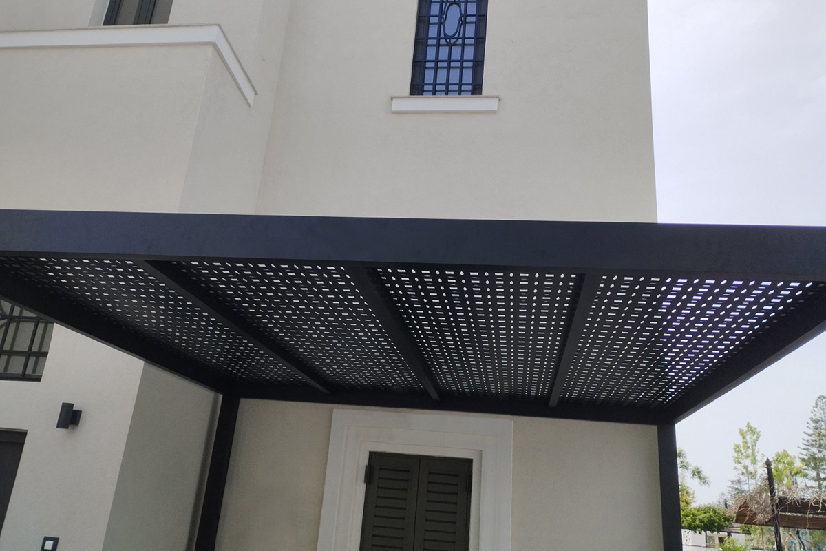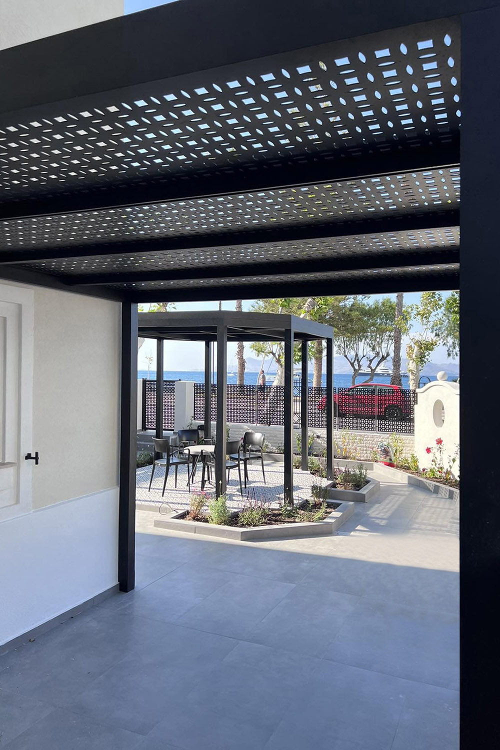 Πέργκολες αλουμινίου με laser κοπή στην οροφή σε custom σχέδιο, ηλεκτροστατική βαφή super durable λόγω εγκύτητας στη θάλασσα και πολύ εντυπωσιακό οκτάγωνο σχήμα στην αυτοστήρικτη πέργκολα του κήπου.