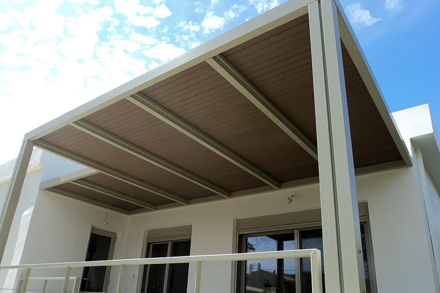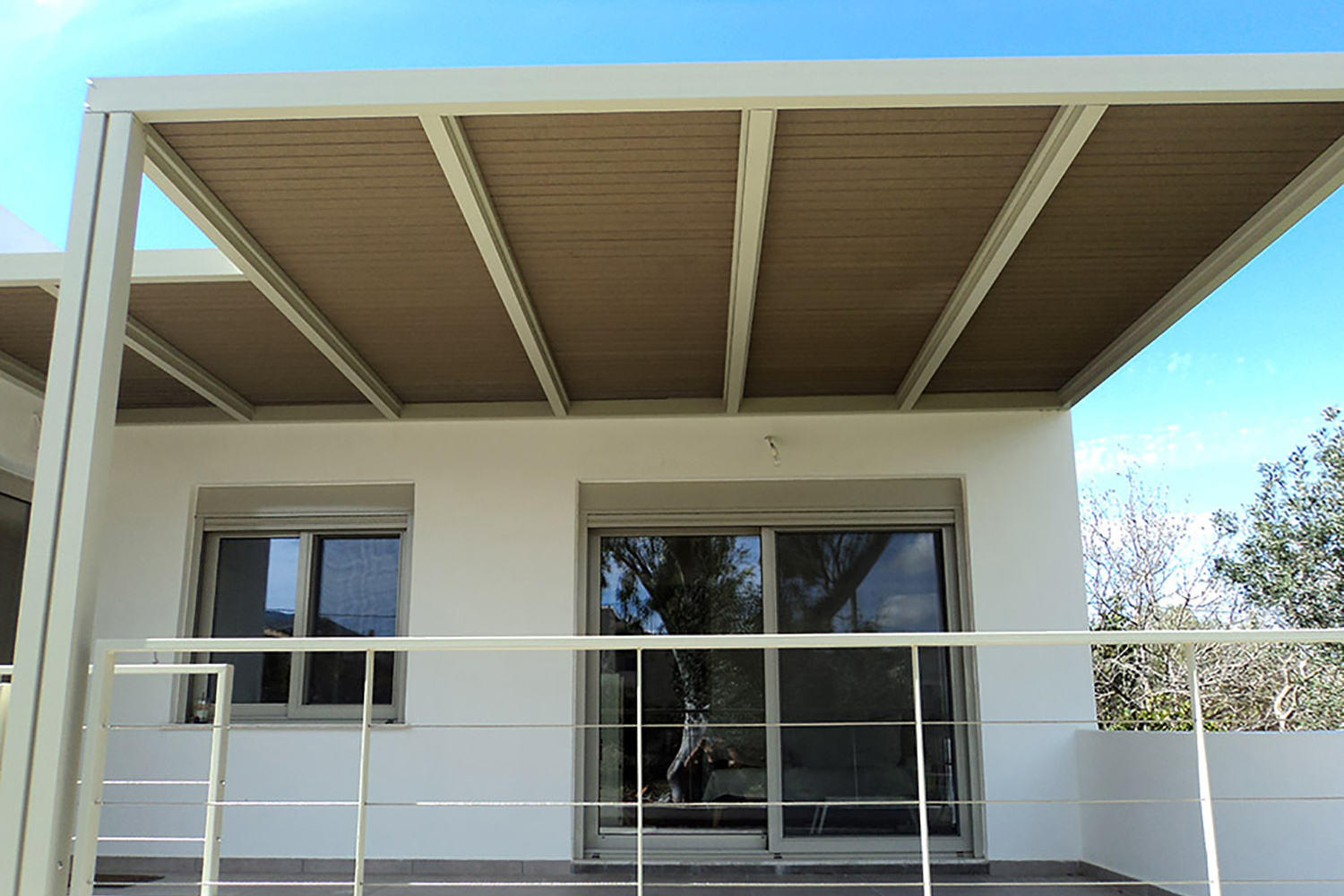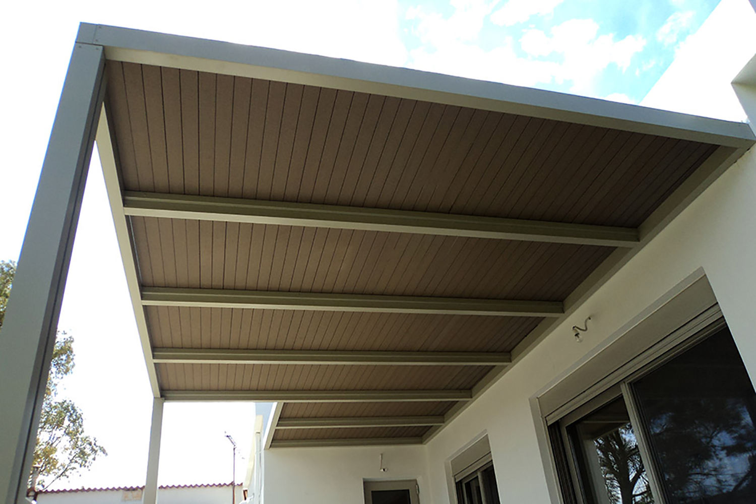 Πέργκολα αλουμινίου σε βεράντα με σκίαση από σταθερές περσίδες από το πολυμερές WPC Rhombus της REHAU.
