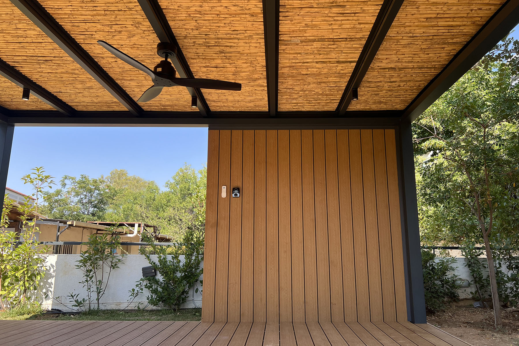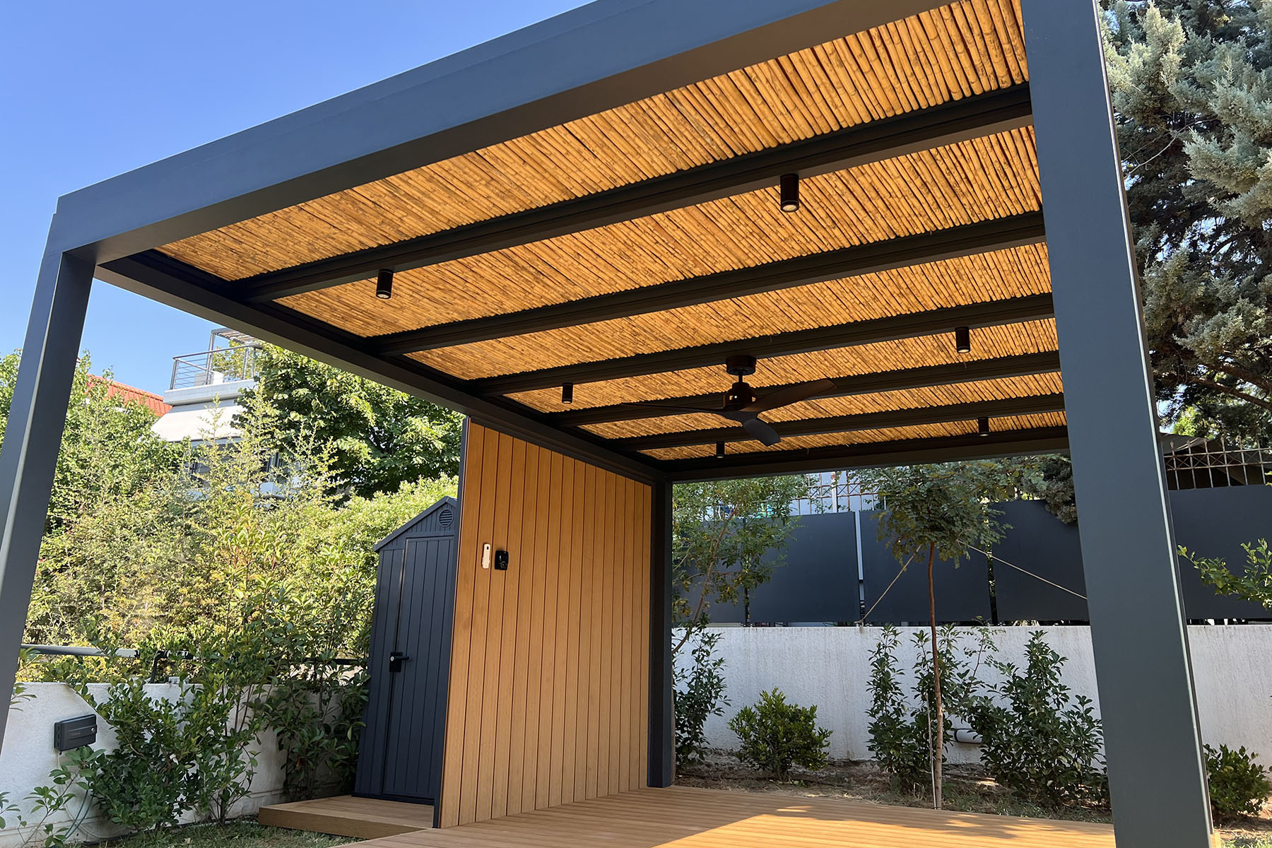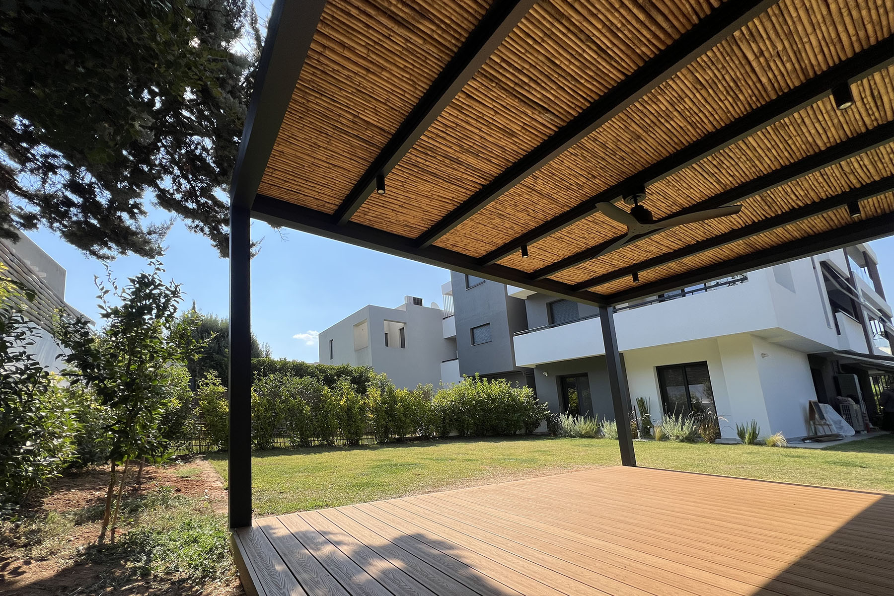 Πέργκολα αλουμινίου σε κήπο, με διπλή στρώση καλαμωτής και διαχωριστικό, καθώς και δάπεδο εξωτερικού χώρου (deck) με συνθετικό wpc wood effect