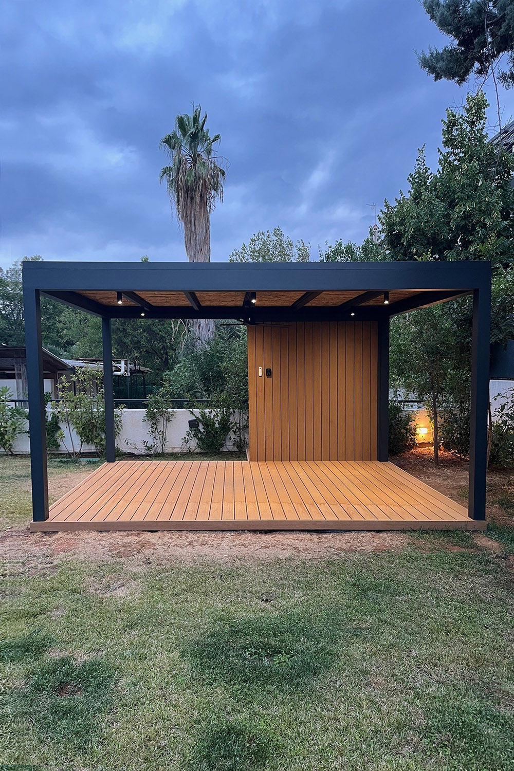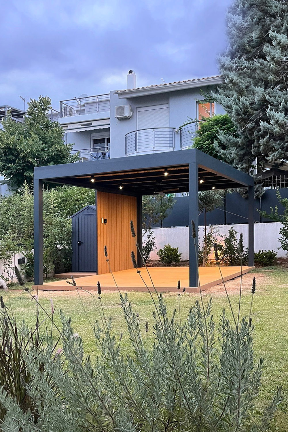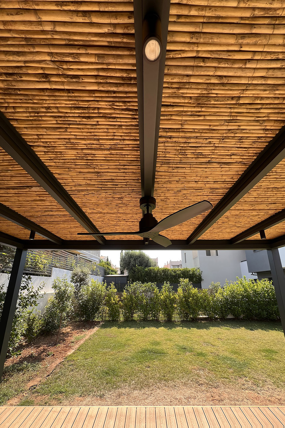 Πέργκολα αλουμινίου σε κήπο, με διπλή στρώση καλαμωτής και διαχωριστικό, καθώς και δάπεδο εξωτερικού χώρου (deck) με συνθετικό wpc wood effect