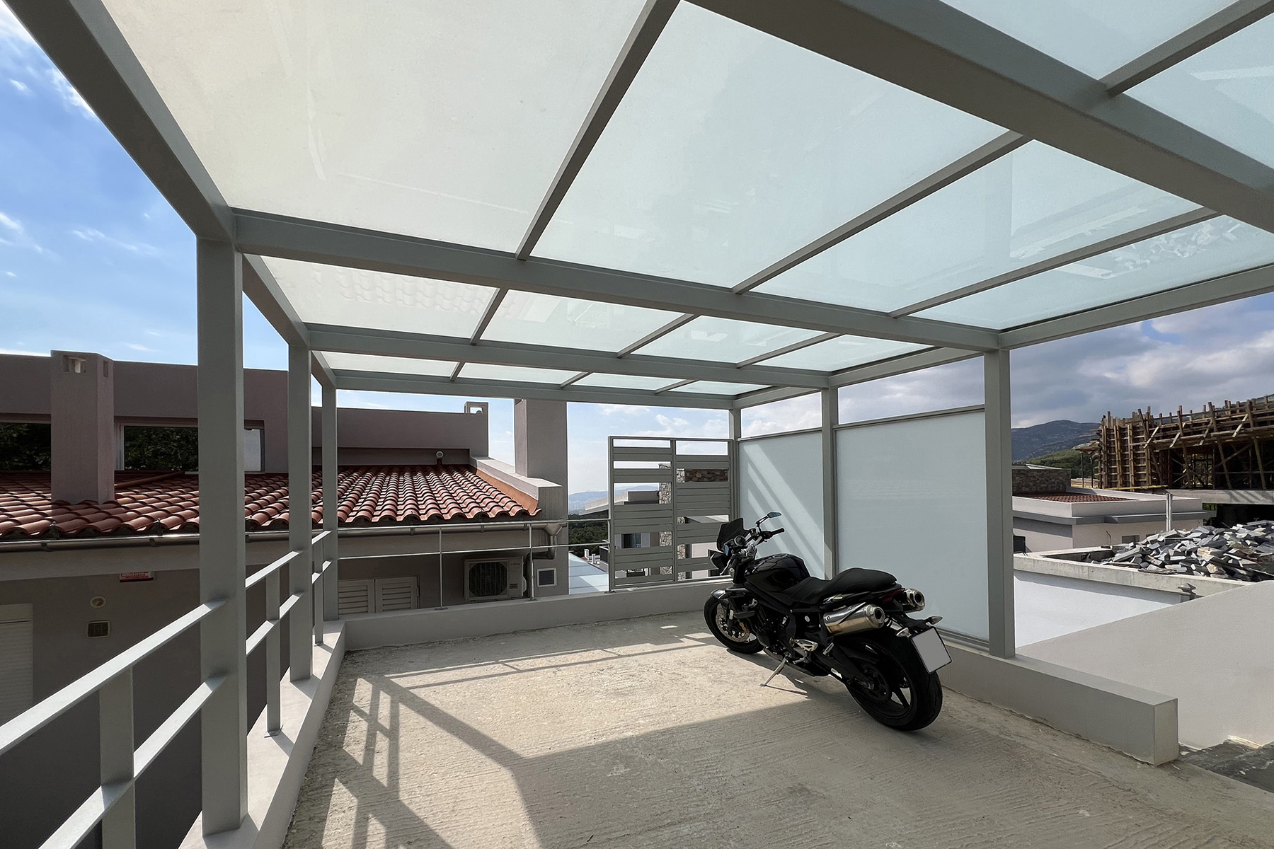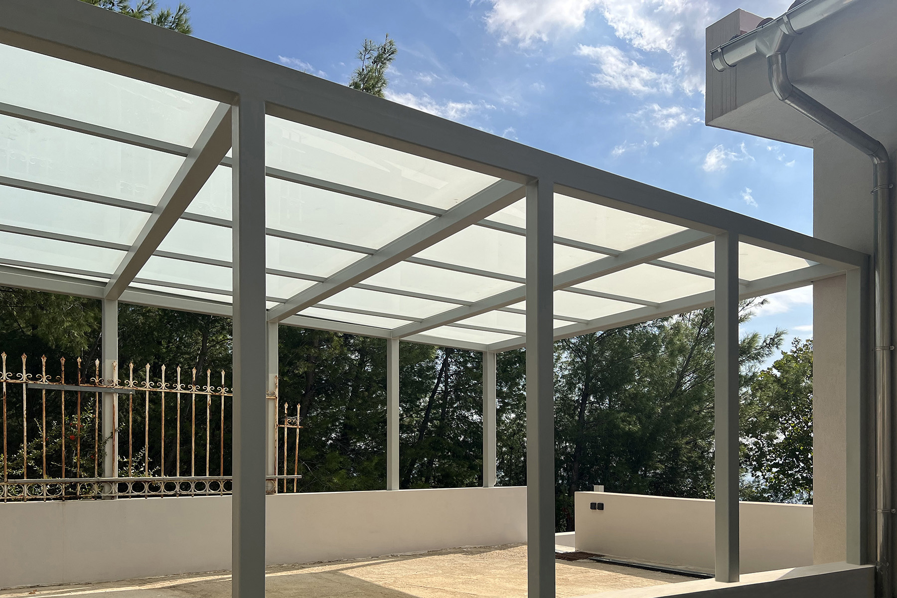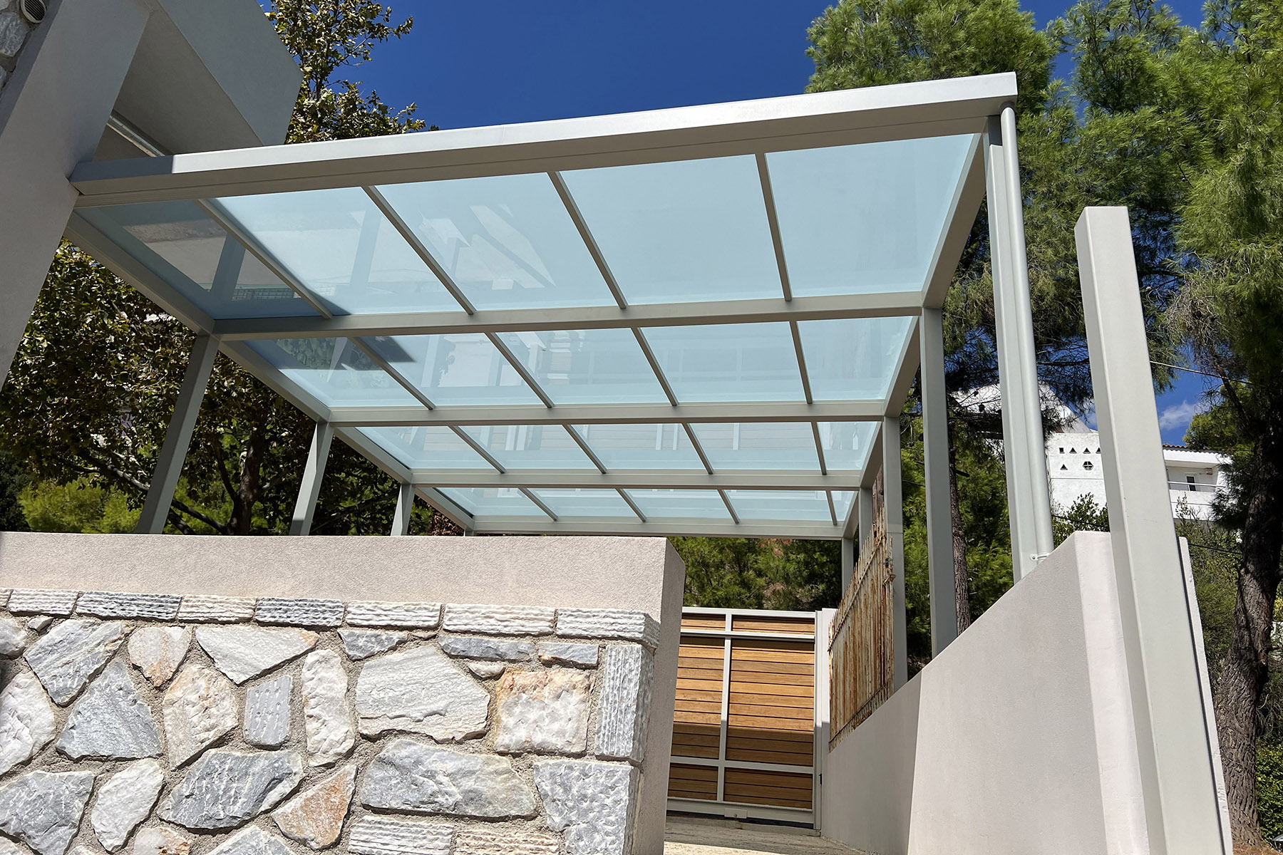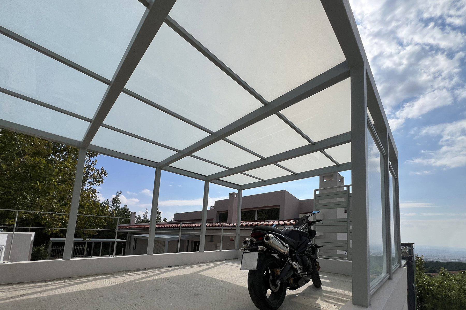 Πέργκολες σε περιβάλλοντα χώρο μονοκατοικίας, με μεταλλικές γαλβανισμένες κοιλοδοκούς και κάλυψη με γυαλί τρίπλεξ ματ.