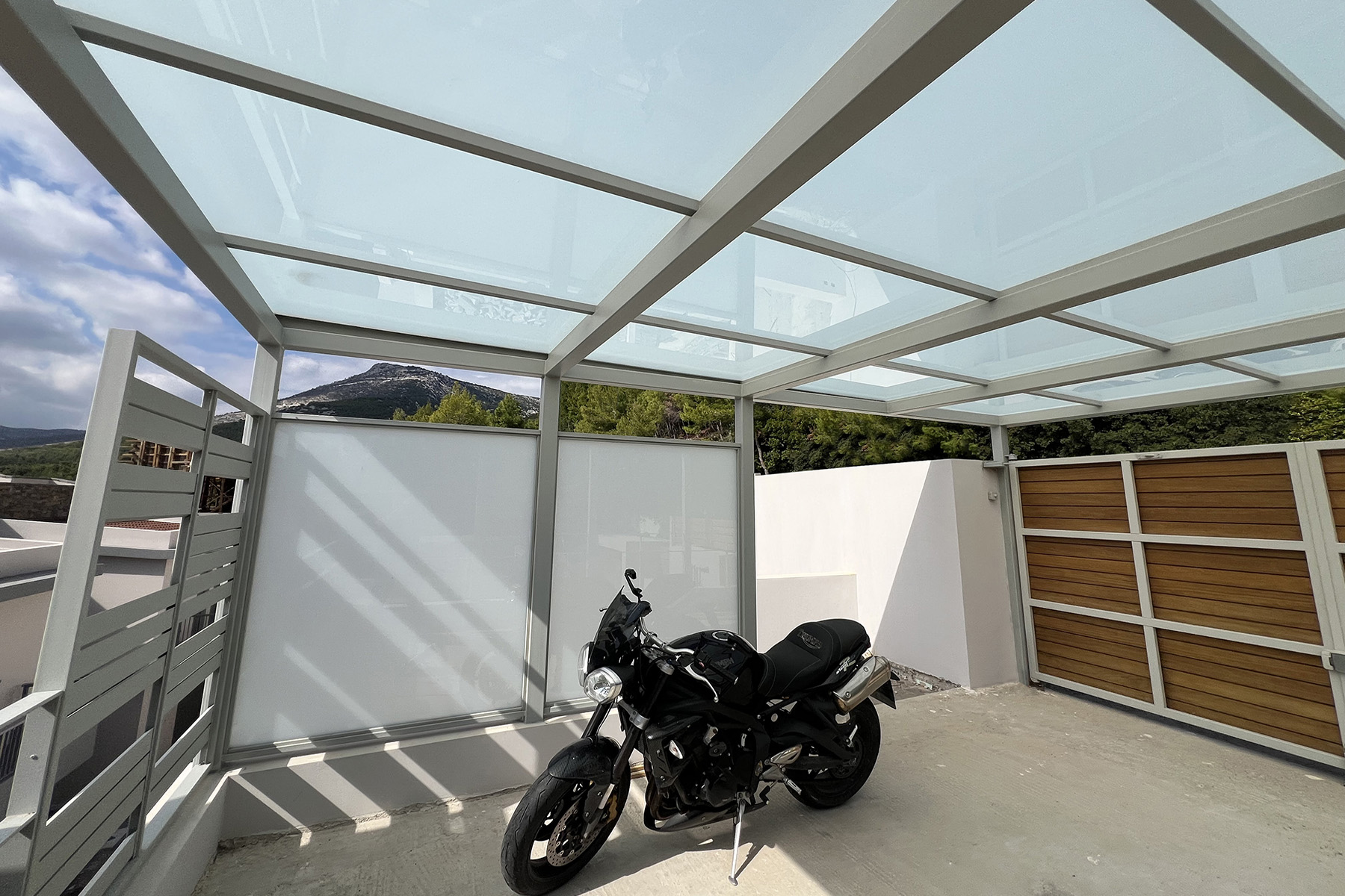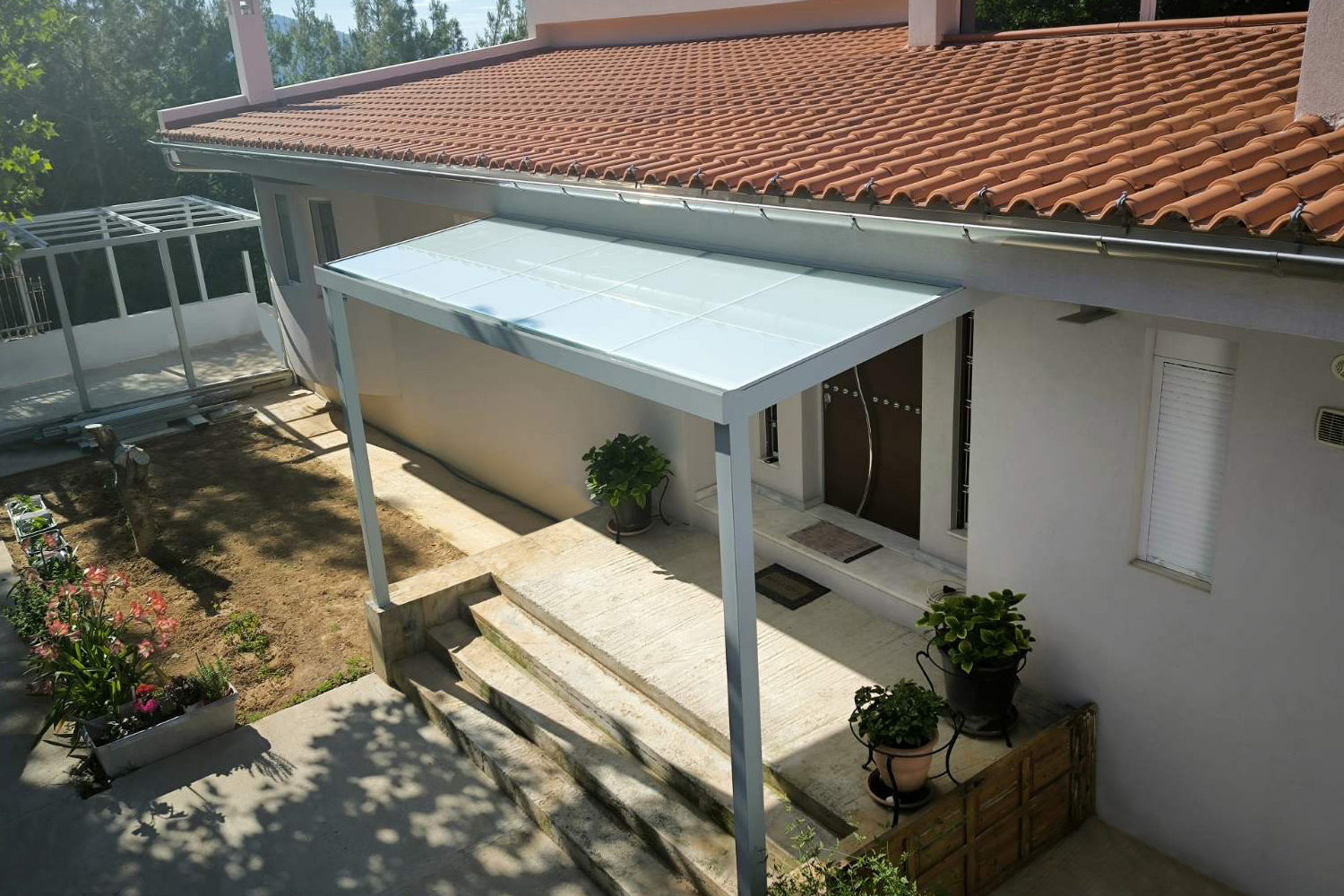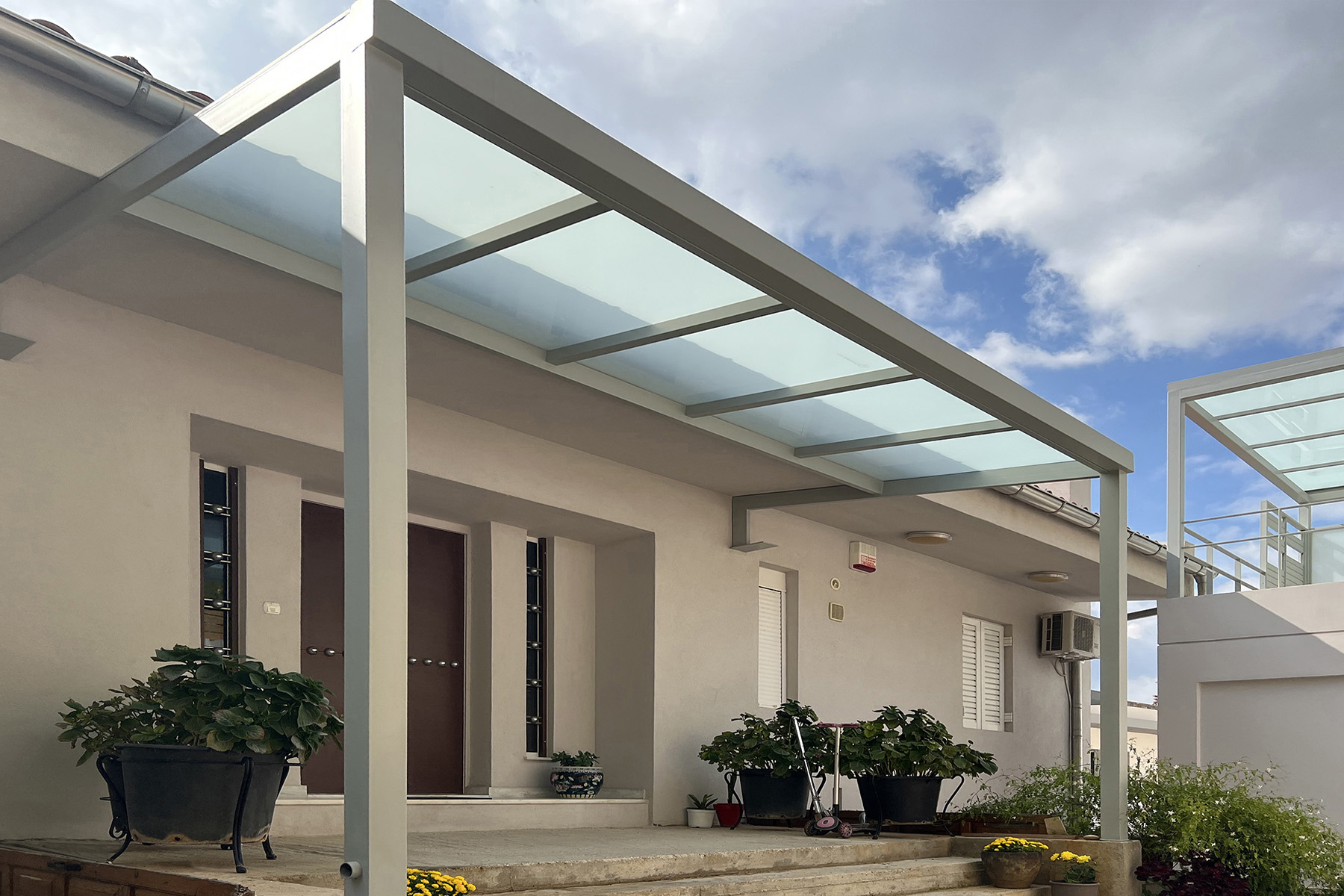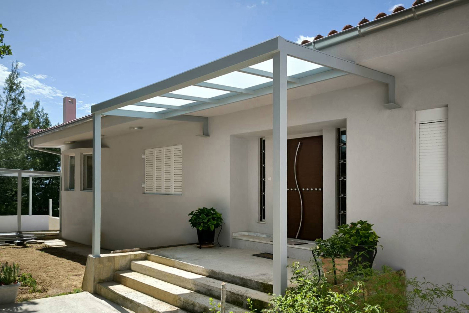 Πέργκολες σε περιβάλλοντα χώρο μονοκατοικίας, με μεταλλικές γαλβανισμένες κοιλοδοκούς και κάλυψη με γυαλί τρίπλεξ ματ.