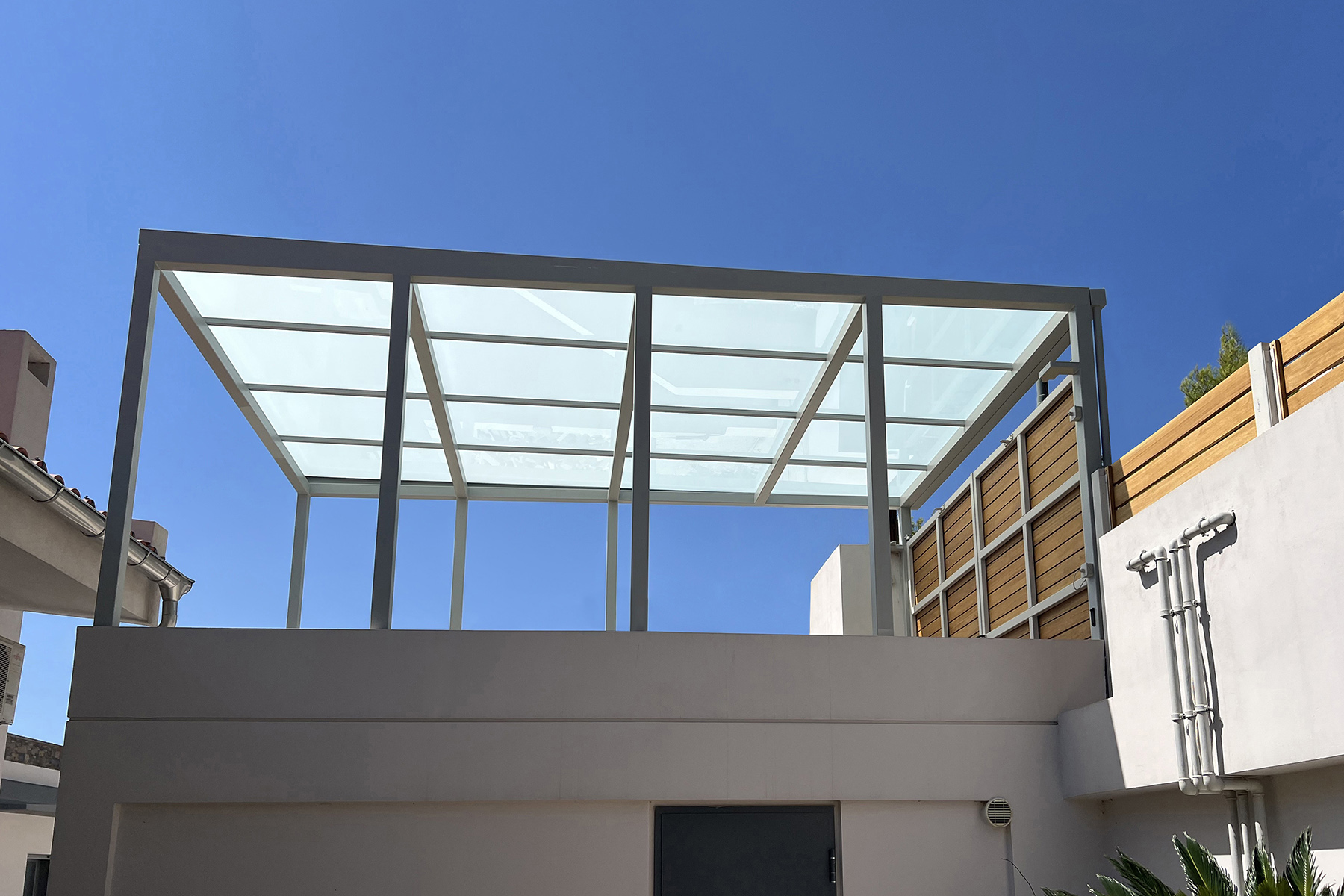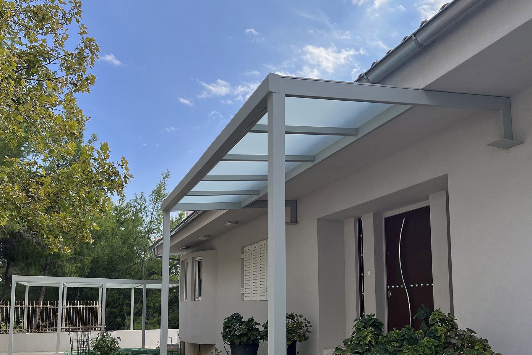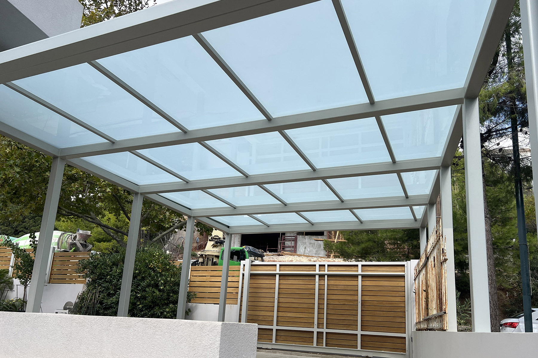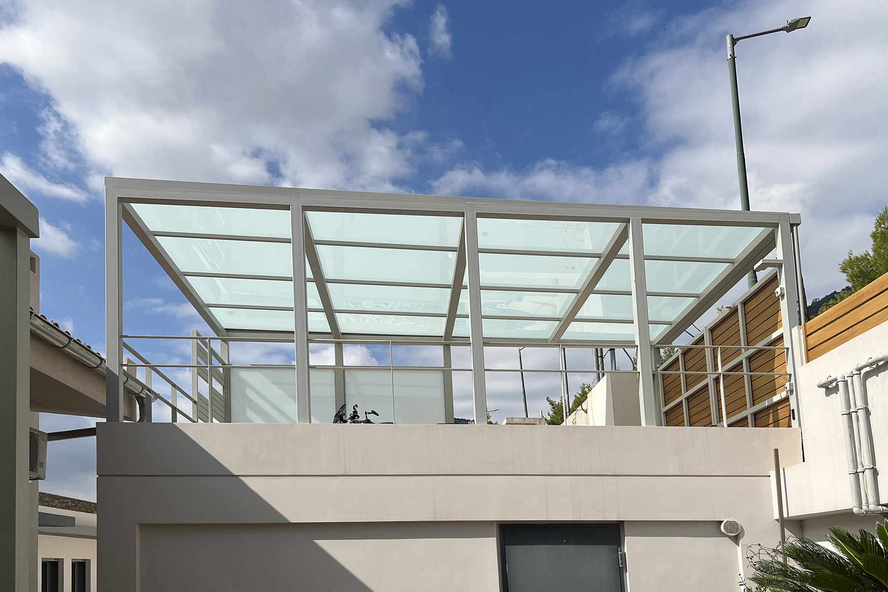 Πέργκολες σε περιβάλλοντα χώρο μονοκατοικίας, με μεταλλικές γαλβανισμένες κοιλοδοκούς και κάλυψη με γυαλί τρίπλεξ ματ.