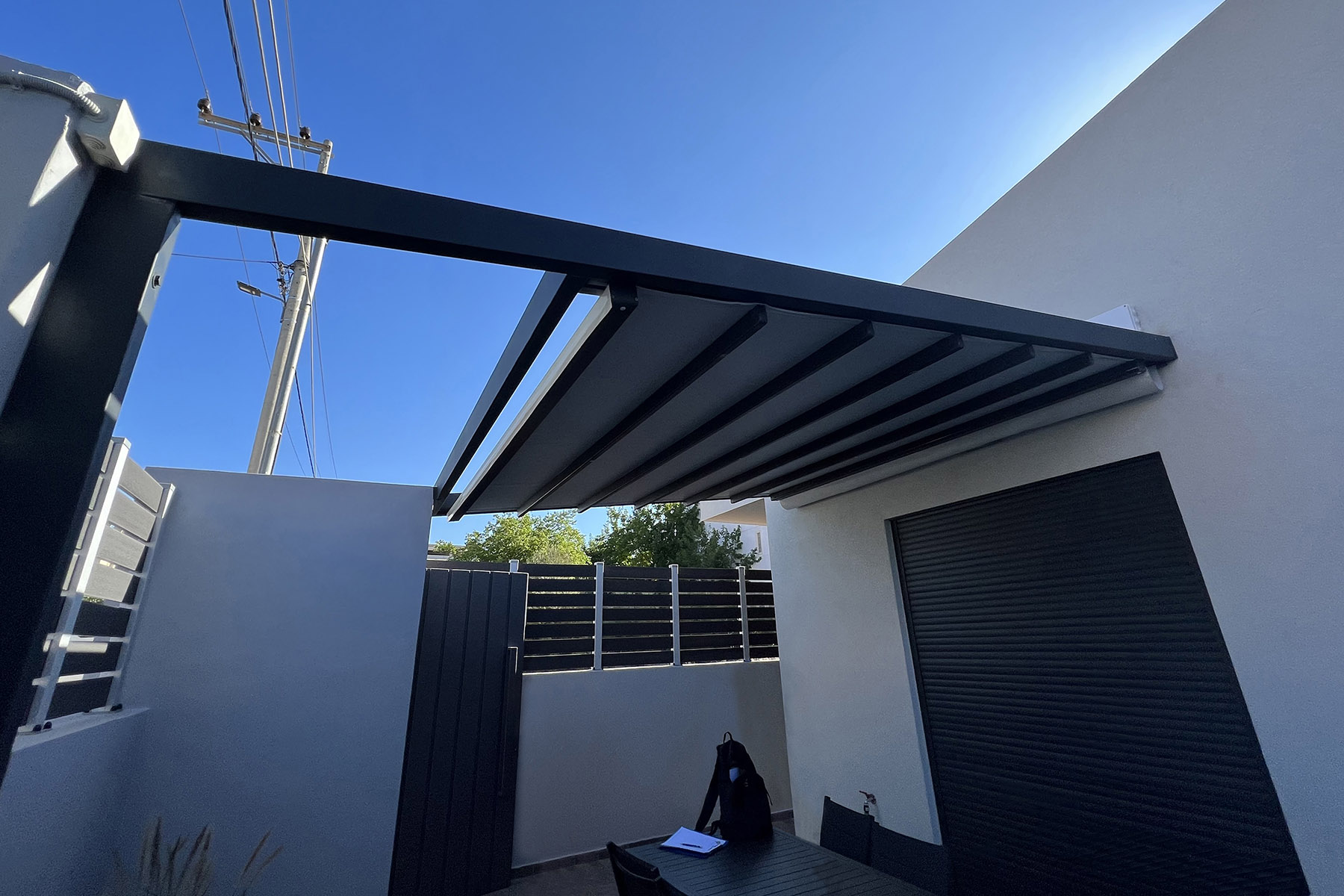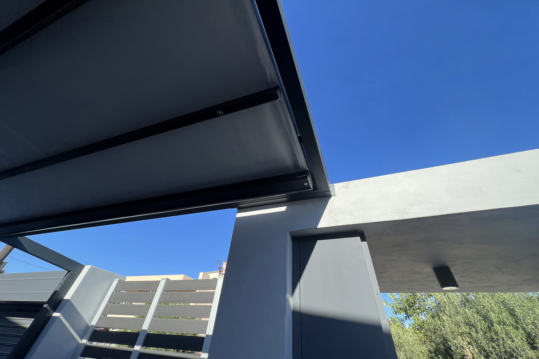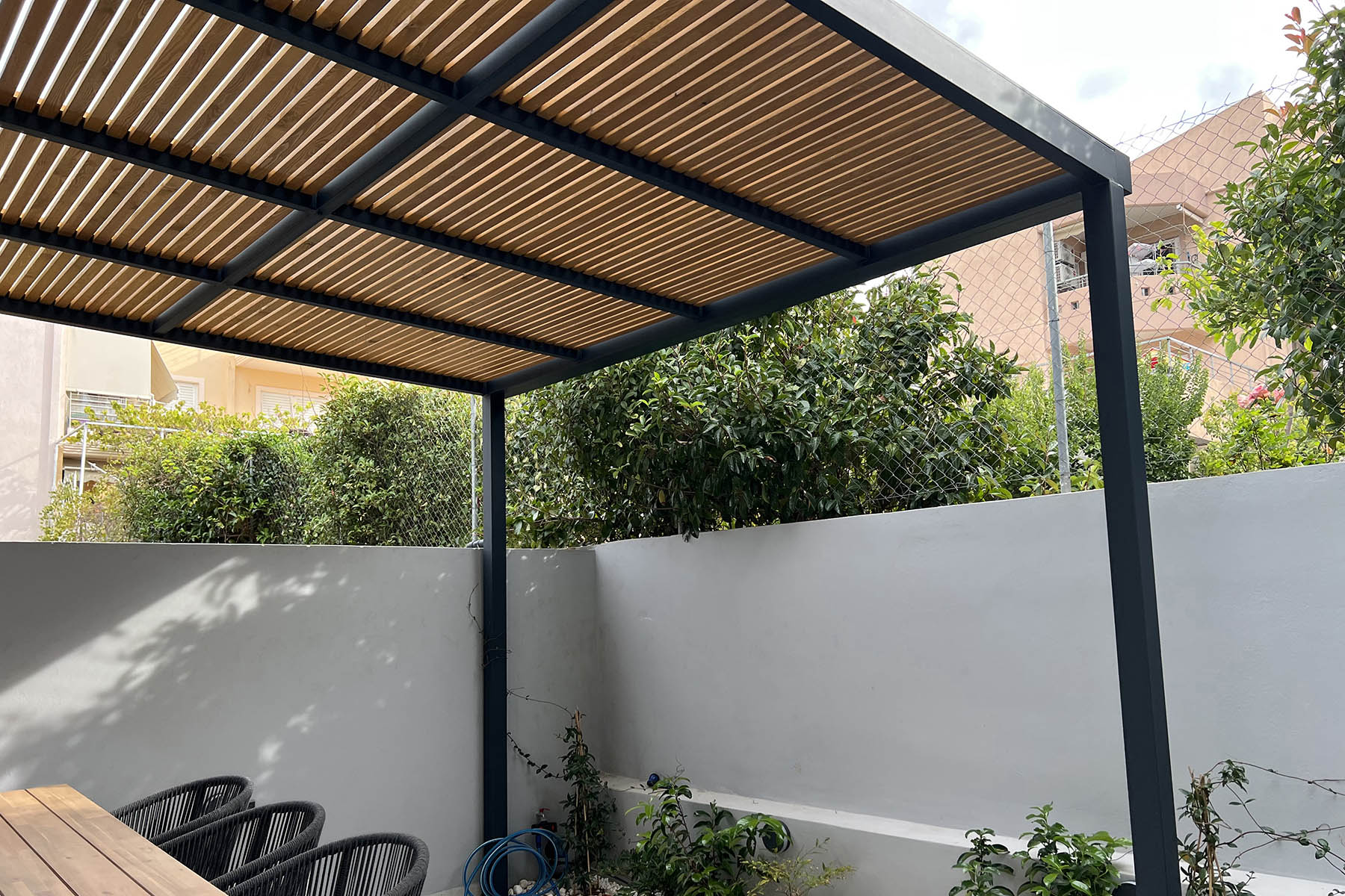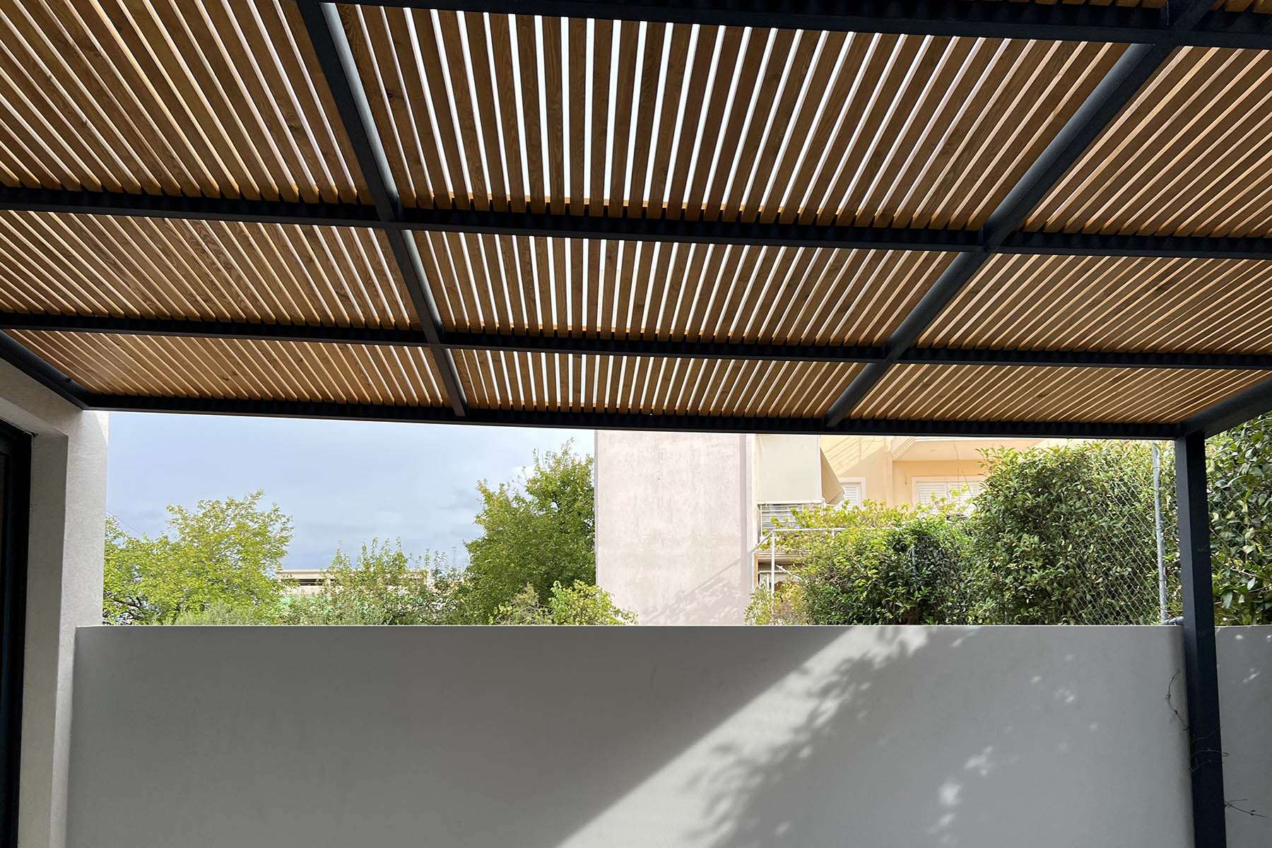 Πέργκολες και στέγαστρο στον Γέρακα σε ισόγειο χώρο με διαφορετικές επιλογές οροφής. Στην πρόσοψη του σπιτιού η επιλογή ήταν εύκολη: μεικτή κατασκευή με μεταλλικό σκελετό και γυαλί για στεγάνωση στην πέργκολα αλλά και στο στέγαστρο της εισόδου, που κατασκευάστηκε ως συνέχεια της πέργκολας και ξύλινο σκίαστρο για δροσερή σκιά όλες τις εποχές. Στο 2ο σημείο επιλέχθηκε περγκοσύστημα, ηλεκτροκίνητο με τηλεχειριστήριο και εργοστασιακά ενσωματωμένο φωτισμό.