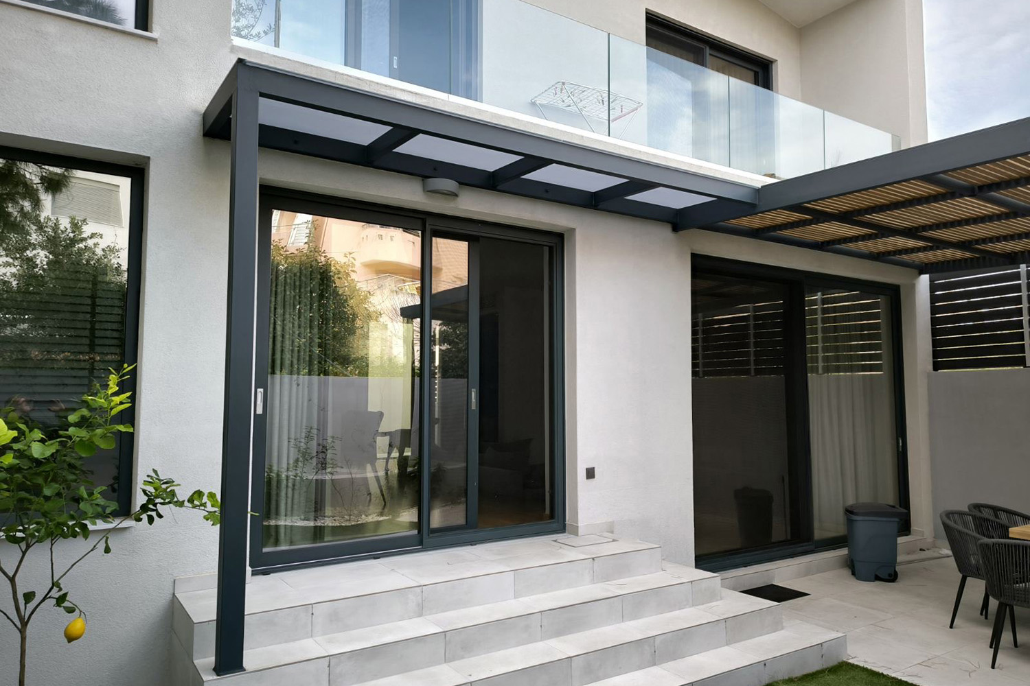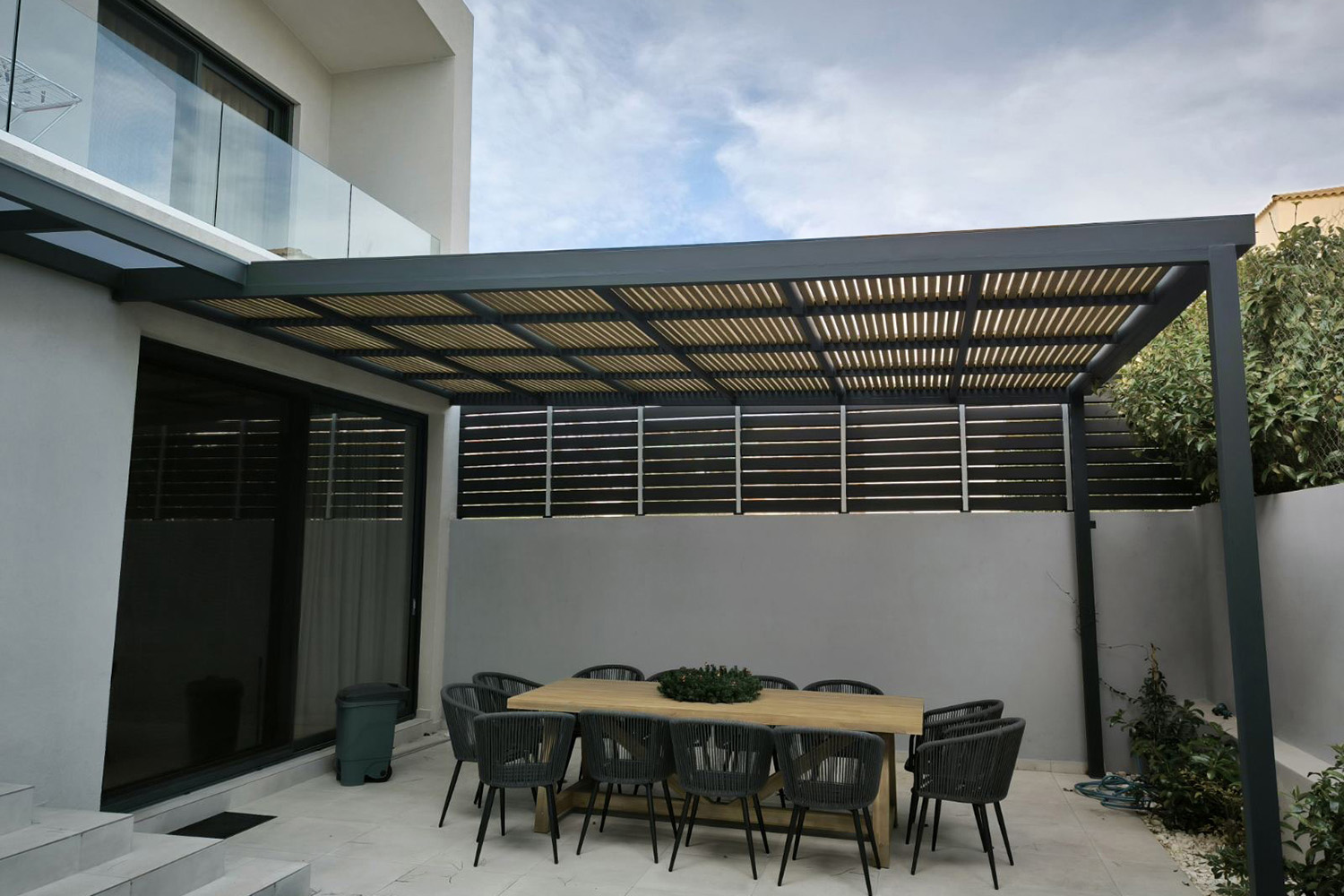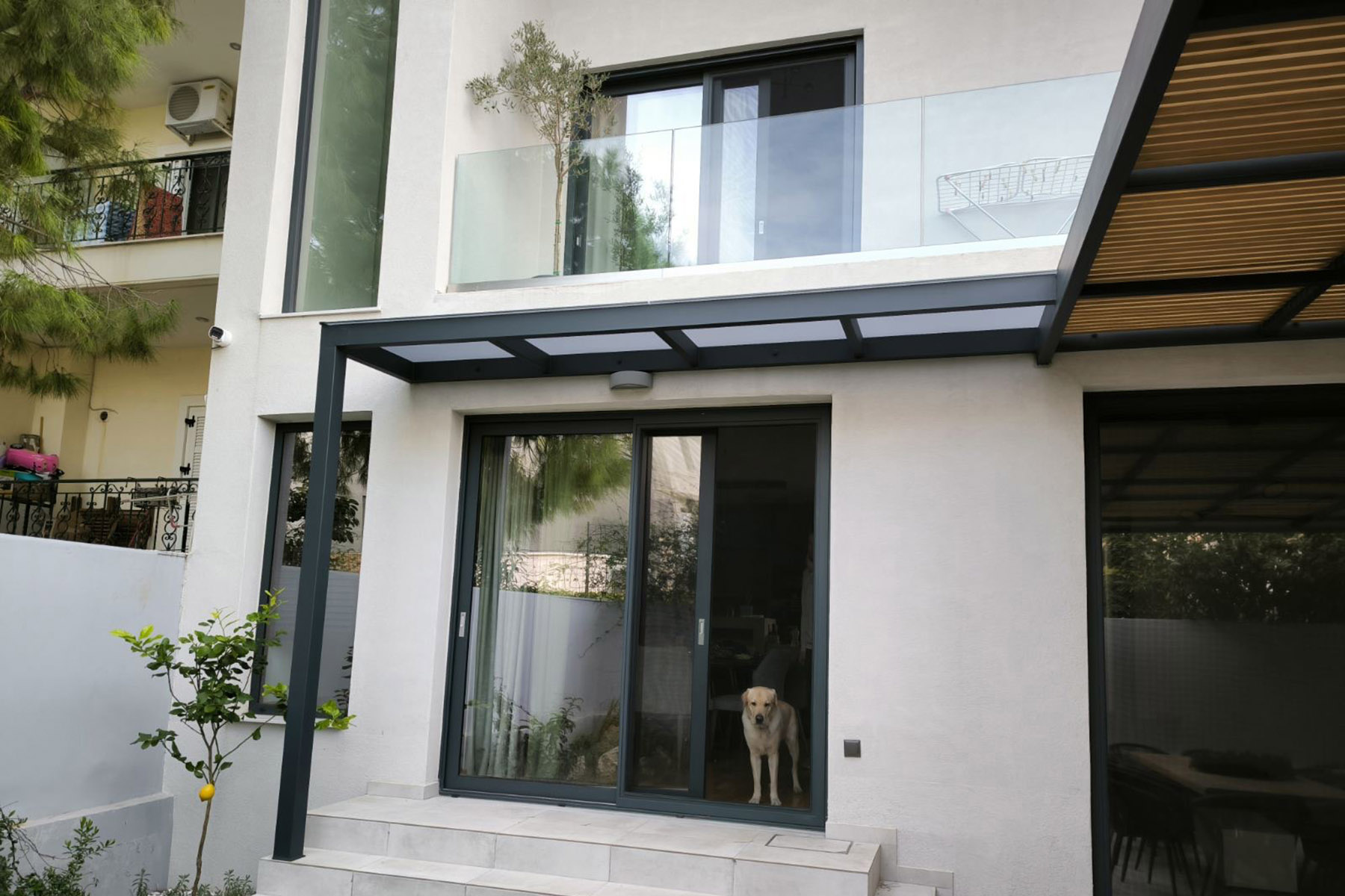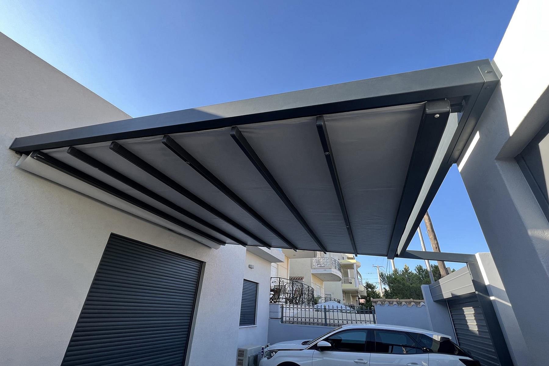 Πέργκολες και στέγαστρο στον Γέρακα σε ισόγειο χώρο με διαφορετικές επιλογές οροφής. Στην πρόσοψη του σπιτιού η επιλογή ήταν εύκολη: μεικτή κατασκευή με μεταλλικό σκελετό και γυαλί για στεγάνωση στην πέργκολα αλλά και στο στέγαστρο της εισόδου, που κατασκευάστηκε ως συνέχεια της πέργκολας και ξύλινο σκίαστρο για δροσερή σκιά όλες τις εποχές. Στο 2ο σημείο επιλέχθηκε περγκοσύστημα, ηλεκτροκίνητο με τηλεχειριστήριο και εργοστασιακά ενσωματωμένο φωτισμό.