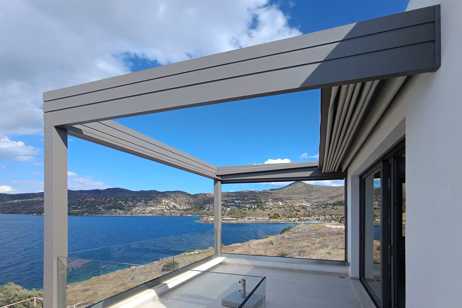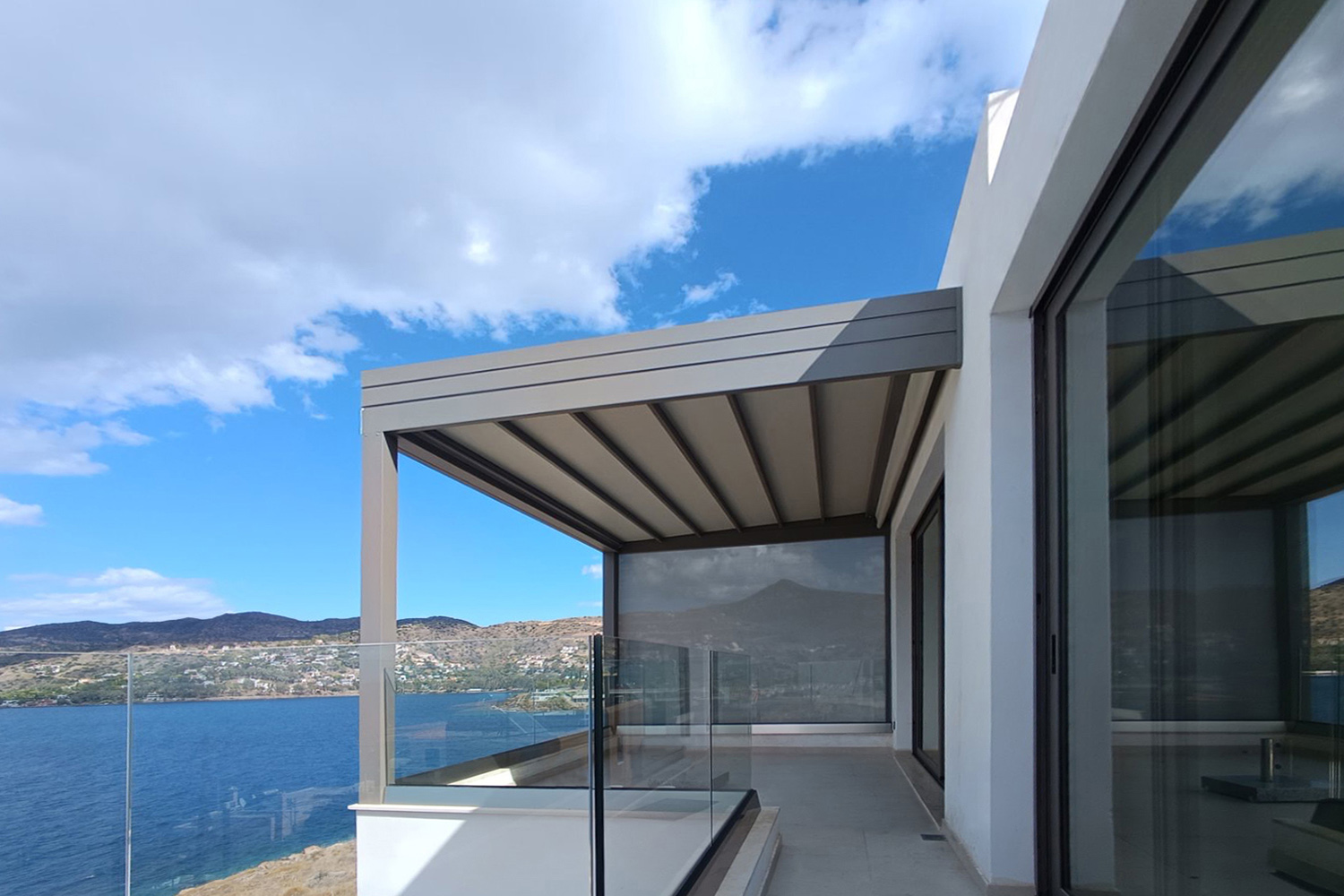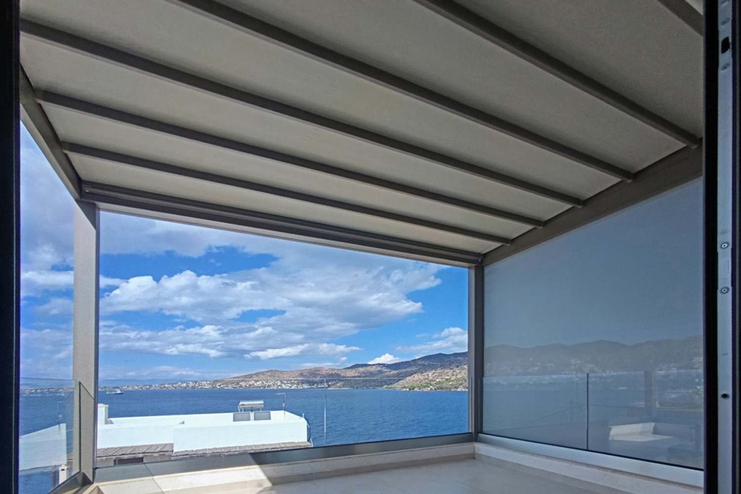 Πέργκολα σε οικία στην Αίγινα, με περγκοσύστημα και πλαϊνή κάλυψη με σύστημα ZIP. Και τα δύο συστήματα είναι ηλεκτροκίνητα και λειτουργούν με κοινό τηλεχειριστήριο