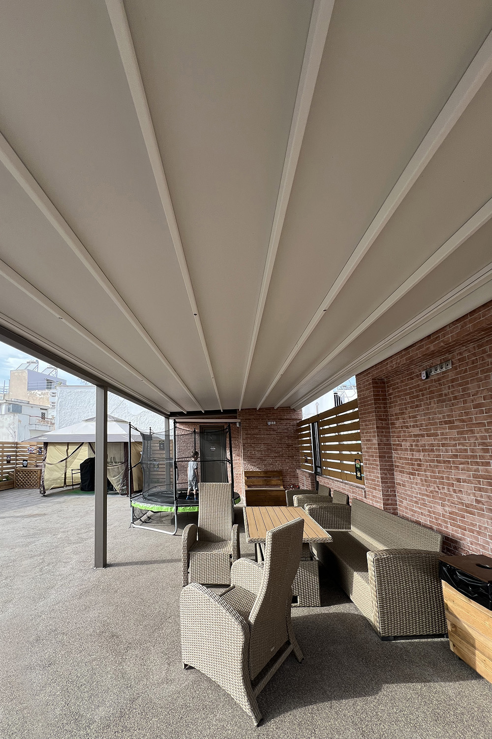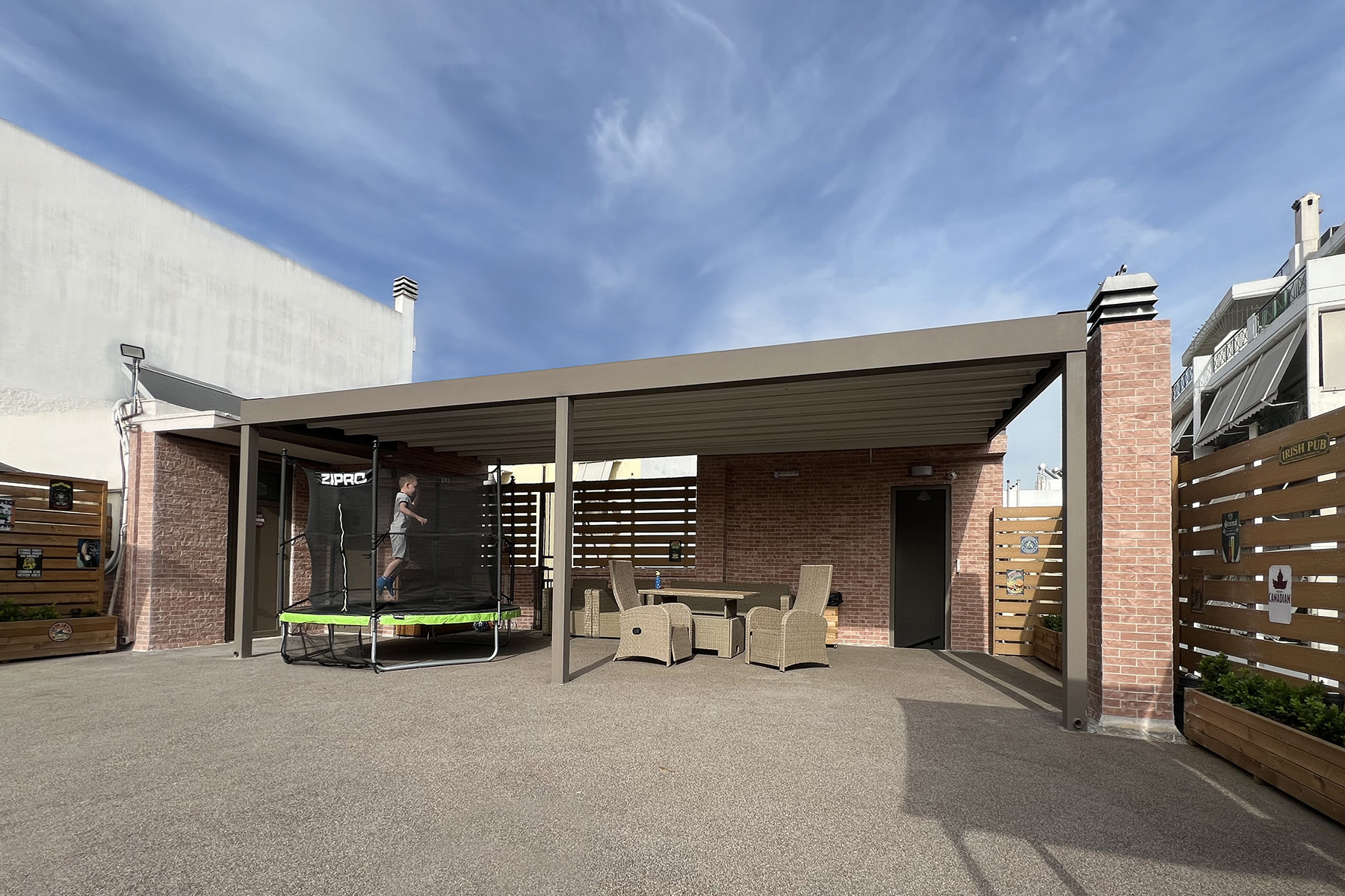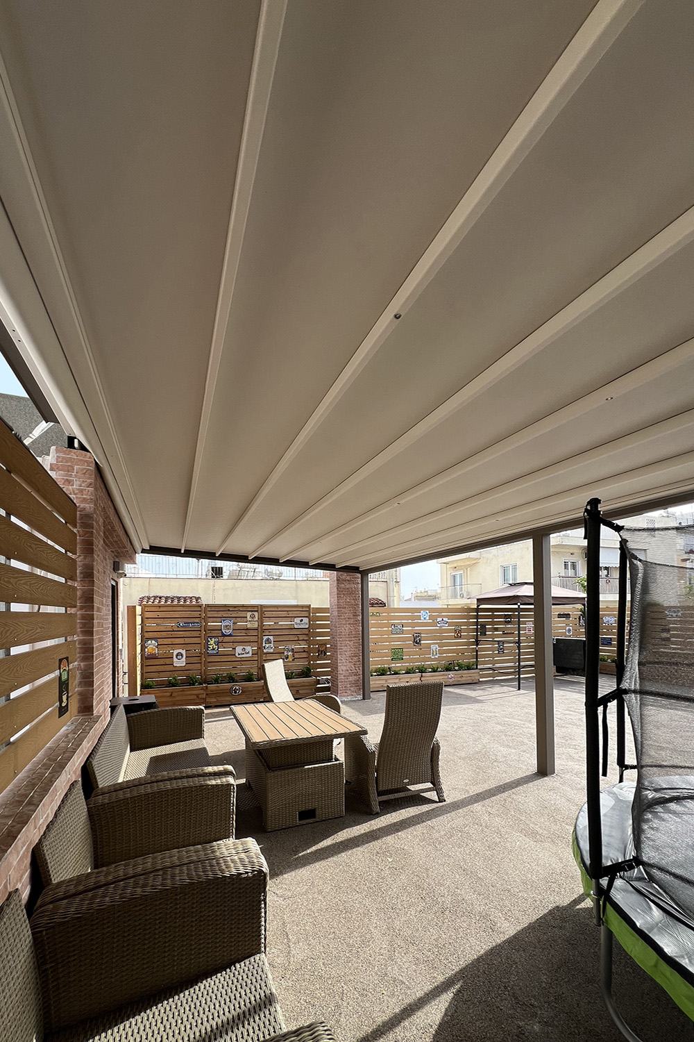 Eγκιβωτισμένο περγκοσύστημα σε ταράτσα, ηλεκτροκίνητο με τηλεχειριστήριο και φωτισμό με spot led με dimmer