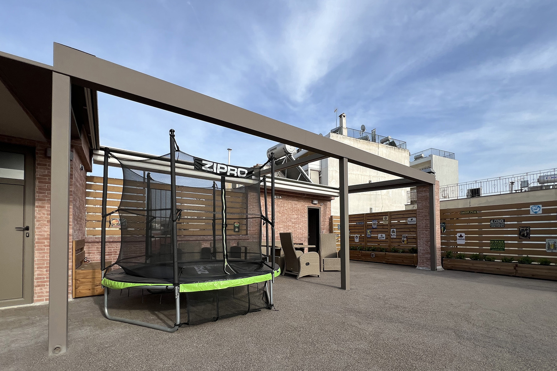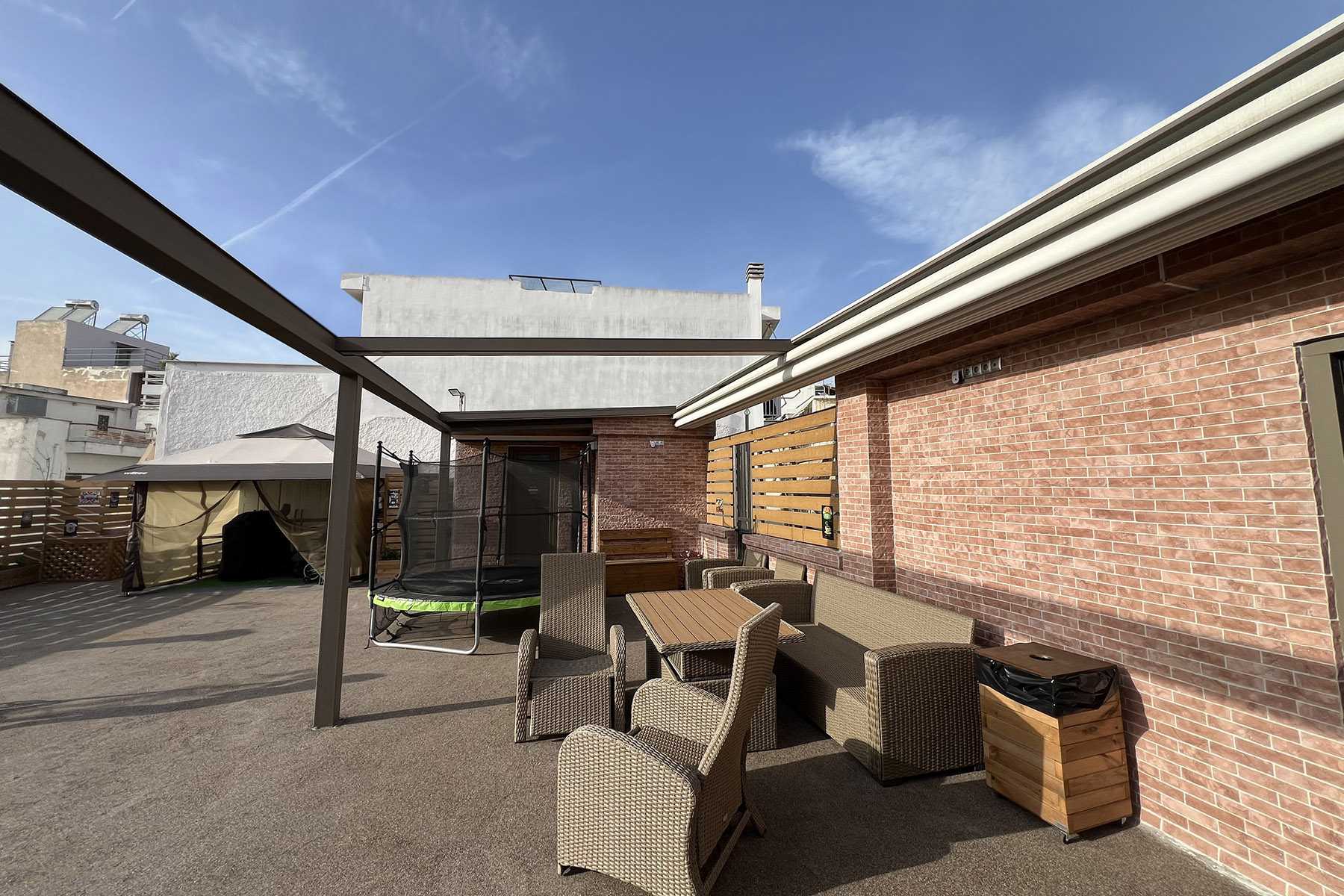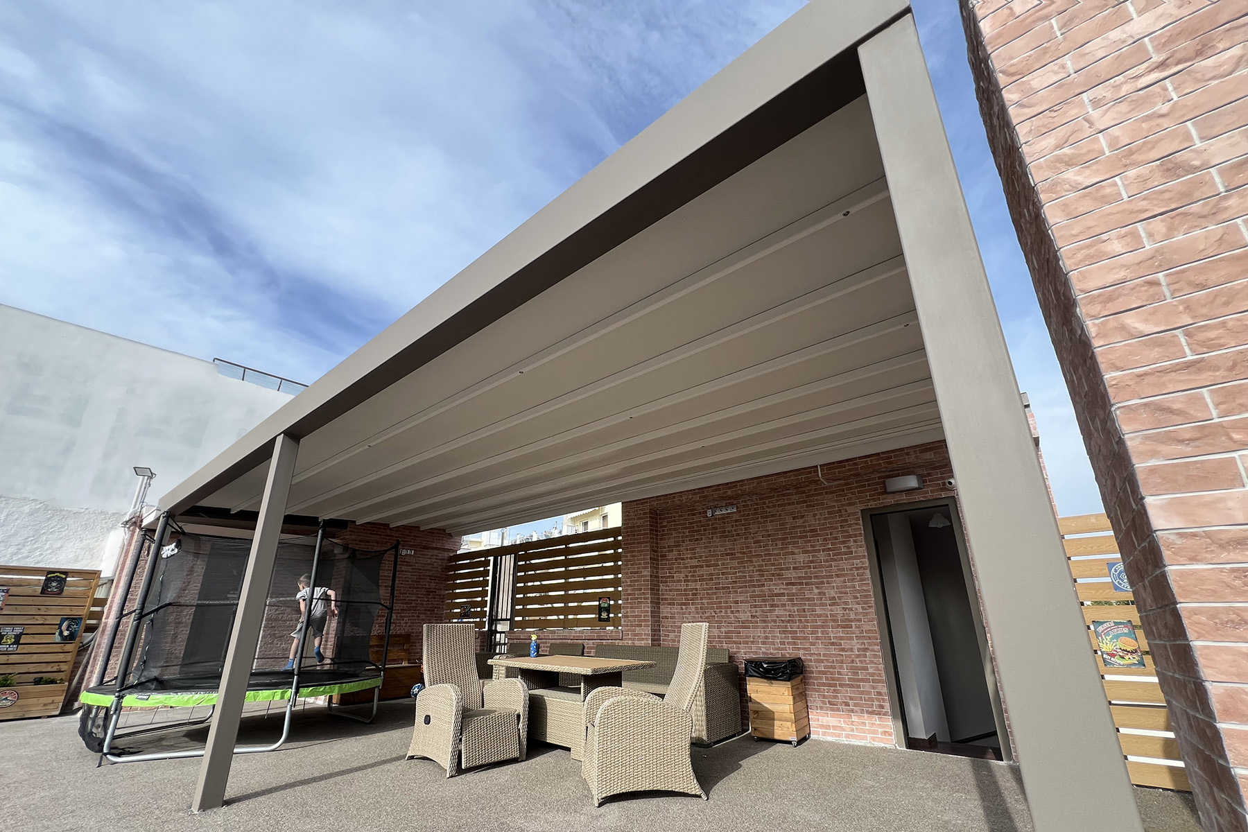 Eγκιβωτισμένο περγκοσύστημα σε ταράτσα, ηλεκτροκίνητο με τηλεχειριστήριο και φωτισμό με spot led με dimmer