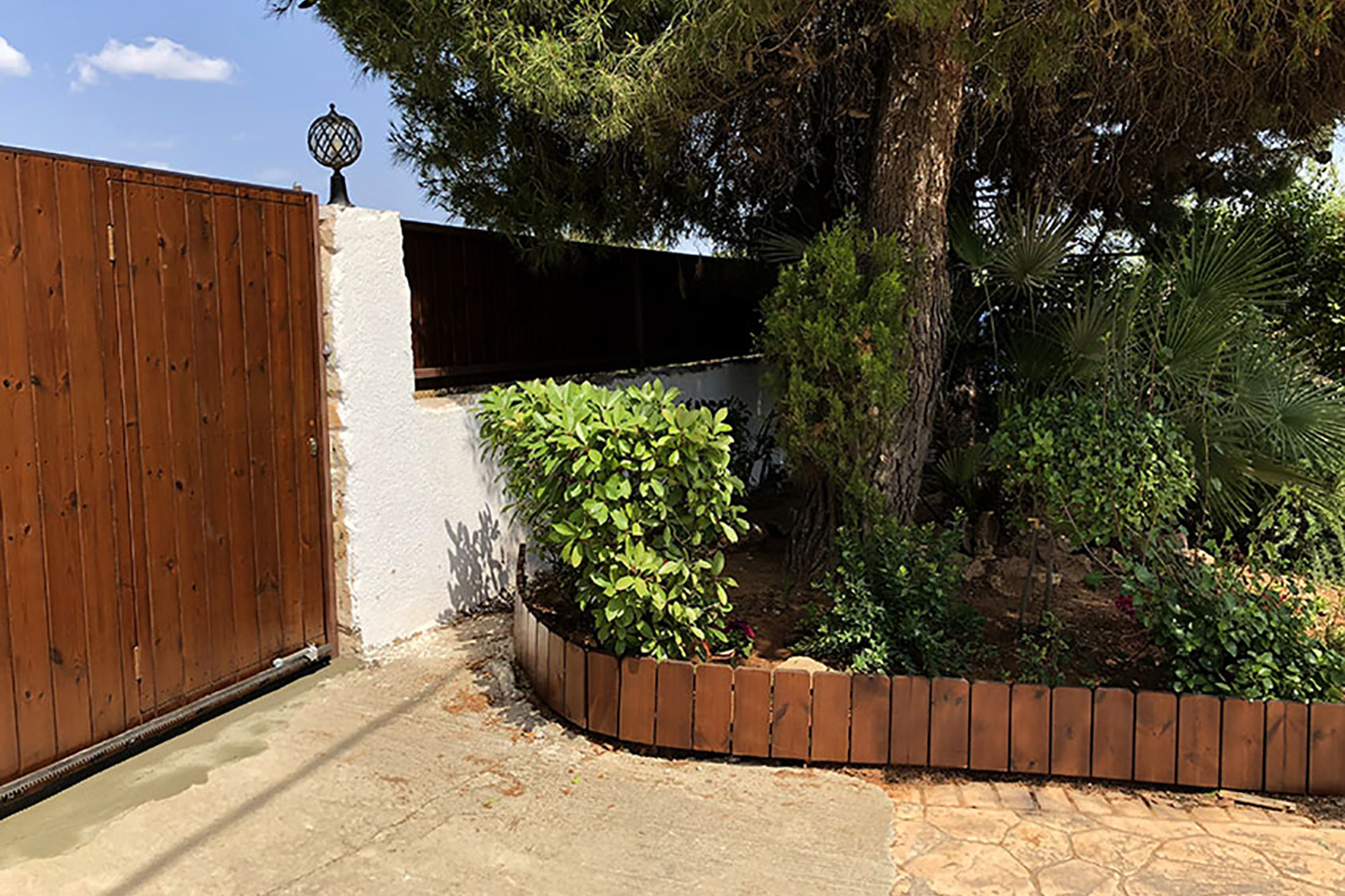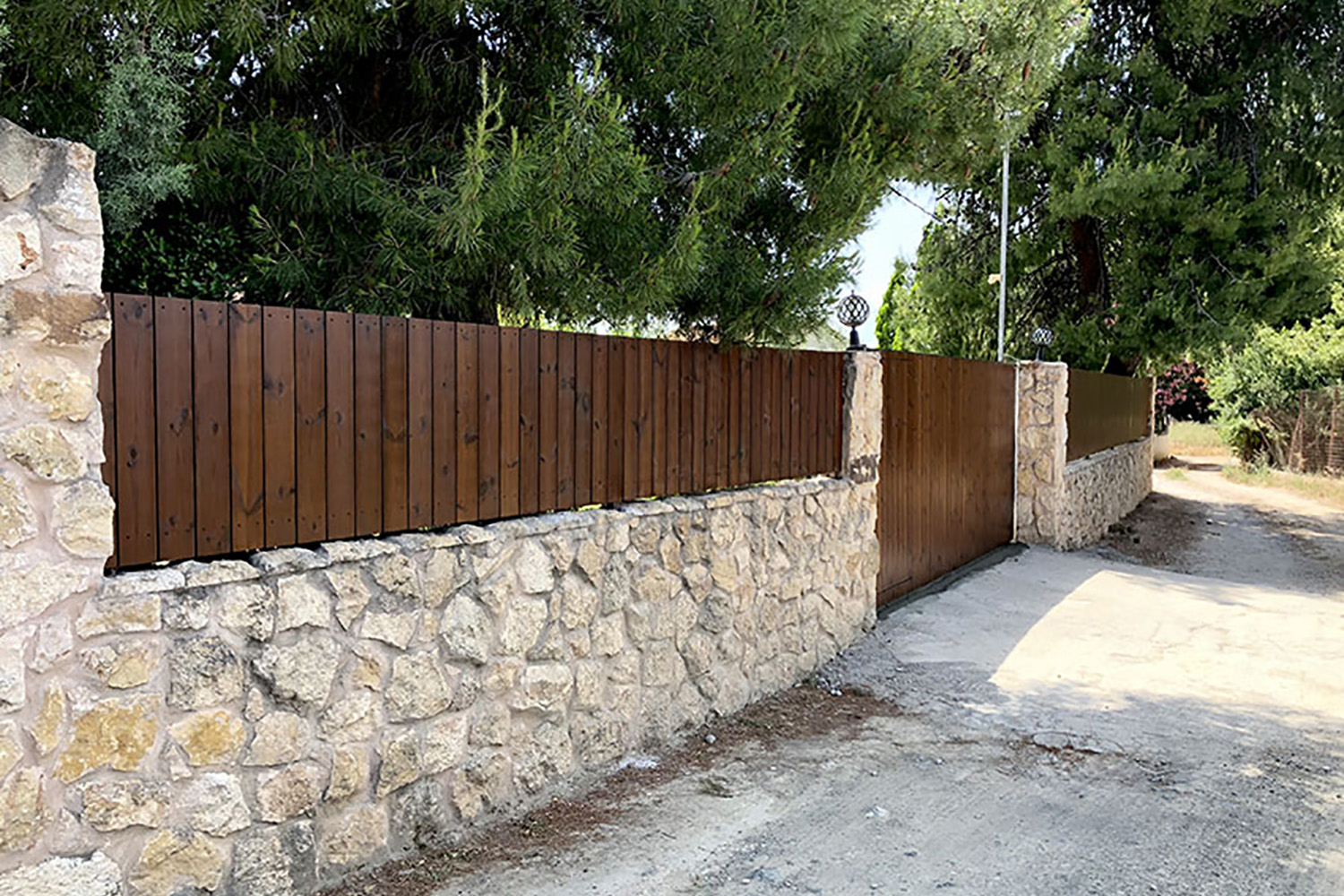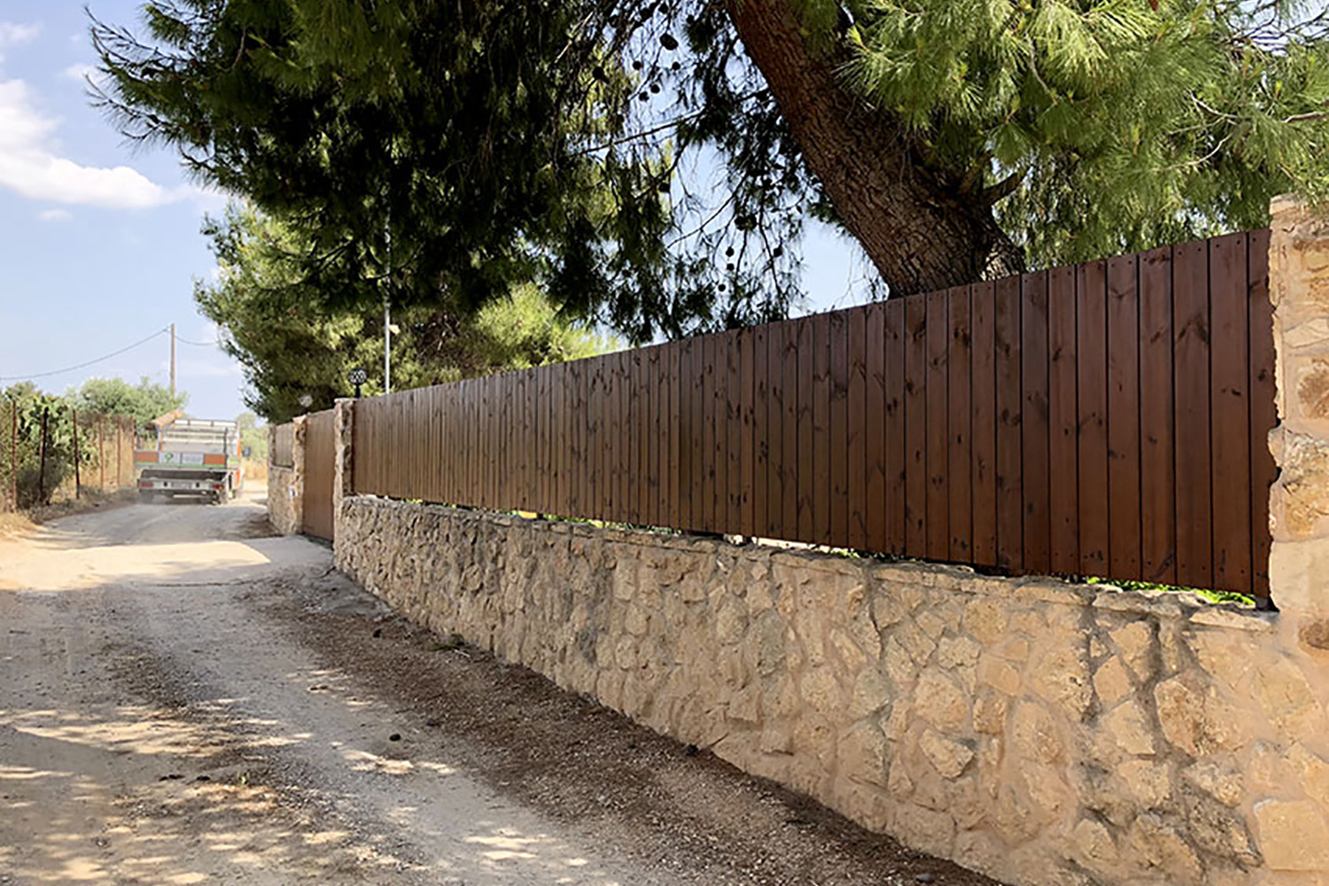 Περίφραξη από Thermowood σε μονοκατοικία αποτελούμενη από μεταλλικό γαλβανισμένο σκελετό και επένδυση με κάθετες σανίδες από ξυλεία πεύκης thermowood.