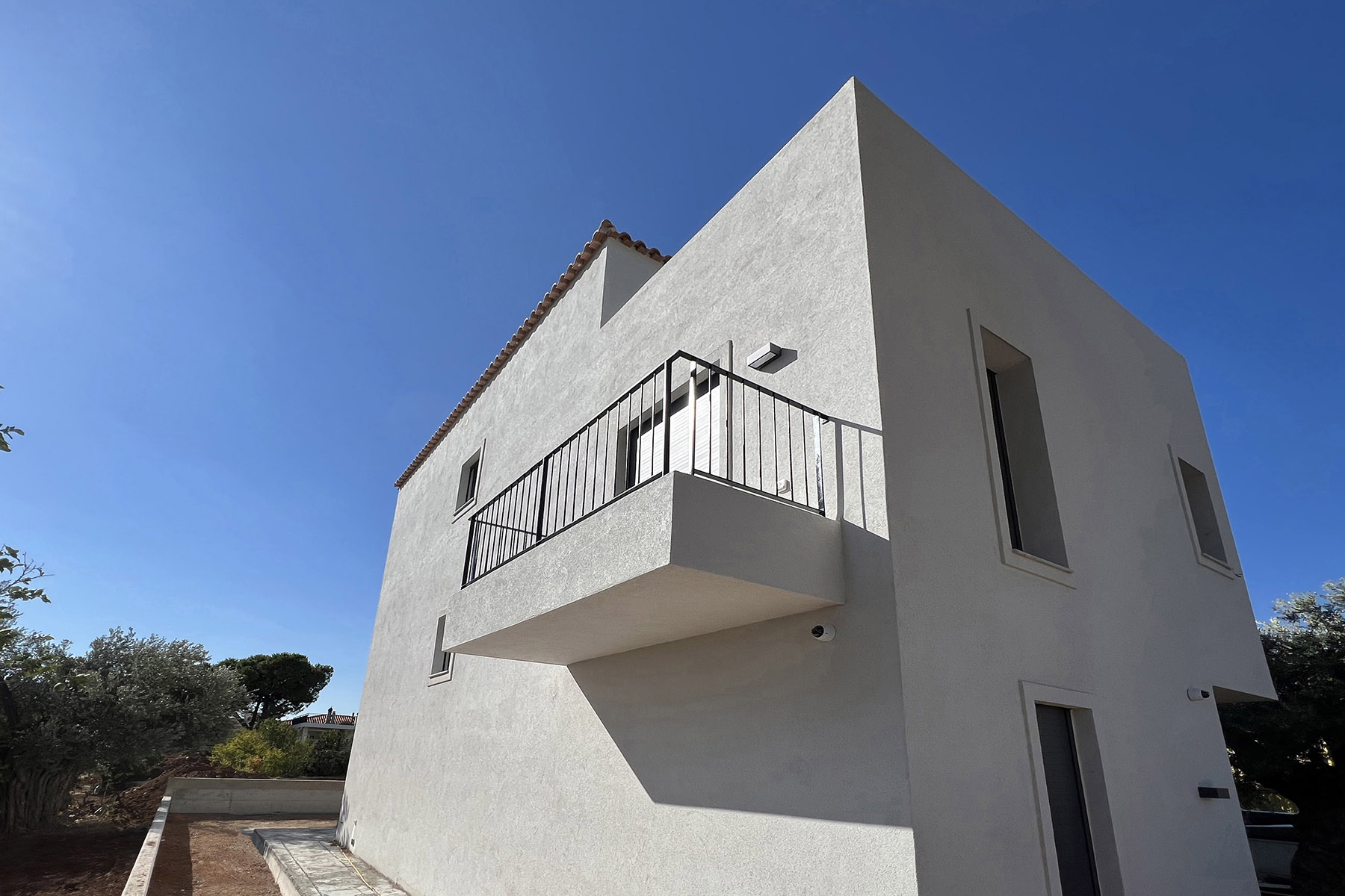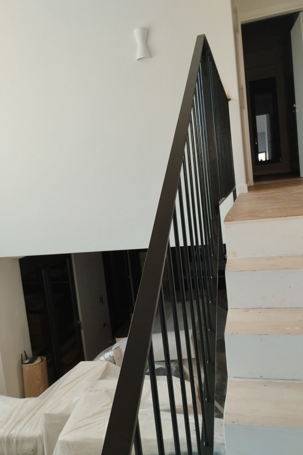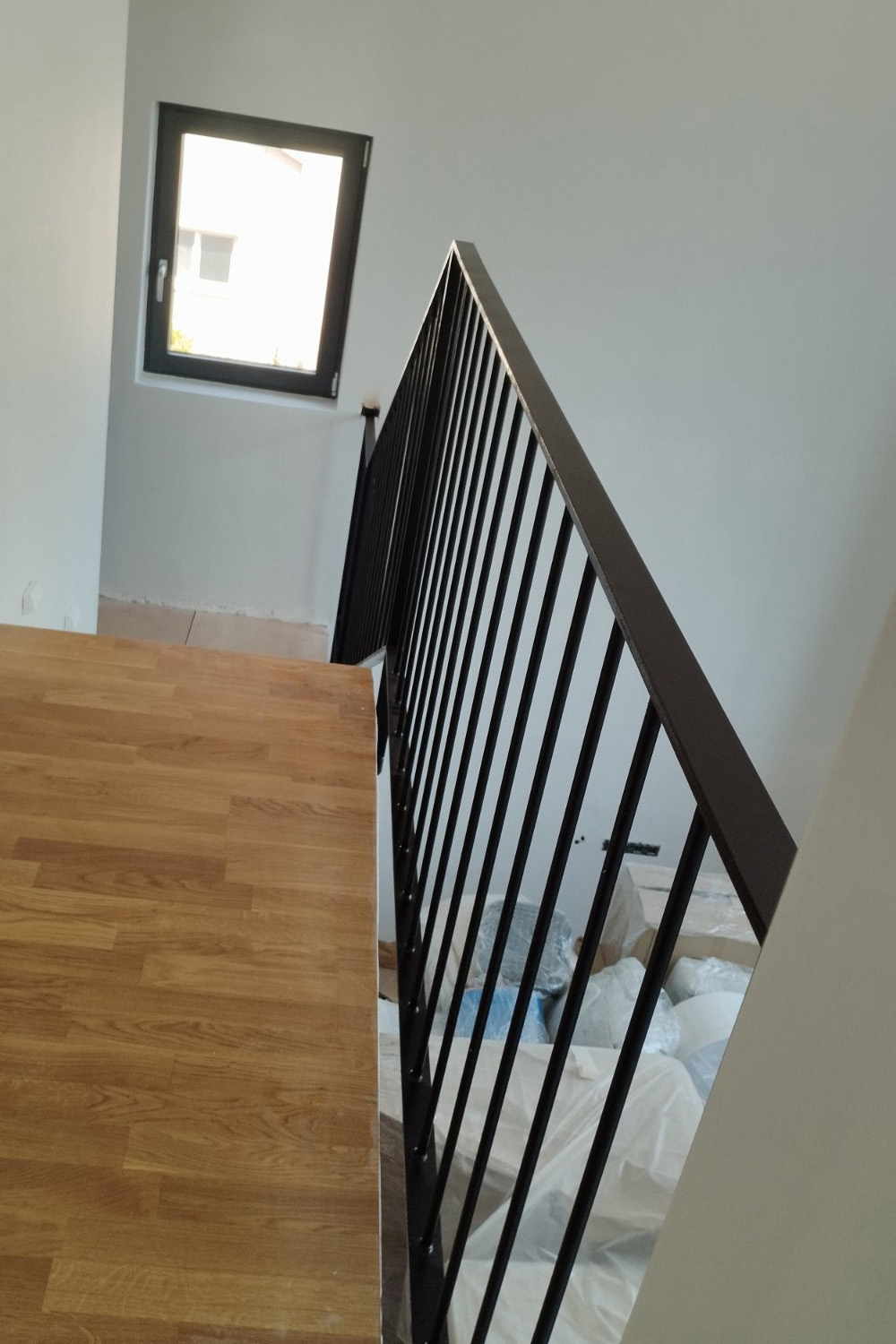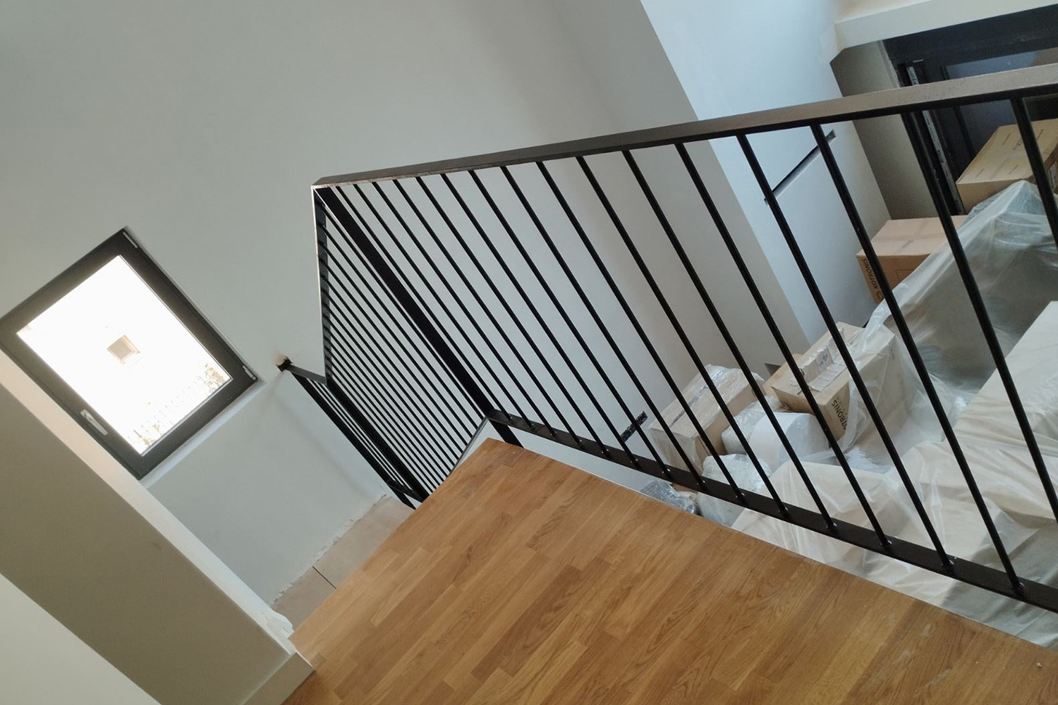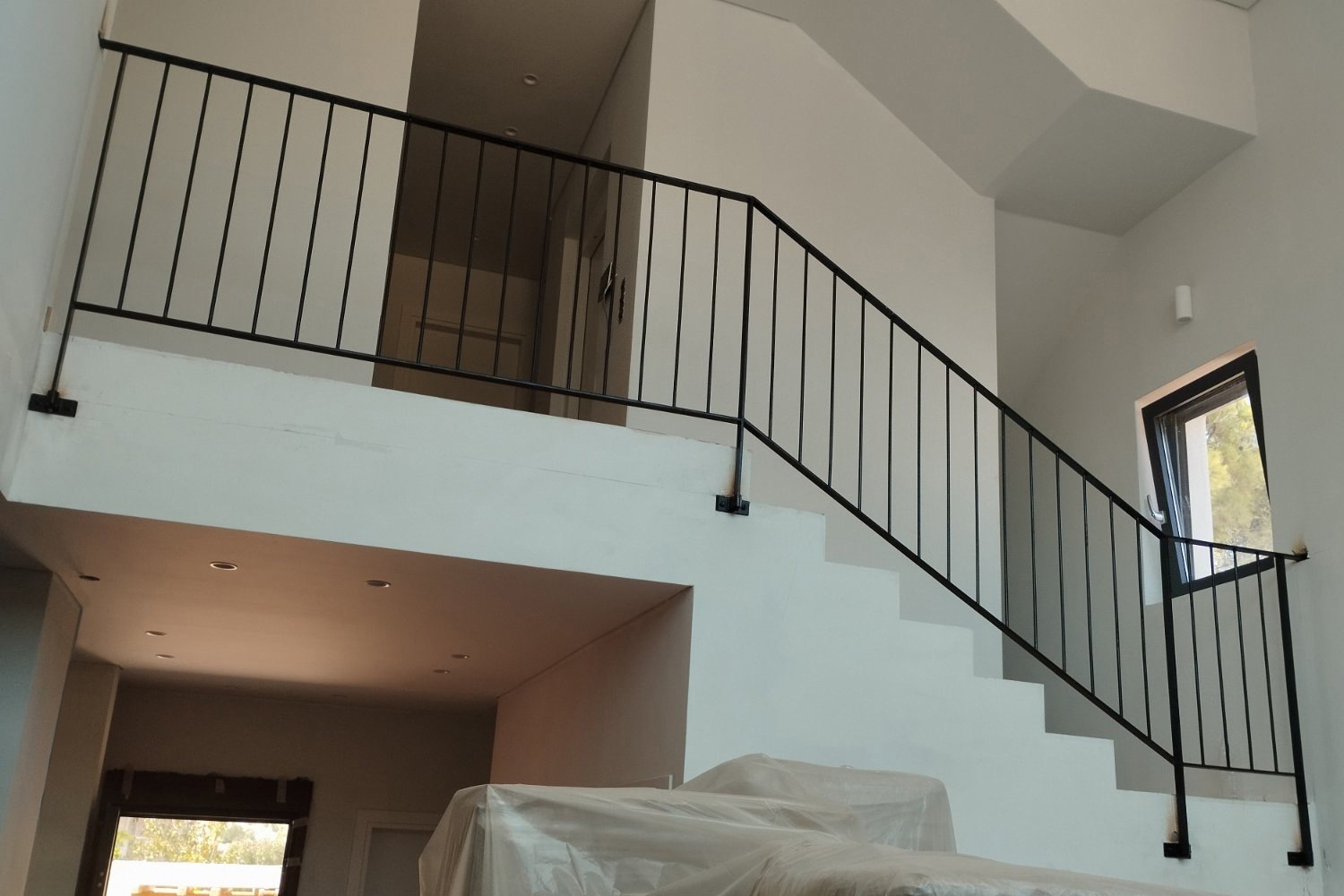 Μεταλλικά κάγκελα εσωτερικής σκάλας μεζονέτας και μπαλκονιών, με λιτές διαχρονικές γραμμές και ηλεκτροστατική βαφή. Η απλότητα στην καλύτερή της έκδοση