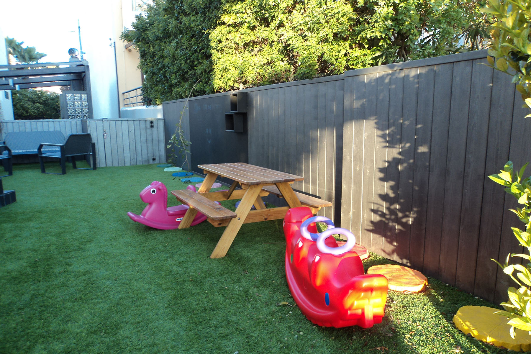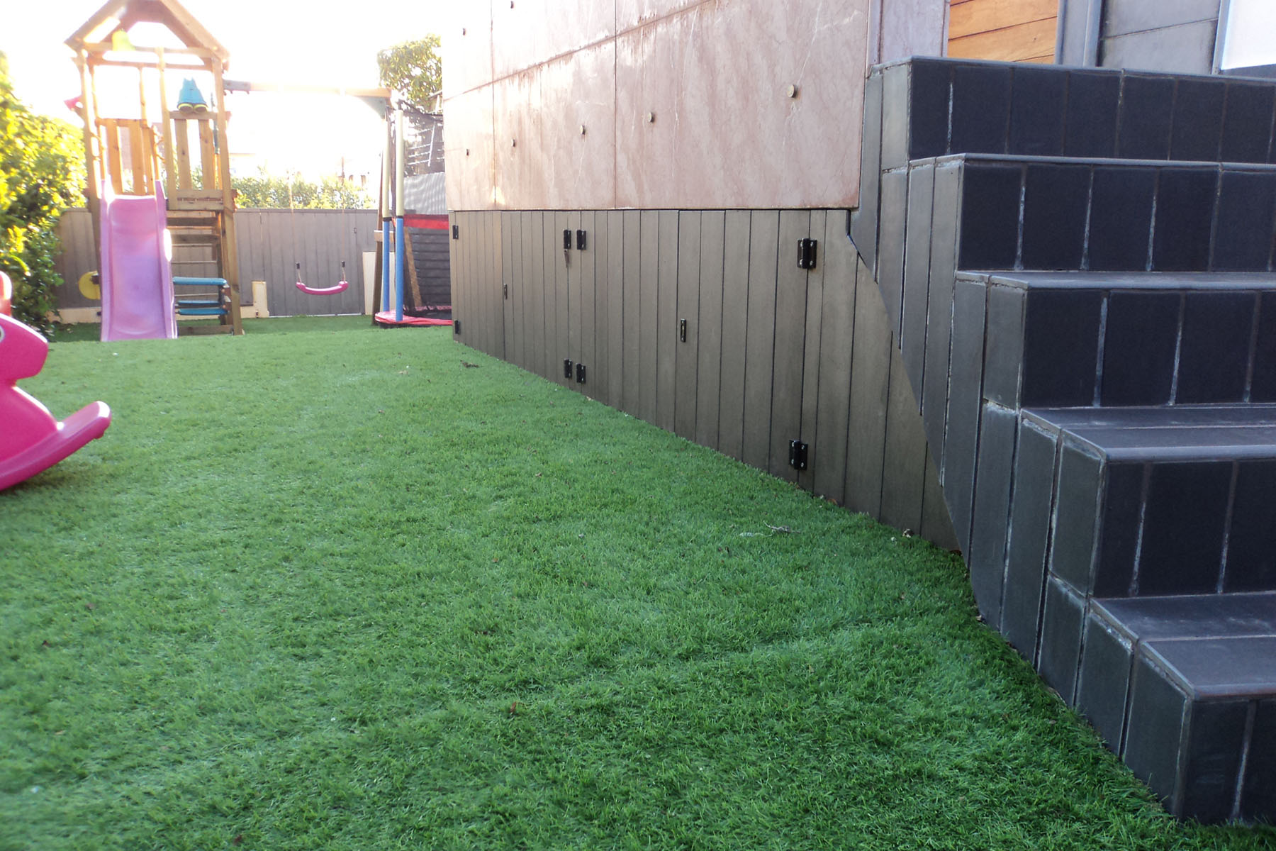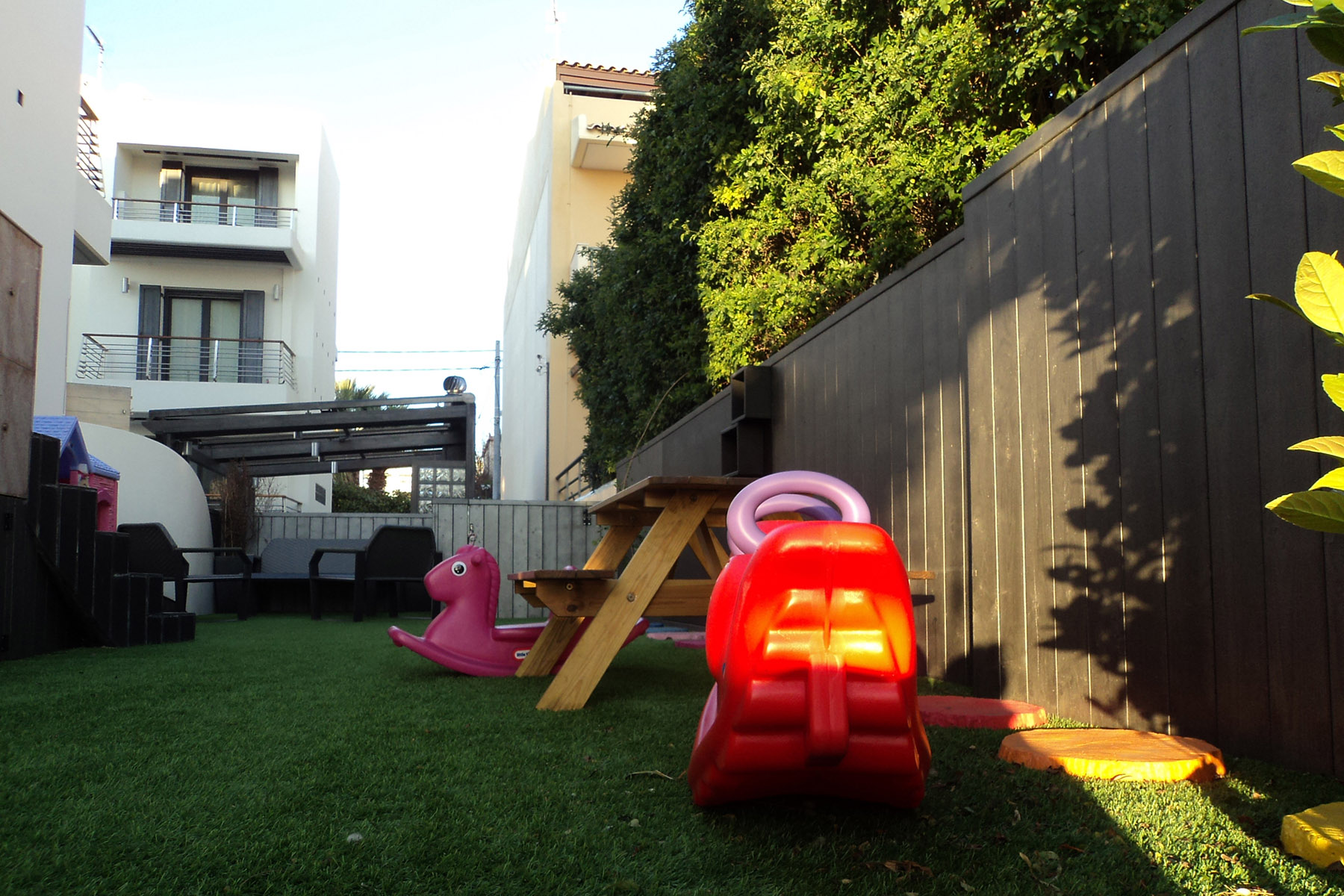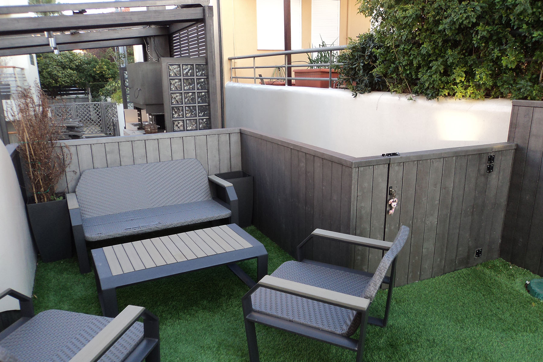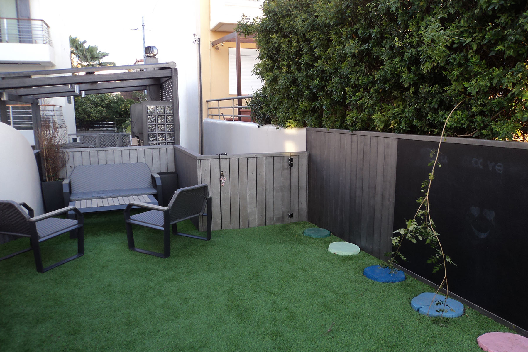Διαμόρφωση περιβάλλοντα χώρου στη Γλυφάδα με κατασκευή deck και τοποθέτηση συνθετικού γκαζόν, περίφραξη από ξυλεία πεύκης, επενδύσεις τοίχου και πορτάκια σε διάφορα σημεία και κάγκελο εξωτερικής σκάλας.